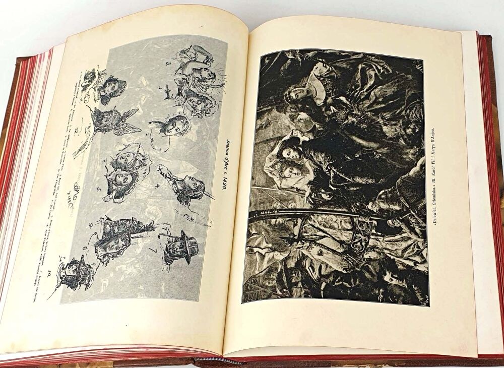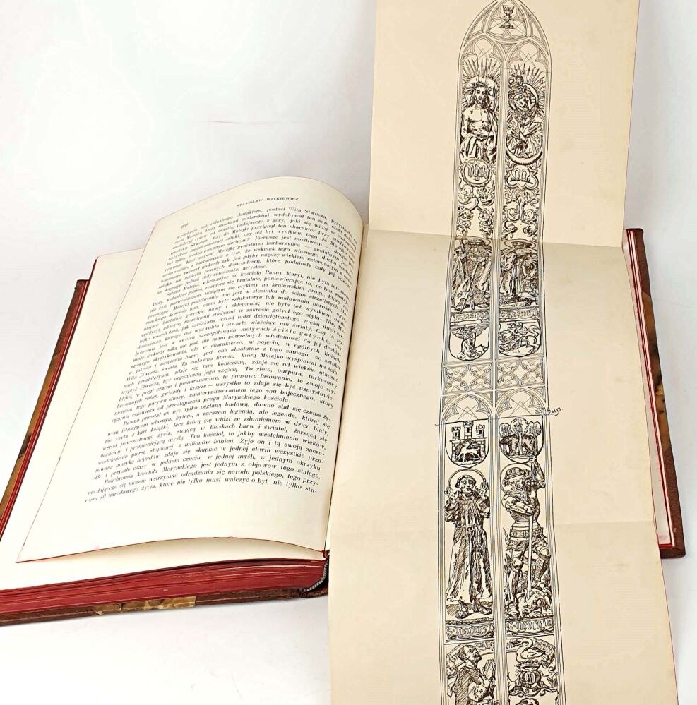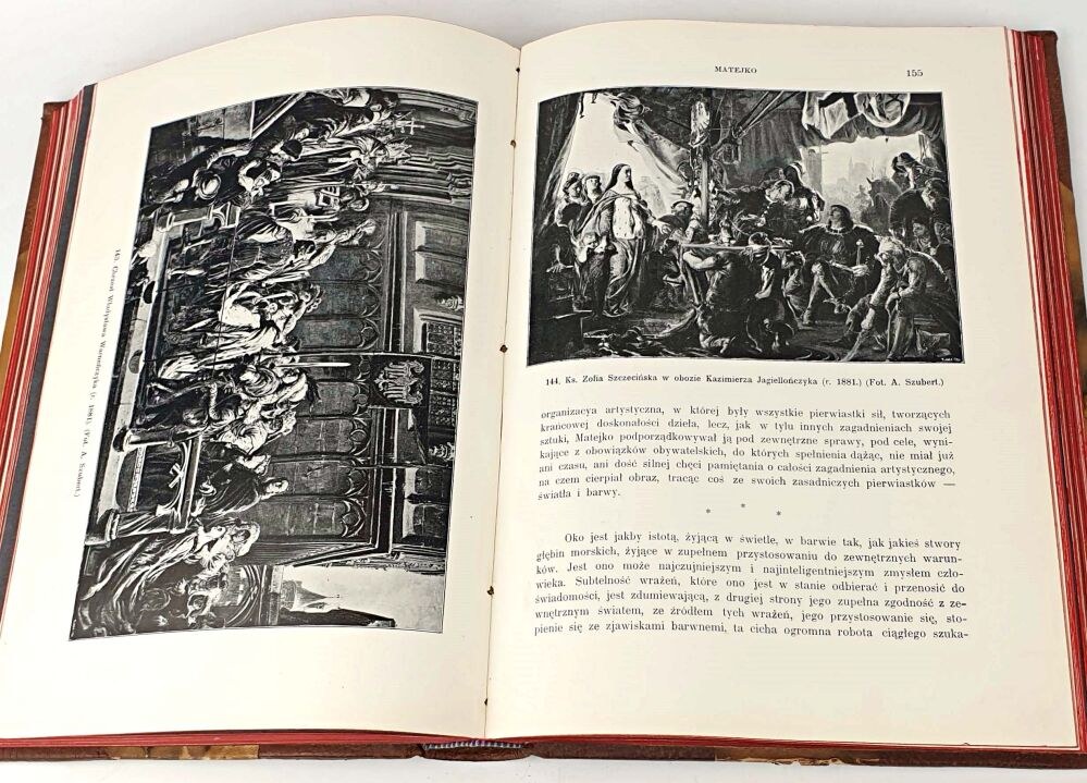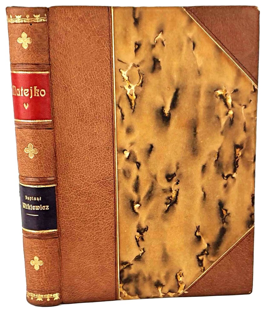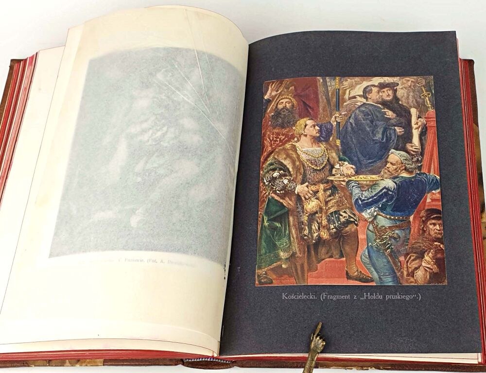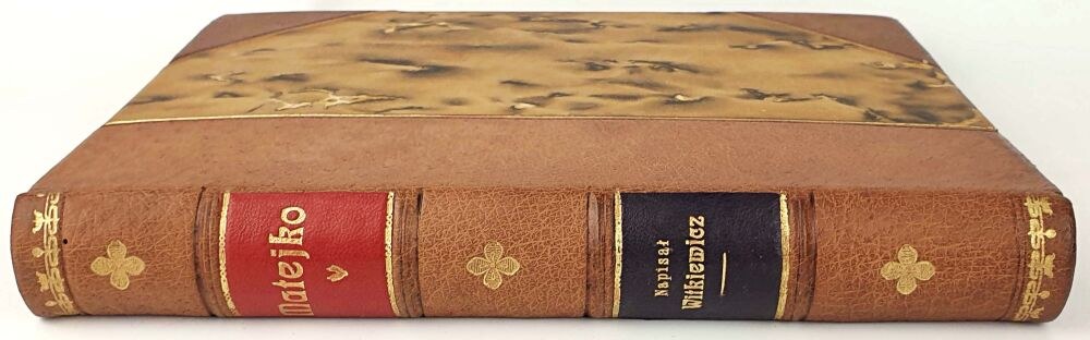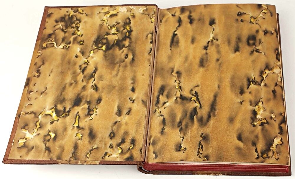 TWARDA OPRAWA LUKSUSOWY PÓŁSKÓREK Z EPOKI. NA GRZBIECIE WYPUKŁE ZWIĘZY, TŁOCZENIA, SZYLDZIKI I ZŁOCENIA. KARTON MARMORYZOWANY. OBCIĘCIA KART BARWIONE. WYKLEJKI OZDOBNE.