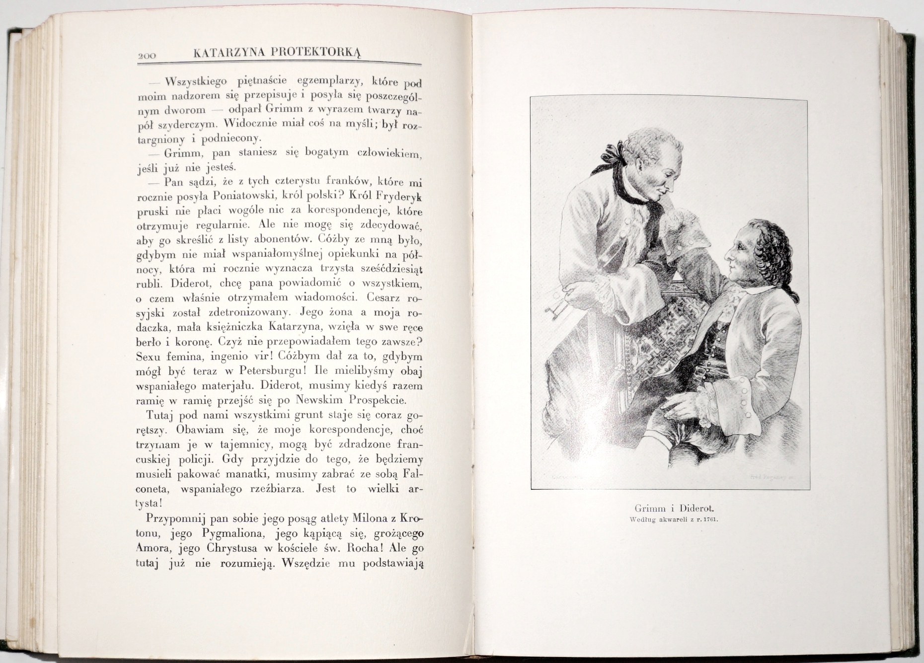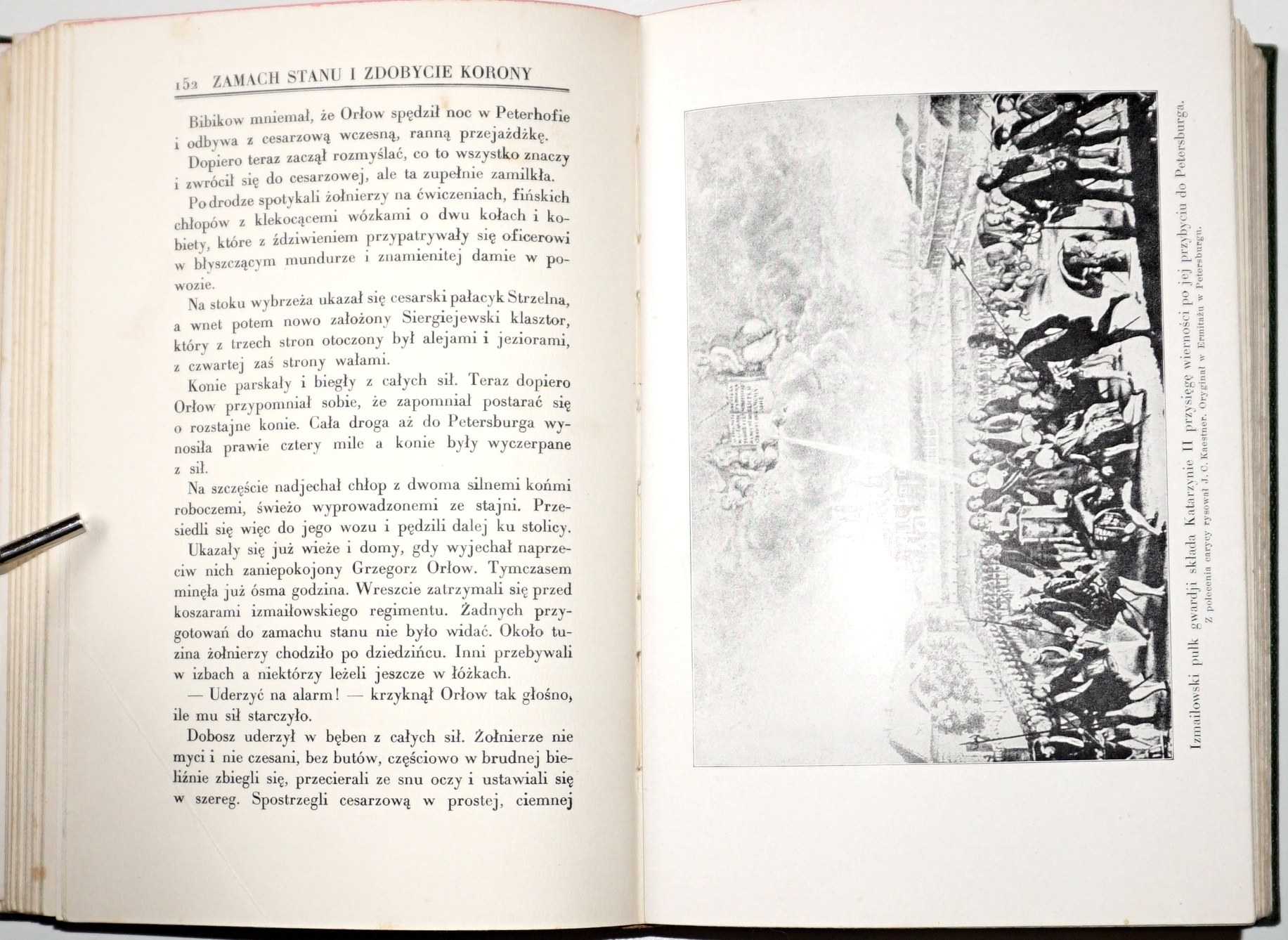Z przedmowy: "O żadnej kobiecie zapewne sądy współczesnych nie były tak rozbieżne i sprzeczne ze sobą jak o Katarzynie II, carycy rosyjskiej, która zasiadała na tronie carów od r. 1762 do 1796, a więc przeszło lat 33. Gdy jedni wznosili ją pod niebo i nie mieli dość słów uznania i podziwu dla Katarzyny Wielkiej, inni nazywali ją potworem w ludzkiem ciele i nierządnicą na tronie". Zaw. m.in.: Marzenia księżniczki. Ważne postanowienie, Na drodze do ziszczenia marzeń. Duch Piotra Wielkiego, Wychowanie Wielkiej Księżny, Zamach stanu i zdobycie korony, Mord dla utrwalenia tronu, Katarzyna protektorką nauki i sztuki, Pożegnanie Diderota z Katarzyną, Teatr i Ermitaż, We więzach zmysłowości. Dołączono wykonany odręcznie na kartce papieru w kratkę "Wykaz faworytów Katarzyny II chronologicznym porządku".