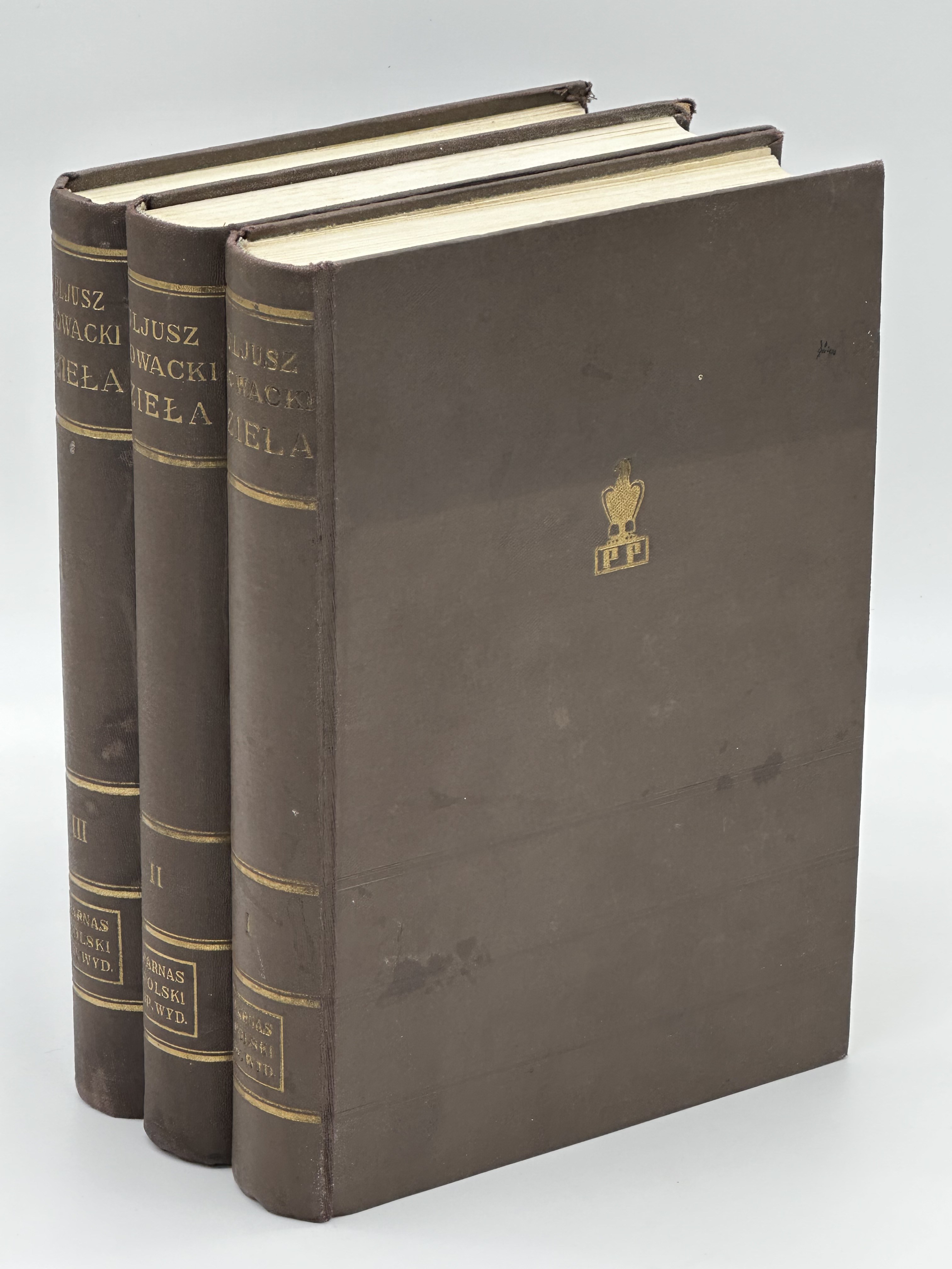 Warszawa 1933/ Parnas Polski [druk: Kraków, W. L. Anczyc]/ seria: Bibljoteka Poetów Polskich/ oprawa wydawnicza, brązowe płótno zdobione/ s.XLVIII, 488, 489, [2], 440, [1]/ portrety na frontyspisach, ilustracje w tekście, rozkładane tablice/ stan dobry, przebarwienia opraw, zwłaszcza tomu trzeciego, miejscami w tekście zażółcenia