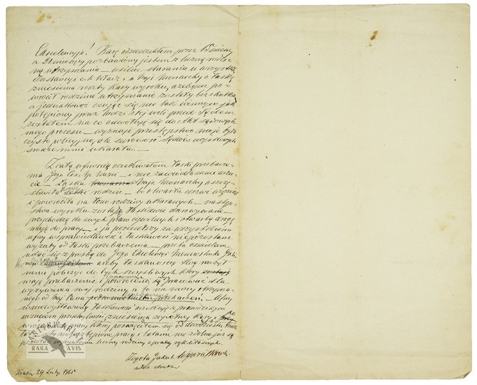 Rękopis dwustronny na ark. 34x21 cm, druga karta czysta. List zawiera prośbę o złagodzenie zasądzonej kary i zezwolenie na powrót do pracy zawodowej (prowadzenia drukarni), co umożliwi autorowi listu utrzymanie licznej rodziny. List rozpoczyna krótki wstęp dotyczący ostatnich wydarzeń: "Znane są powszechnie wypadki w Królestwie Polskiem w r. 1863, w których niemasz Polaka ażeby niemiał chociaż małego udziału [...]. Niestety! Opatrzność czuwająca nad losami ludów Świata nie uwzględniła jeszcze narodu polskiego - boleśnie runęło wszystko - i ci, którzy pokładali nadzieje i pomagali usiłowaniom braci - powołani zostali prawem do odpowiedzialności za swój udział w pomocy". Z listu wynika, że podobny los spotkał Wywiałkowskiego, właściciela krakowskiej drukarni. Wyrokiem c. k. sądu wojskowego został skazany, po 7 miesiącach śledztwa, na 8 miesięcy ciężkiego więzienia. Karę odbył w całości, jednak pozostał zakaz pracy w drukarni, jako że wyrok wymierzono "za niesienie pomocy powstańcom w Król. Polskiem przez rozszerzanie druków". Swą prośbę o złagodzenie kary motywuje tym, że od 21 miesięcy pozostaje z rodziną bez źródła utrzymania, a składane w tej sprawie podania nie przyniosły pozytywnych skutków. W tekście wymienione jest nazwisko namiestnika von Paumgartena, które przekreślono i dopisano ołówkiem nazwisko jego następcy Gołuchowskiego. Niewielkie zaplamienie, załamania arkusza, niewielkie naddarcie dolnego narożnika.
