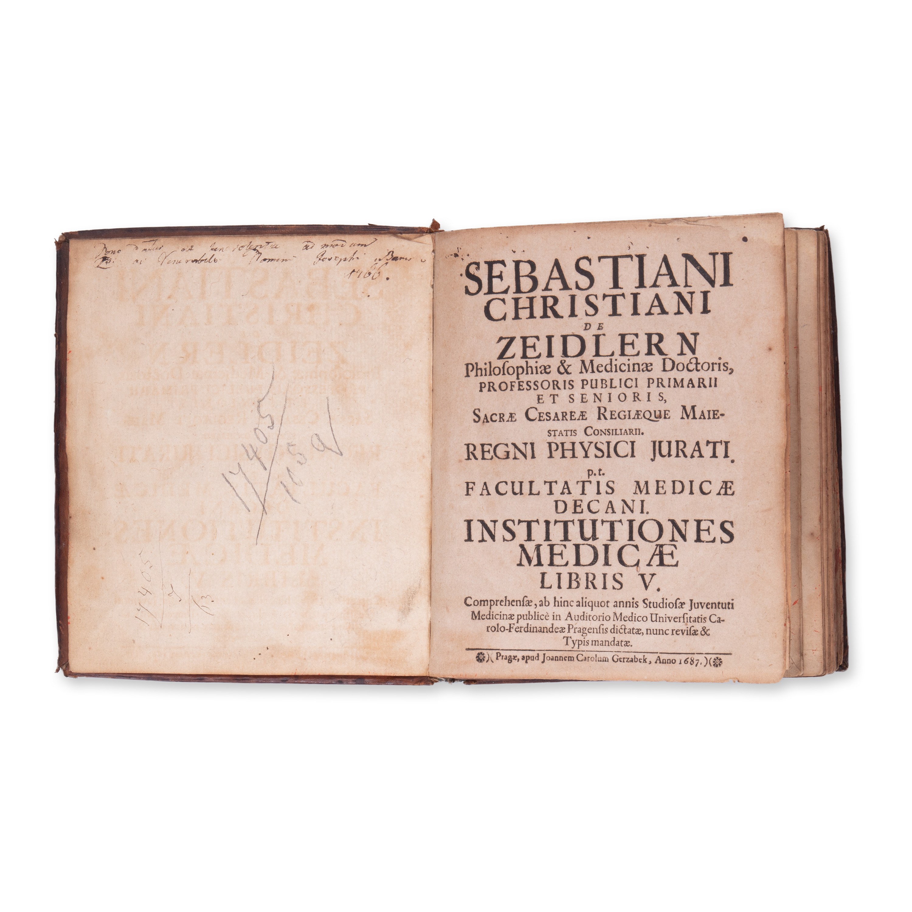 1687 | FULL ITEM TITLE: SEBASTIANI CHRISTIANI DE ZEIDLERN Philosophiae & Medicinae Doctoris, PROFESSORIS PUBLICI PRIMARII ET SENIORIS, SACRAE CESAREAE REGIAEQUE MAIESTATIS CONSILIARII. REGNI PHYSICI JURATI p. t. FACULTATIS MEDICAE DECANI. INSTITVTIONES MEDICAE LIBRIS V.: Comprehensae, ab hinc aliquot annis Studiosae Juventuti Medicinae publice in Auditorio Medico Universitatis Carolo-Ferdinandeae Pragensis dictatae, nunc revisae & Typis mandatae | PUBLISHER: Pragae, Joannem Carolum Gerzabek | NUMBER OF PAGES: 291 + index | LANGUAGE: Latin | DIMENSIONS: 183 x 151 mm