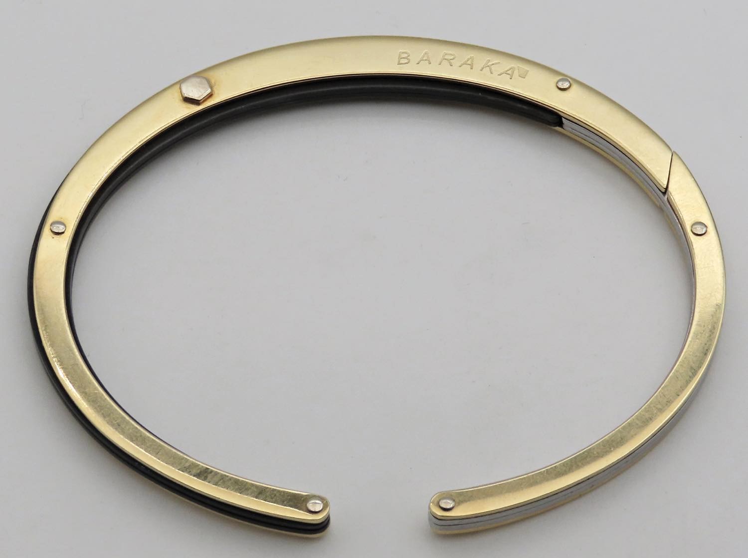 Bracciale rigido in oro giallo e materiali vari, firmato BARAKA', peso totale gr.39,90. gr.39,90