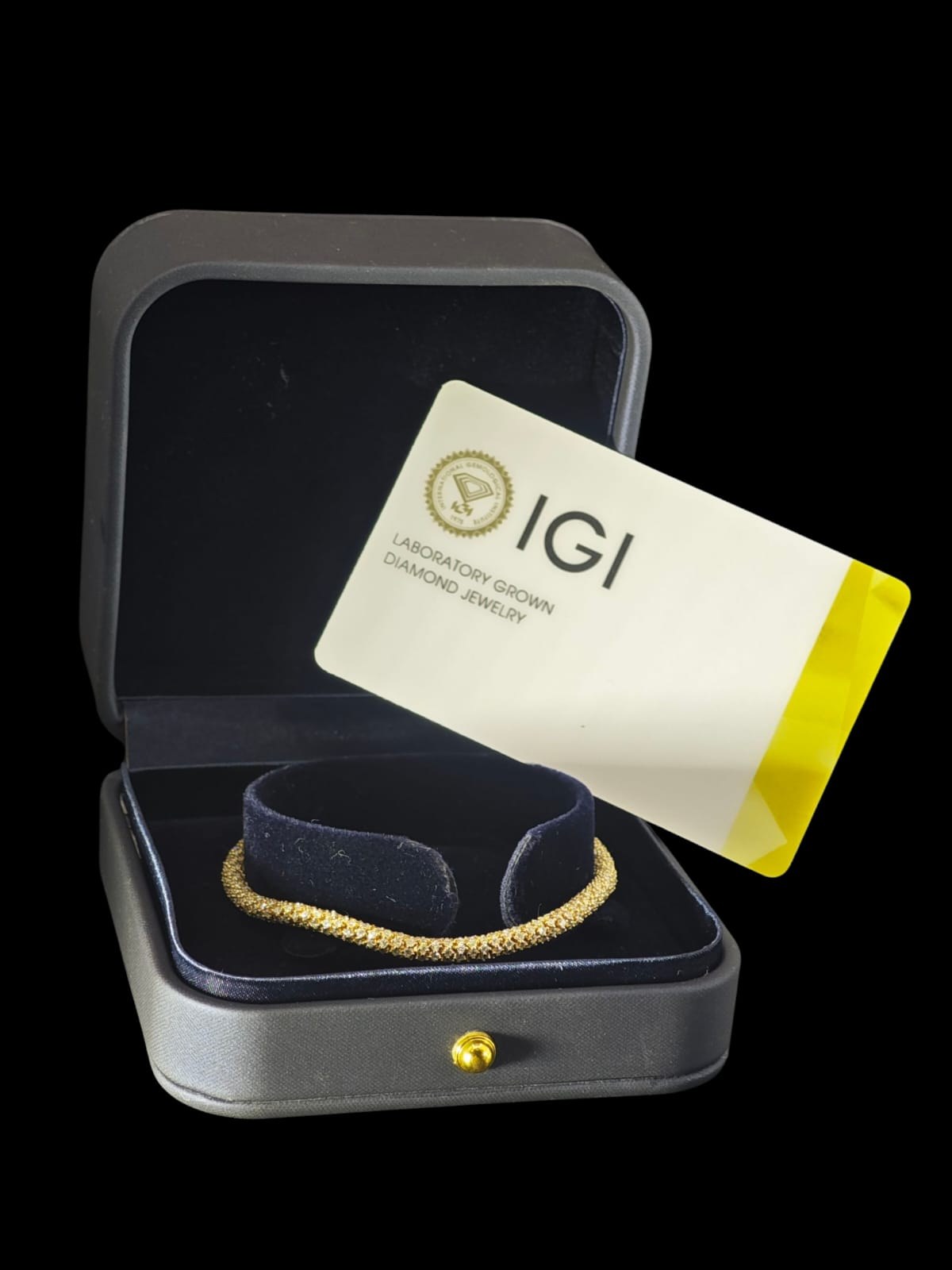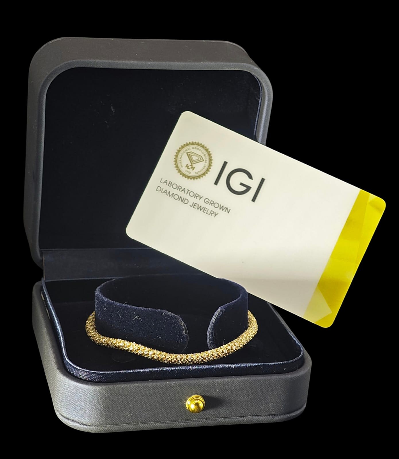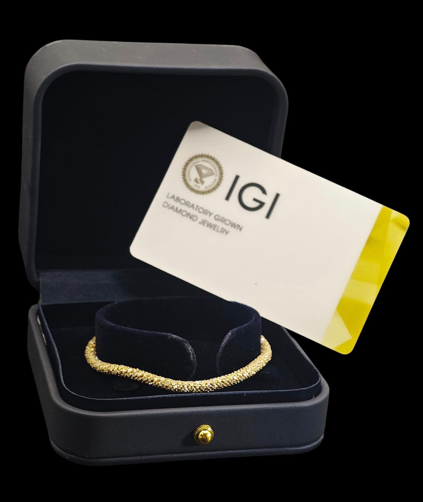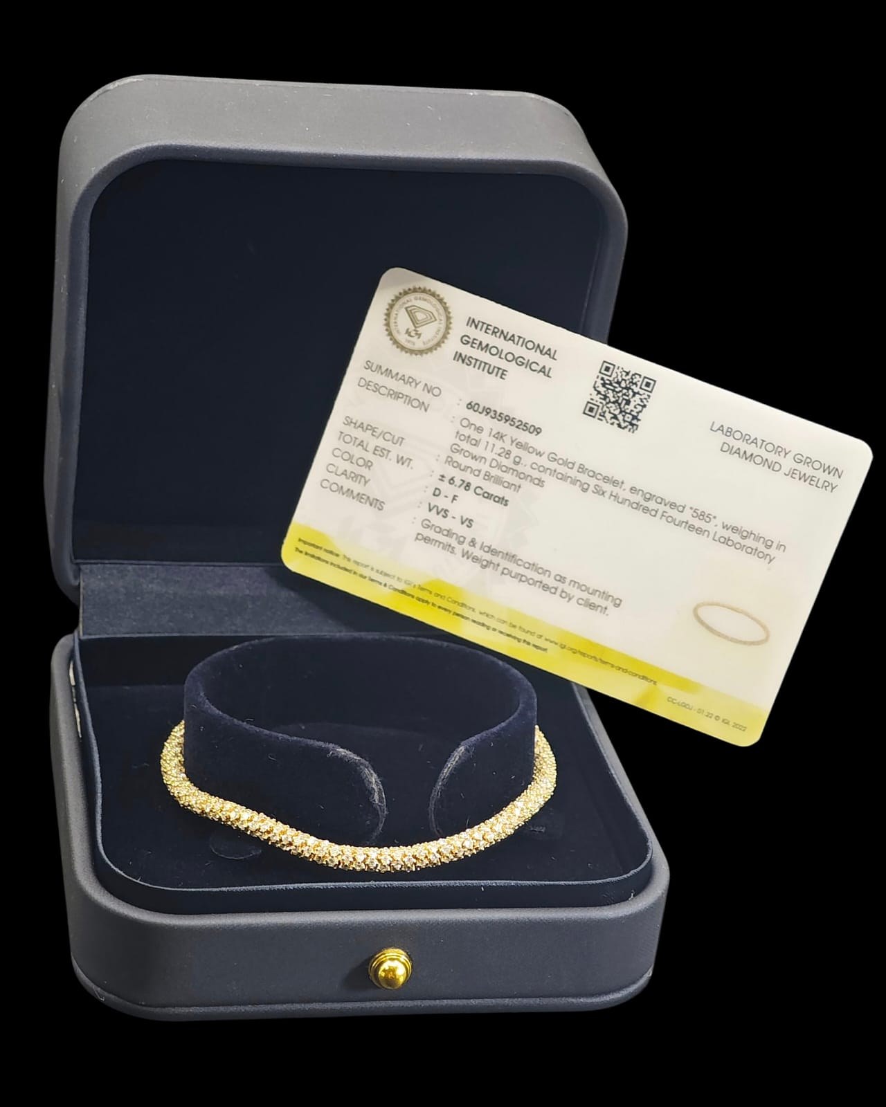 AN IGI-CERTIFIED 14K YELLOW GOLD BRACELET FEATURING A FLEXIBLE DESIGN FULLY SET WITH 614 ROUND BRILLIANT-CUT LAB-GROWN DIAMONDS, WITH AN ESTIMATED TOTAL WEIGHT OF 6.78 CARATS. THE DIAMONDS ARE D-F IN COLOR E VVS-VS IN CLARITY. THE BRACELET CLOSES WITH A BOX CLASP, CLEARLY MARKED "585," AND INCLUDES TWO SAFETY CLASPS. LENGTH: APPROXIMATELY 18.5 CM WEIGHT: 11.28 GRAMS - AUCTION GRADE 25%