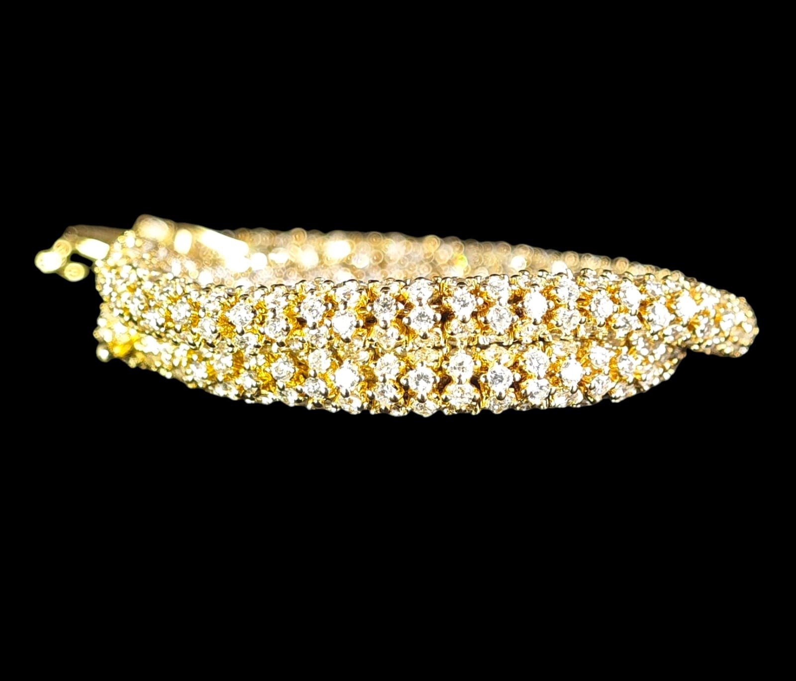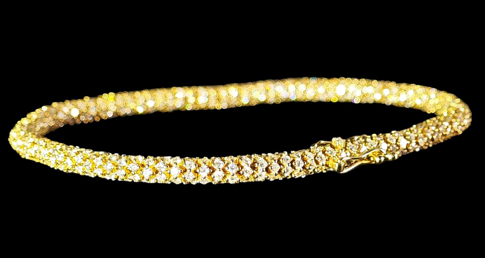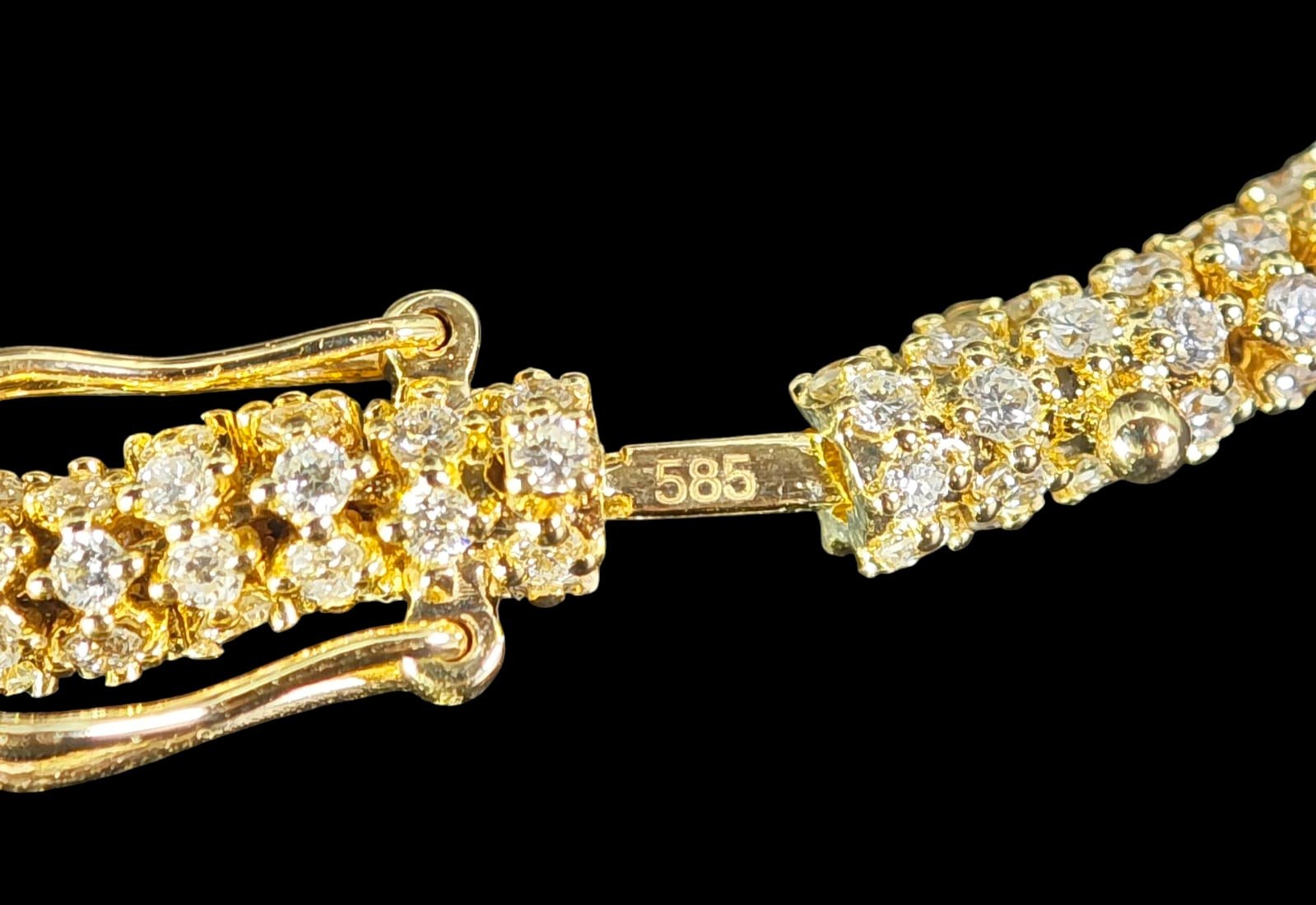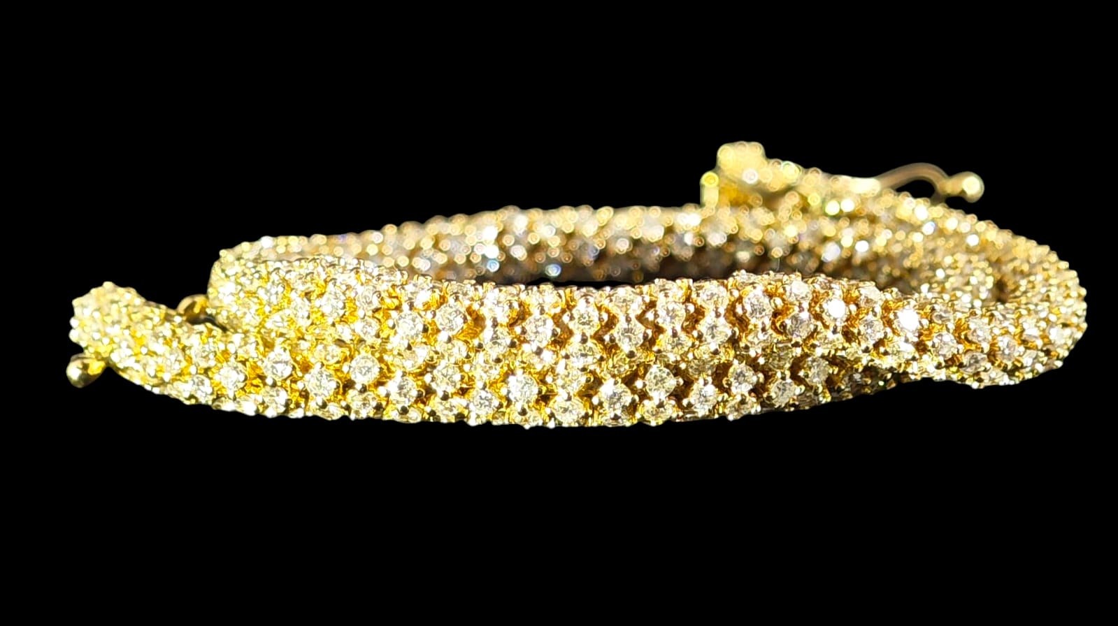 AN IGI-CERTIFIED 14K YELLOW GOLD BRACELET FEATURING A FLEXIBLE DESIGN FULLY SET WITH 614 ROUND BRILLIANT-CUT LAB-GROWN DIAMONDS, WITH AN ESTIMATED TOTAL WEIGHT OF 6.78 CARATS. THE DIAMONDS ARE D-F IN COLOR E VVS-VS IN CLARITY. THE BRACELET CLOSES WITH A BOX CLASP, CLEARLY MARKED "585," AND INCLUDES TWO SAFETY CLASPS. LENGTH: APPROXIMATELY 18.5 CM WEIGHT: 11.28 GRAMS - AUCTION GRADE 25%