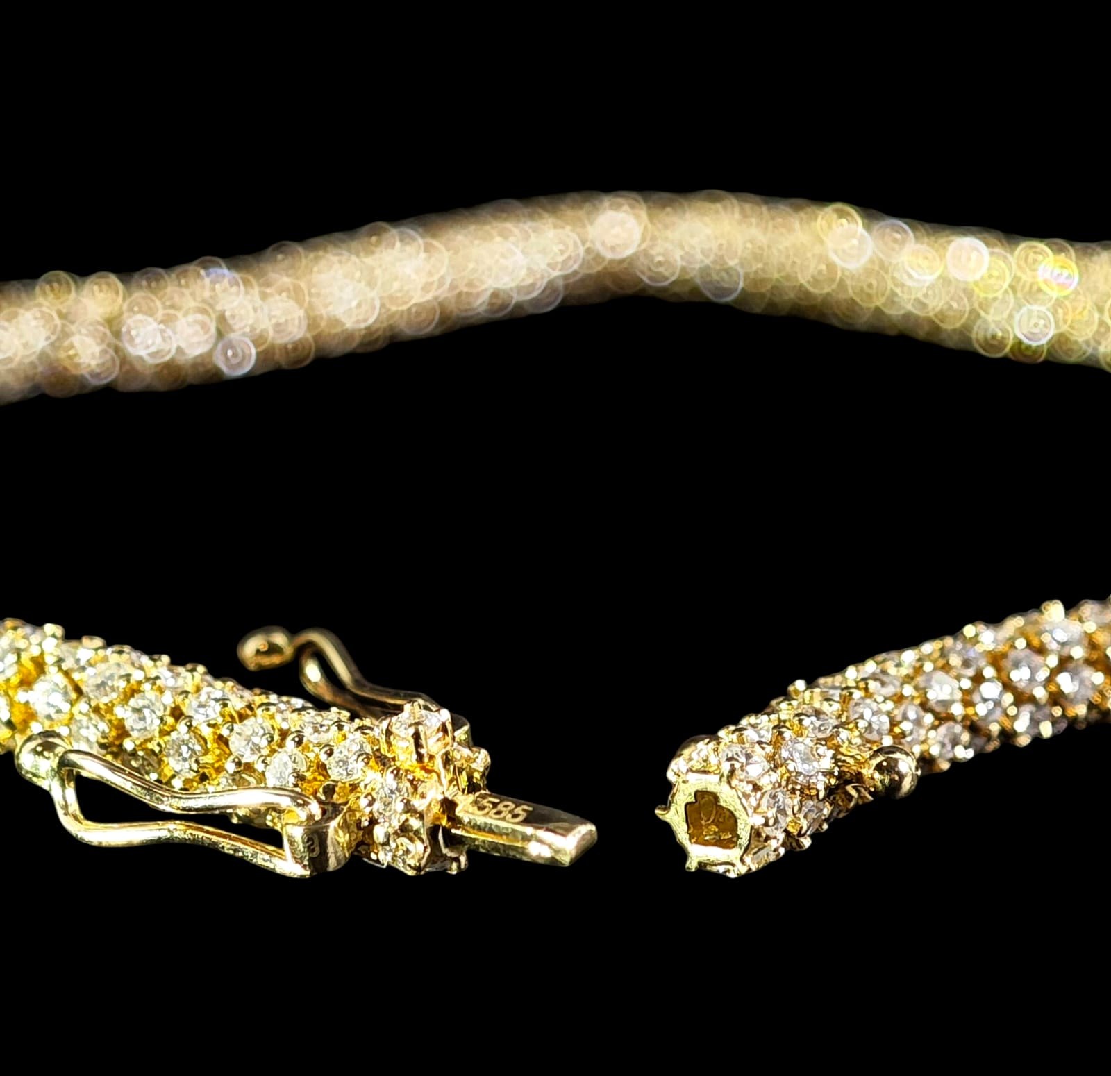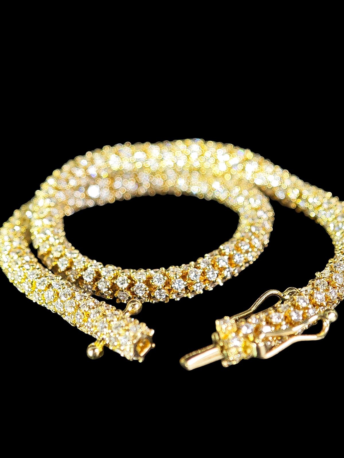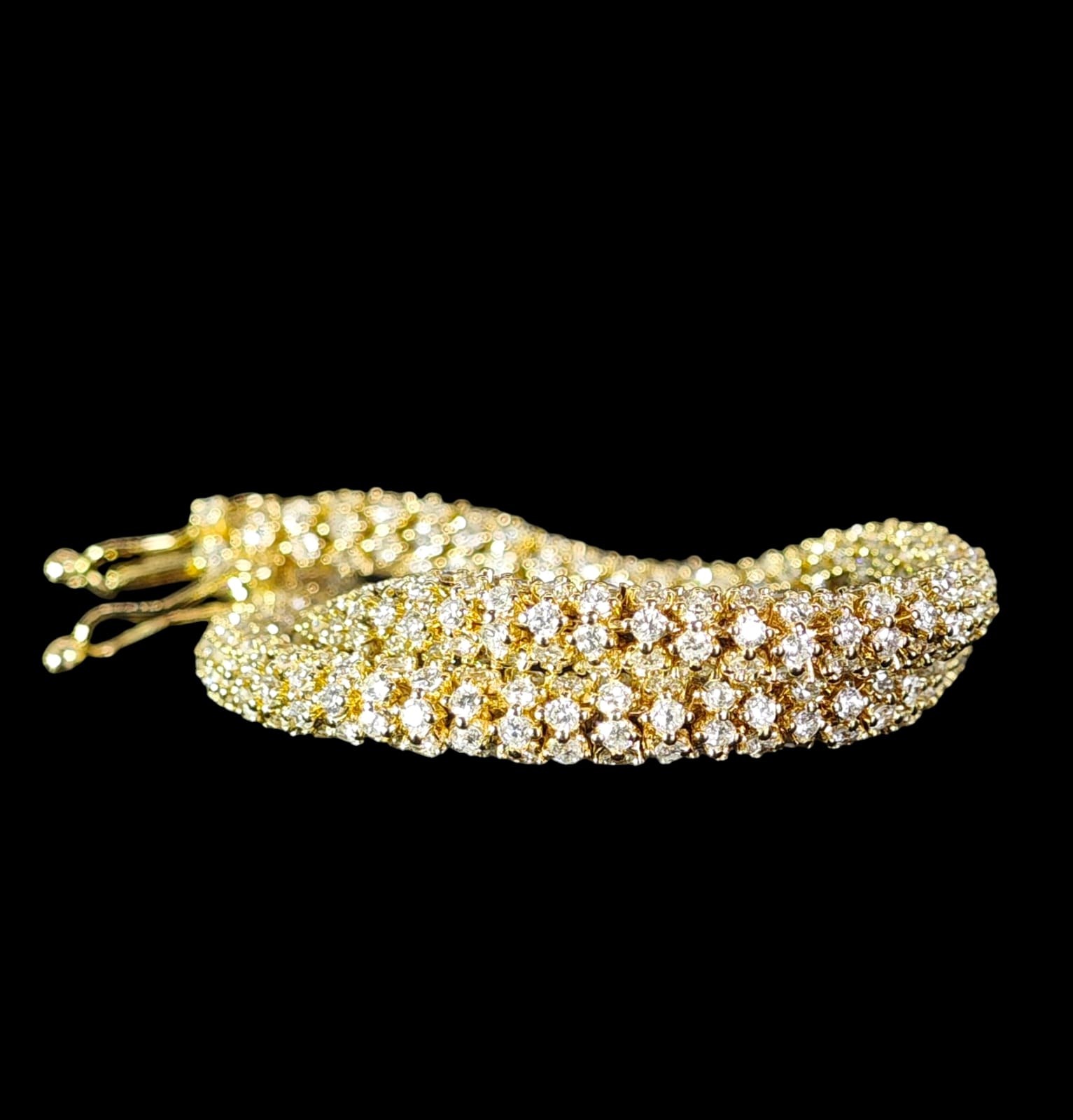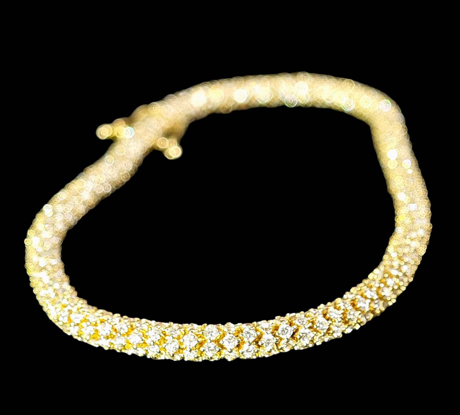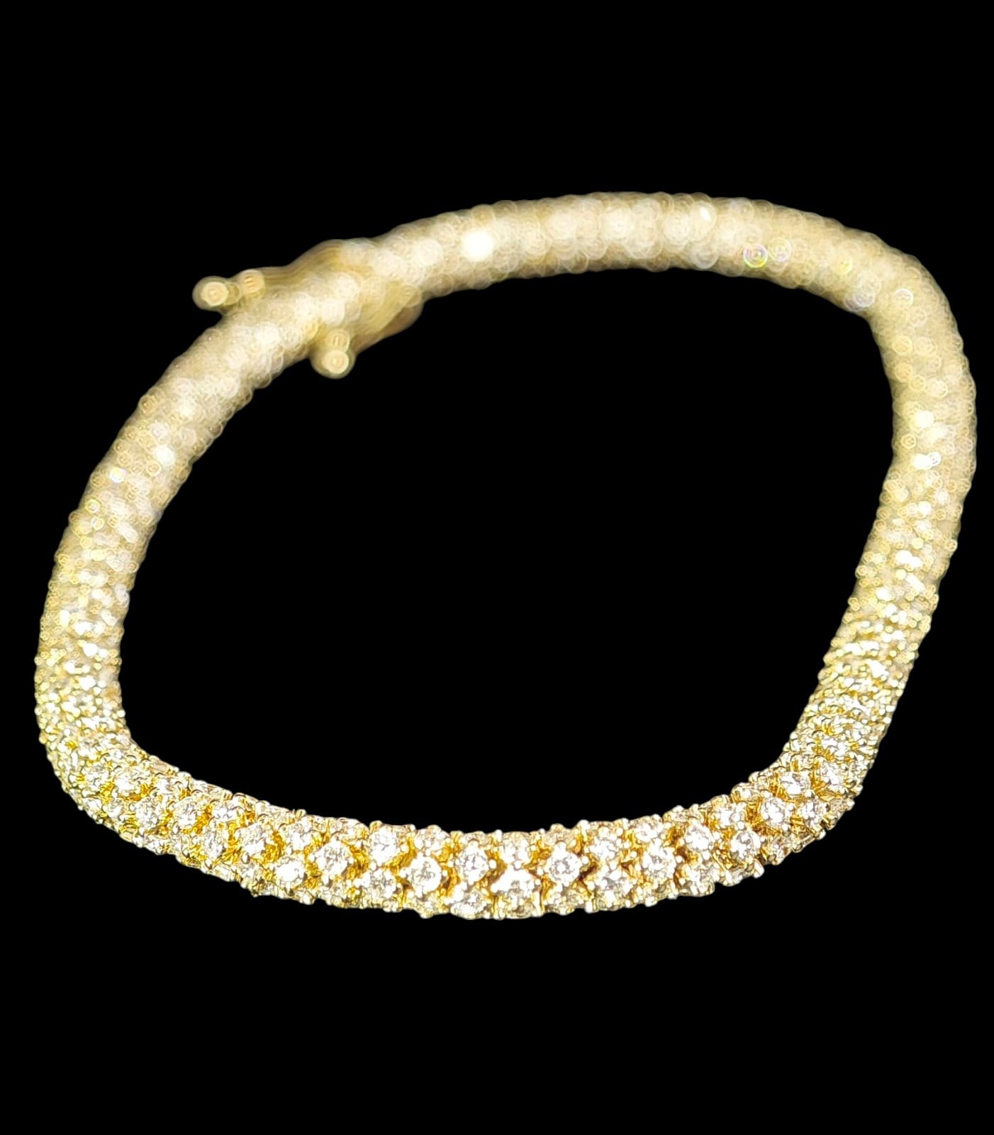 AN IGI-CERTIFIED 14K YELLOW GOLD BRACELET FEATURING A FLEXIBLE DESIGN FULLY SET WITH 614 ROUND BRILLIANT-CUT LAB-GROWN DIAMONDS, WITH AN ESTIMATED TOTAL WEIGHT OF 6.78 CARATS. THE DIAMONDS ARE D-F IN COLOR E VVS-VS IN CLARITY. THE BRACELET CLOSES WITH A BOX CLASP, CLEARLY MARKED "585," AND INCLUDES TWO SAFETY CLASPS. LENGTH: APPROXIMATELY 18.5 CM WEIGHT: 11.28 GRAMS - AUCTION GRADE 25%