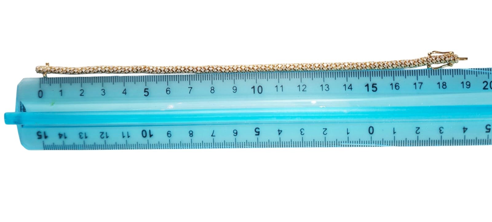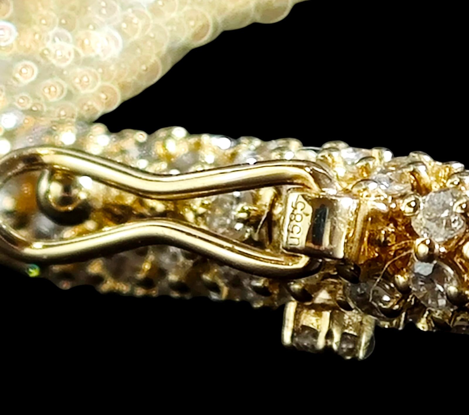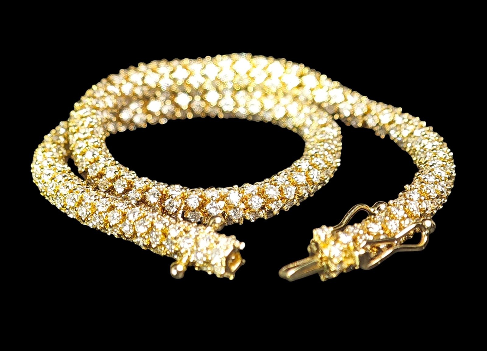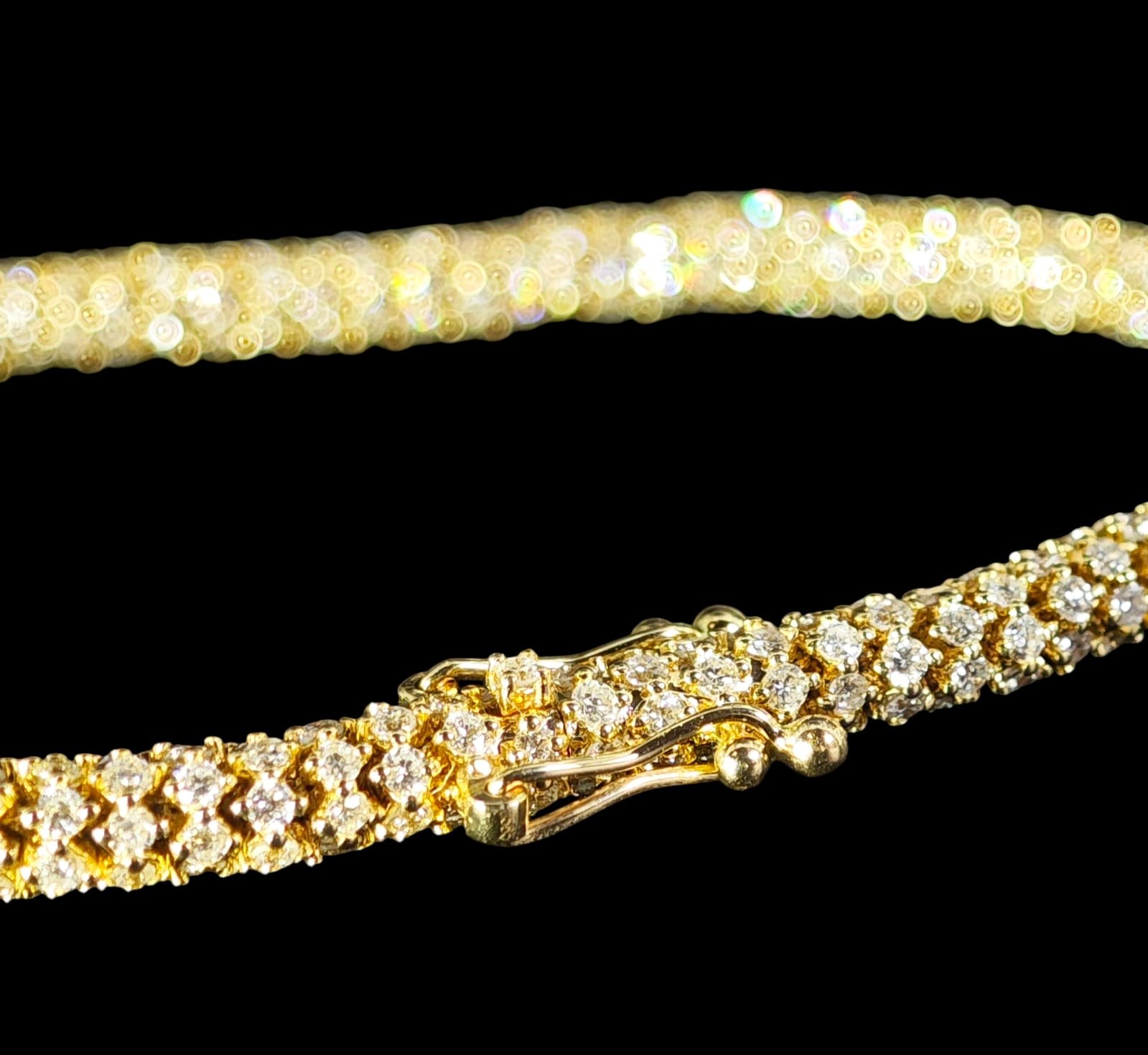 AN IGI-CERTIFIED 14K YELLOW GOLD BRACELET FEATURING A FLEXIBLE DESIGN FULLY SET WITH 614 ROUND BRILLIANT-CUT LAB-GROWN DIAMONDS, WITH AN ESTIMATED TOTAL WEIGHT OF 6.78 CARATS. THE DIAMONDS ARE D-F IN COLOR E VVS-VS IN CLARITY. THE BRACELET CLOSES WITH A BOX CLASP, CLEARLY MARKED "585," AND INCLUDES TWO SAFETY CLASPS. LENGTH: APPROXIMATELY 18.5 CM WEIGHT: 11.28 GRAMS - AUCTION GRADE 25%