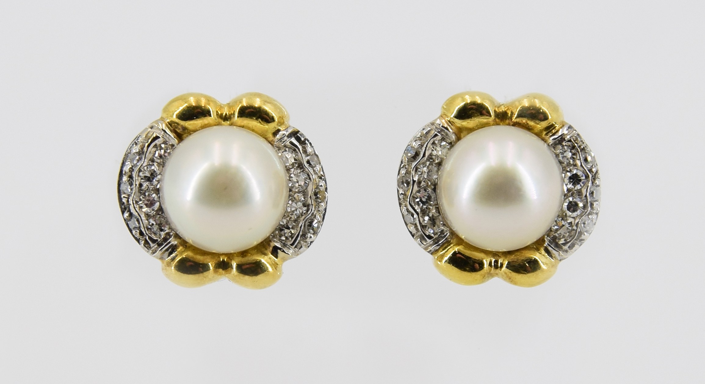 kompozycje z 2 szt. pereł o śr. 7.60-7.70 mm w otoczeniu 28 szt. diamentów w szlifie 8/8 o masie łącznej ok. 0.30 ct (Vs-Si/F-G),