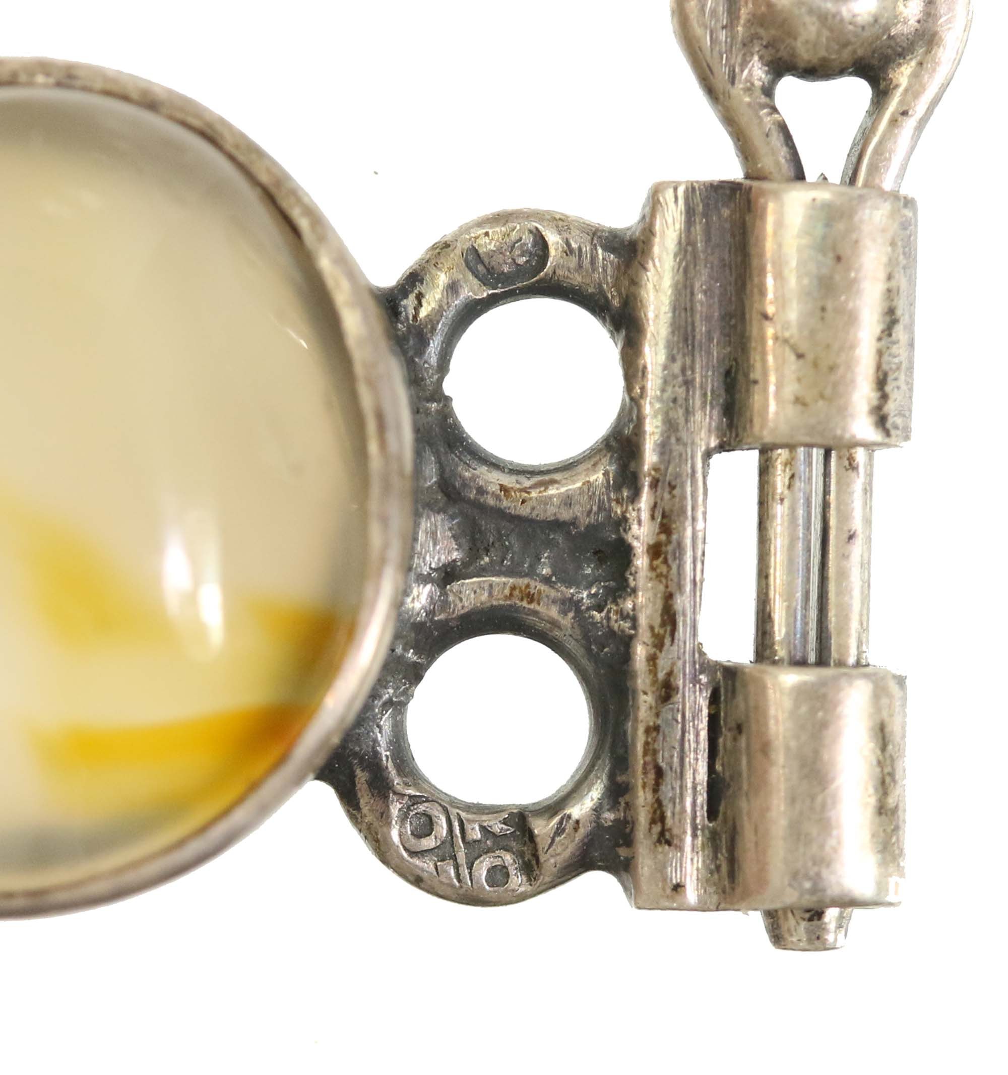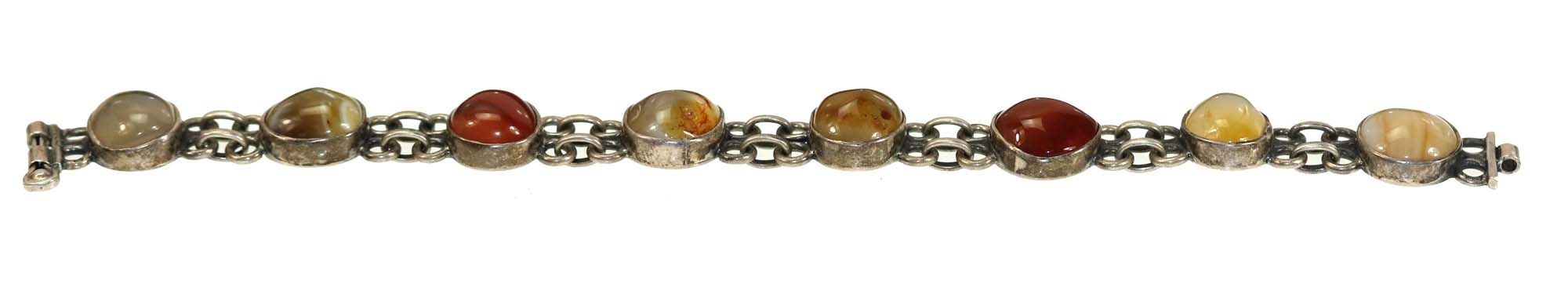 Bransoleta z agatami, ORNO. Srebro, widoczna sygnatura wytwórcy oraz warszawska próba srebra "800" po 1985 r. Długość bransolety 18,5 cm. Wym. pojedynczego segmentu ok. 13 x 22 mm. Waga 26,8 g.