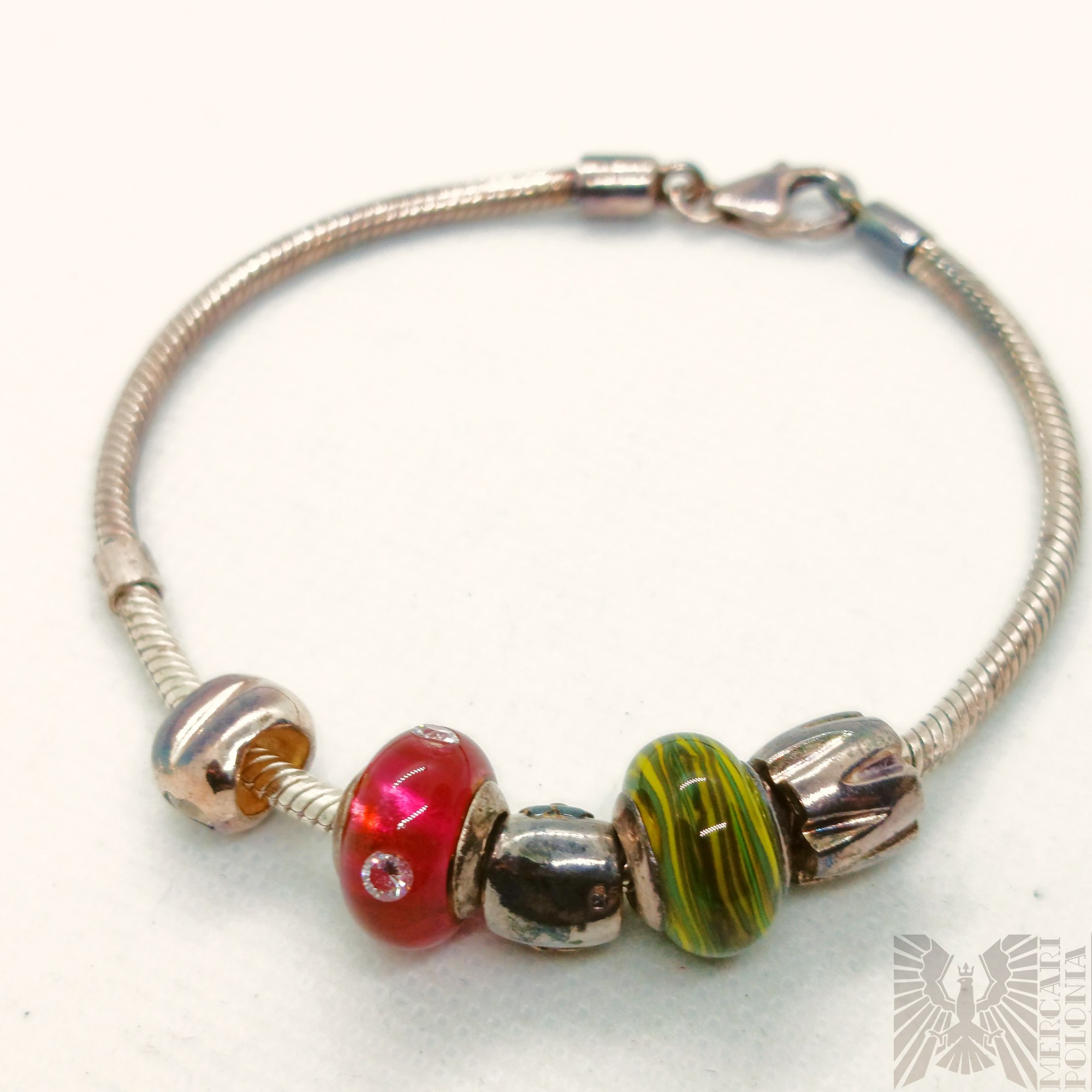 Srebrna bransoletka typu Pandora z charmsami - srebro 925, masa wyrobu 28,43 gram, długość około 21 cm, 5 charmsów