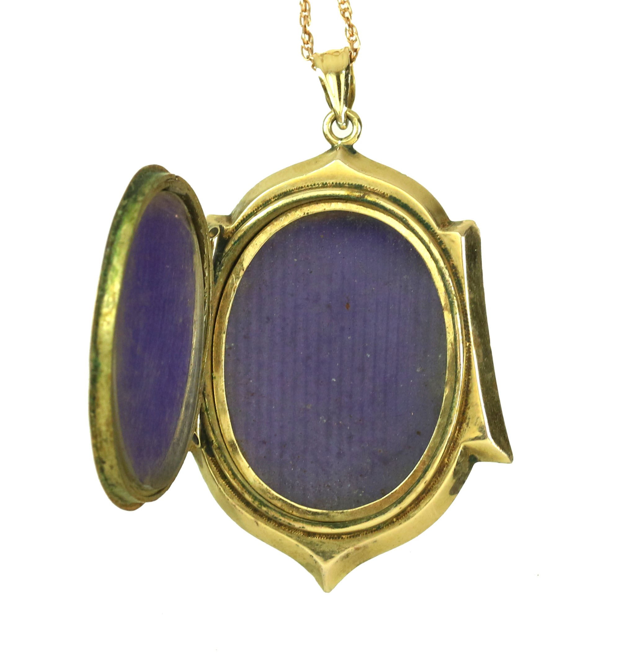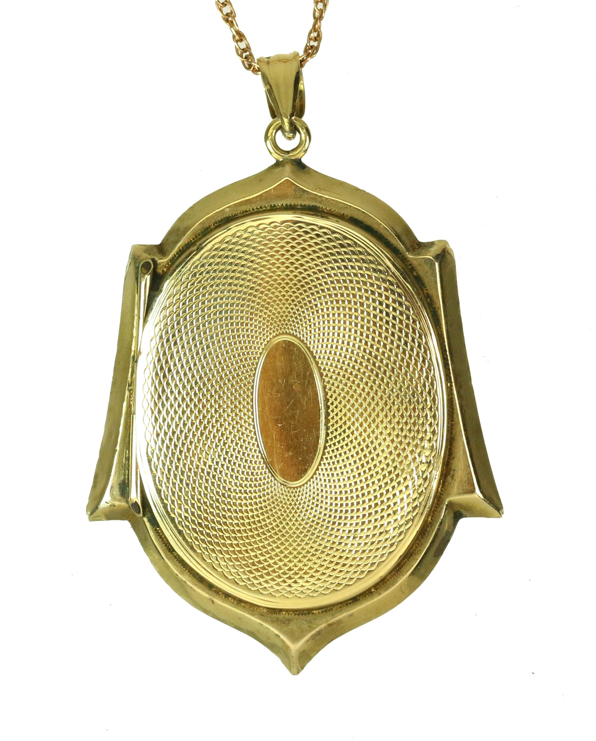 Antyk jubilerski w formie wisiora z funkcją sekretnika. Wykonany ręcznie we Francji w latach 1890/1900. Centralnie umieszczony element ceramiczny z motywem roślinnym na tle grawerowanej kompozycji jubilerskiej z udziałem emalii. Misterne, ręczne grawerowanie motywu roślinnego, zdobiącego powierzchnię wyrobu.