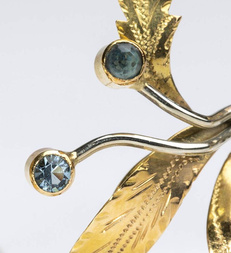 yellow gold 18k, plants and ribbons swirl highlighted by with punctuations in glass paste.