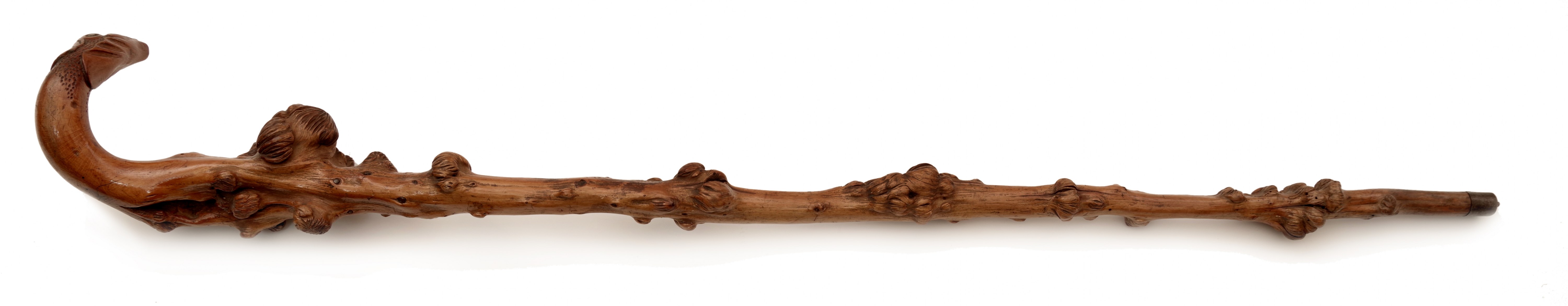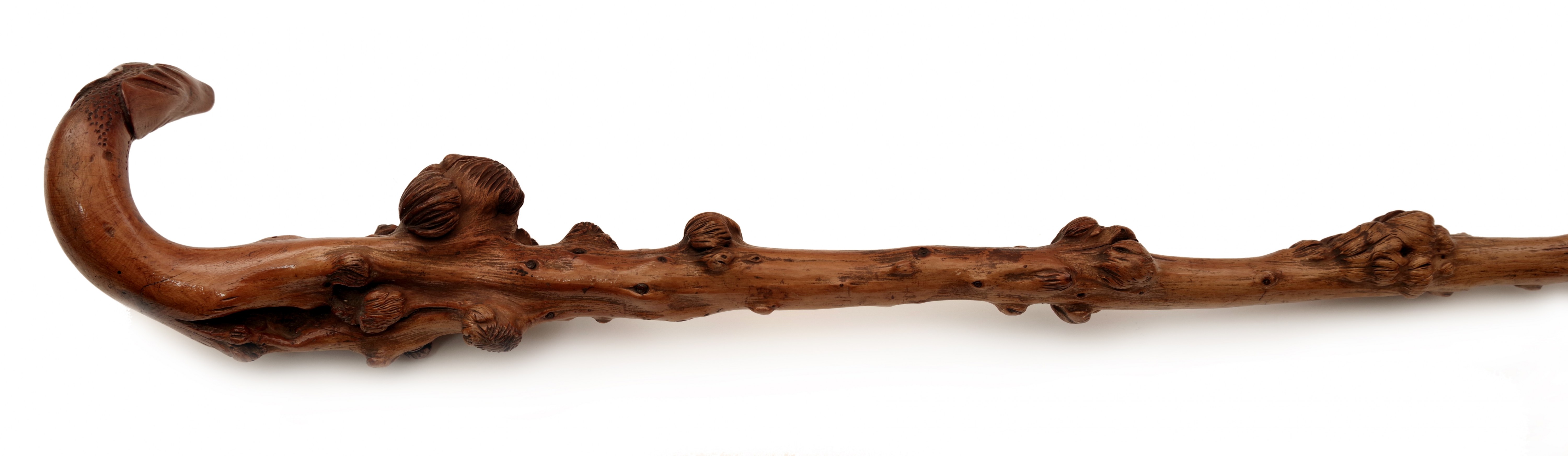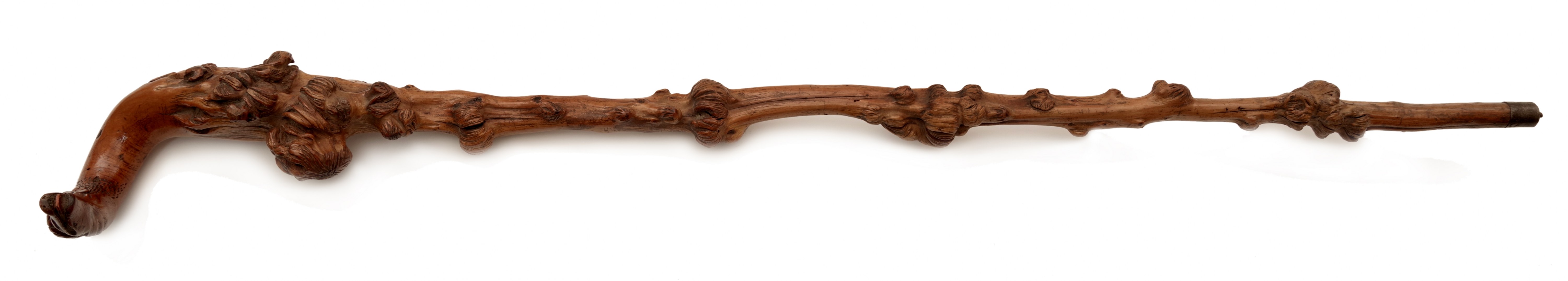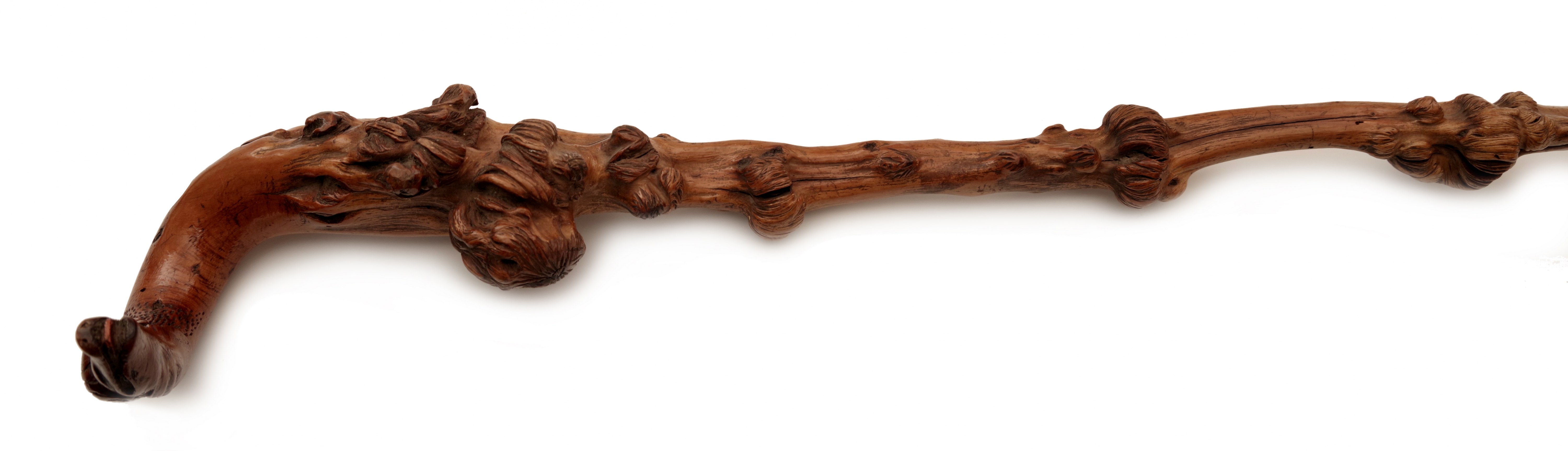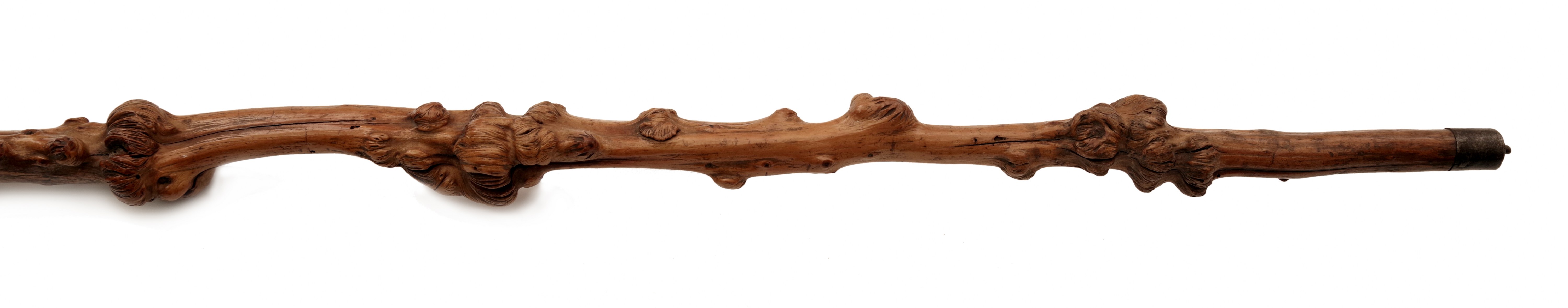 Špacírka vyřezávaná ze samorostu, rukojeť s hlavou příšery, okovaný konec s bodcem. Konec 19. století, výška 86 cm. Stav 2