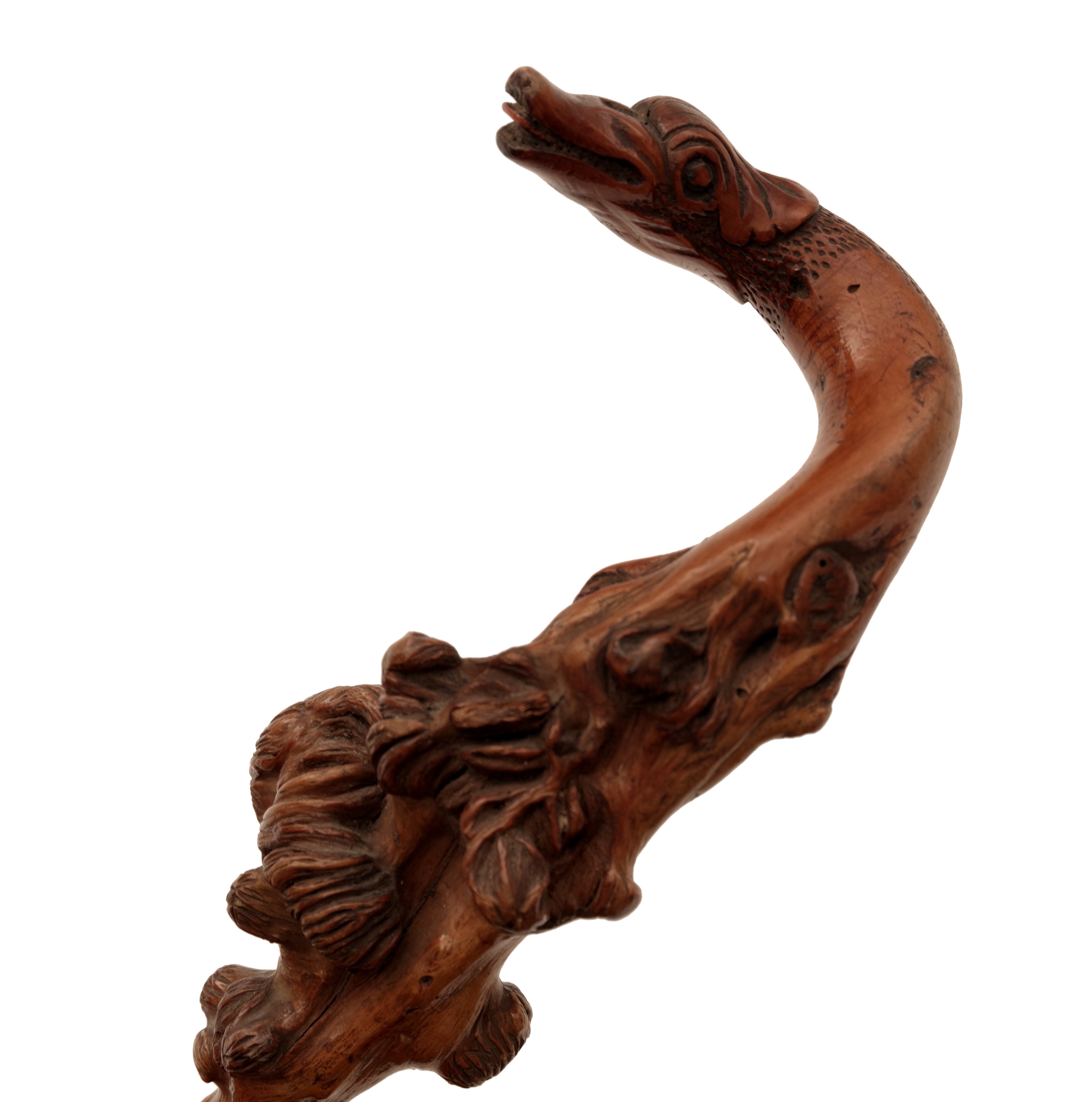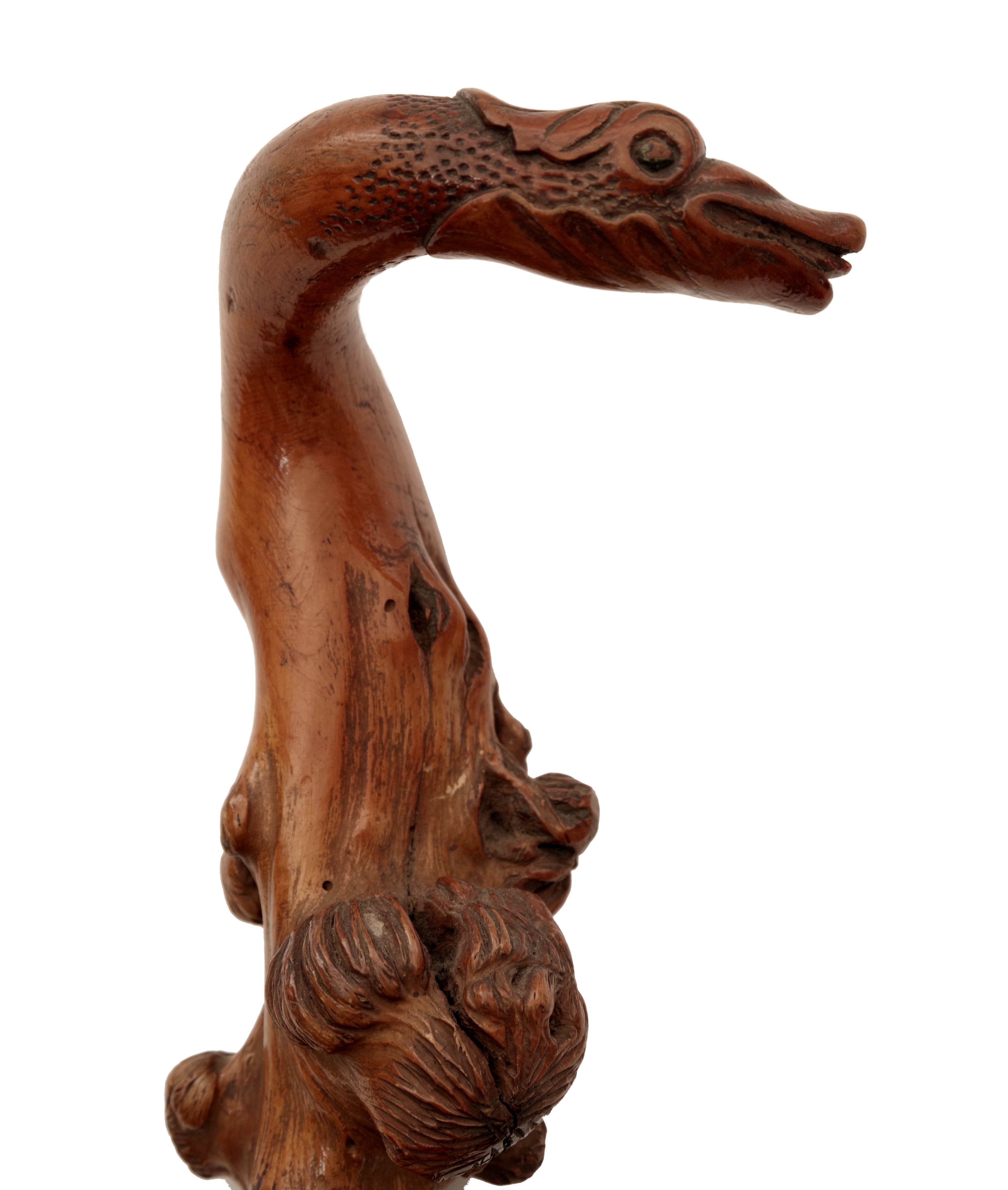 Špacírka vyřezávaná ze samorostu, rukojeť s hlavou příšery, okovaný konec s bodcem. Konec 19. století, výška 86 cm. Stav 2, Walking stick carved from natural piece of wood, handle with monster's head, metal end with spike. Late 19th century, height 86 cm. Condition 2