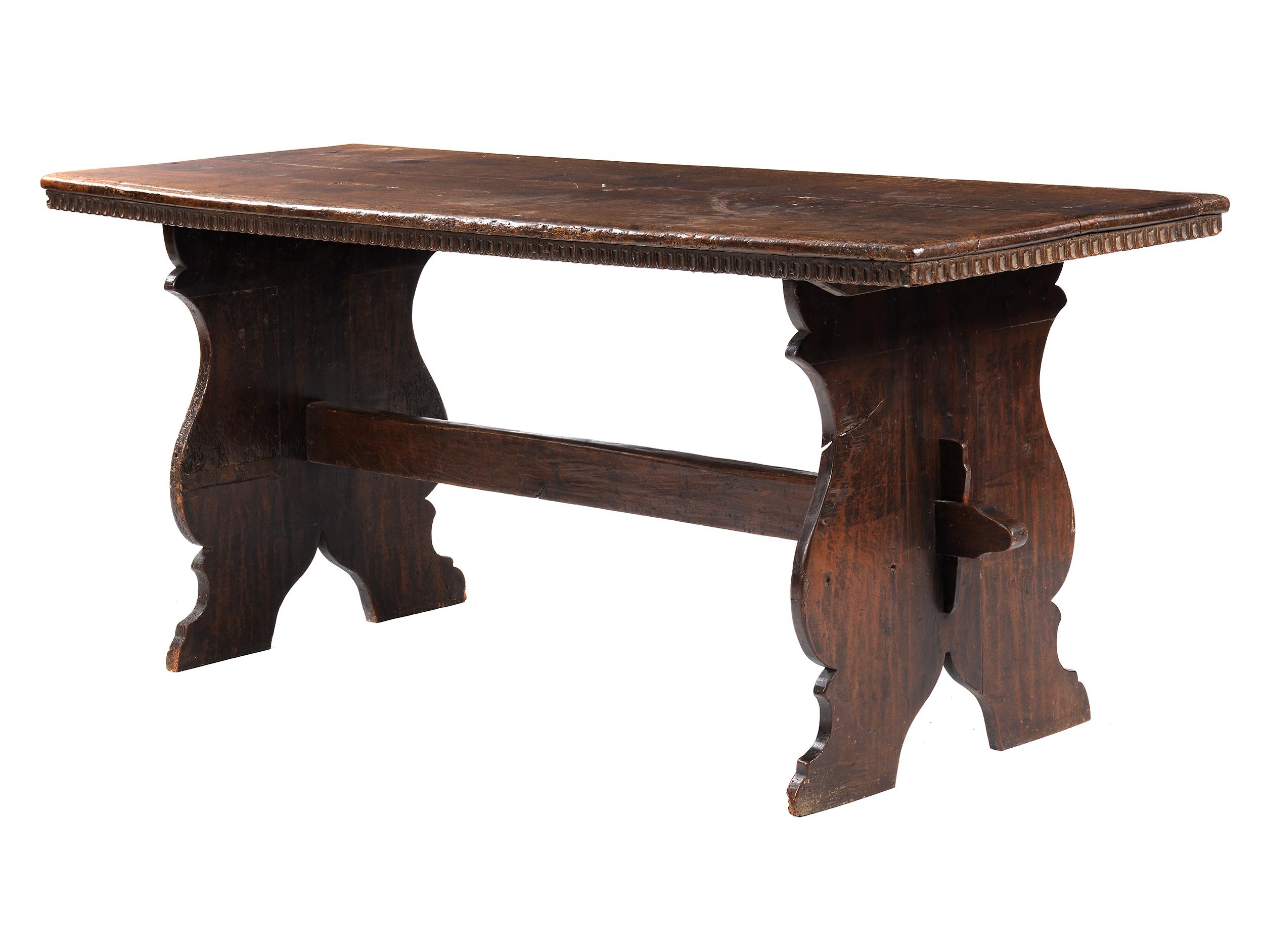 Holz, geschnitzt. Die seitlich geschweiften Wangenbeine durch mittigen Steg verbunden. Die Abdeckplatte an der Zarge mit Kanneluren dekoriert. Rest., besch. und Alterssp. (1420121) (10))