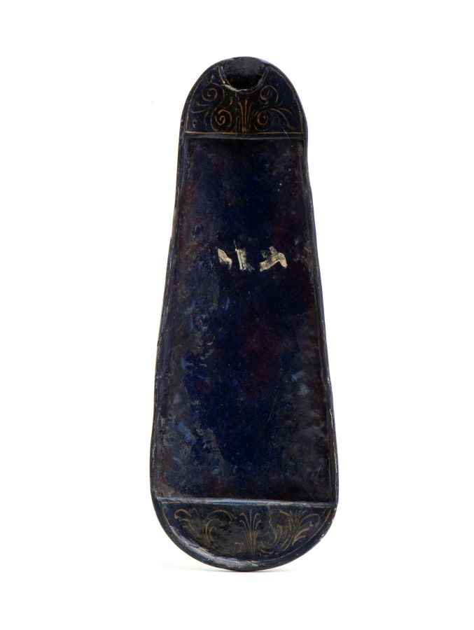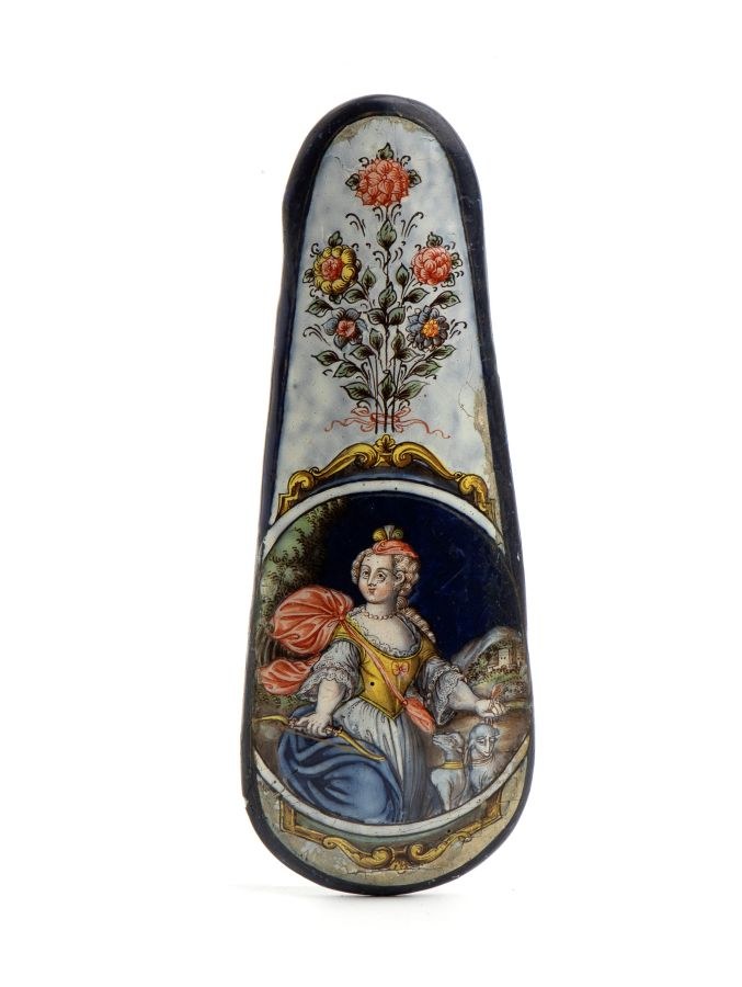 oval shaped metal, decorated with polychrome enamels depicting in the centre a miniature portrait of a noblewoman, set in a frame, with a bucolic background showing two sheep on the left and, at the top, floral decorations.On the back, the grater typical of these tools is missing, a generally rough or toothed part. The tobacco grater in the 17th century was a tool used to prepare snuff, as tobacco was sold in leaves or in compressed bunches, and therefore had to be reduced to a fine powder in order to be inhaled according to the common usage of the time. Snuff was very popular among the European upper classes in the 17th century, considered a sign of sophistication and social status.