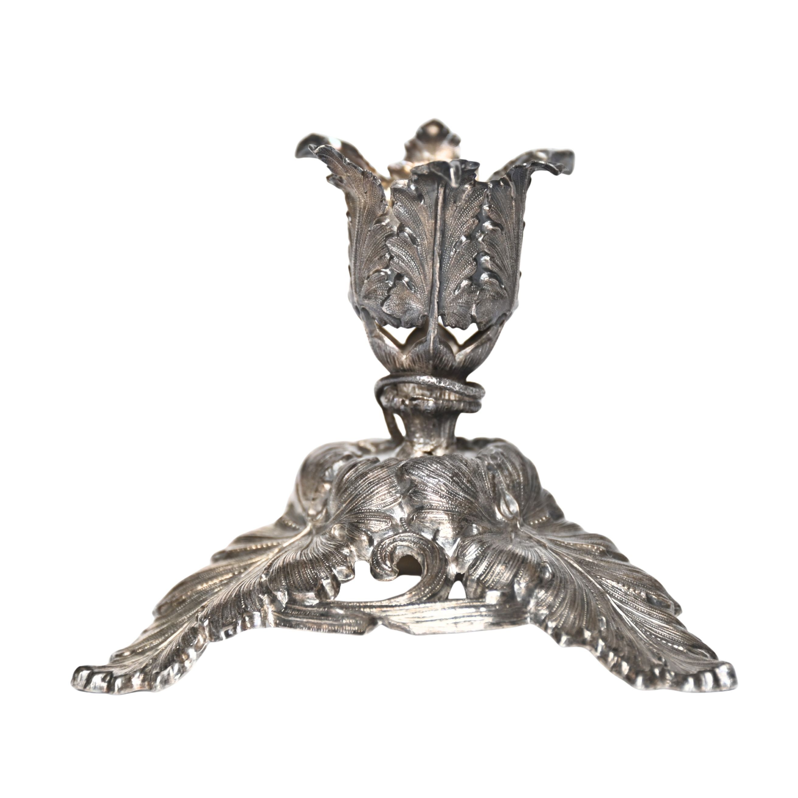 Bogato zdobiony świecznik, uformowany z pięknie cyzelowanych liści, nawiązujący do estetyki Art Nouveau. Stan bardzo dobry.