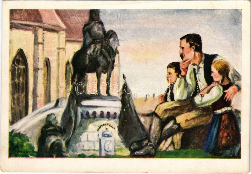 Kolozsvár, Cluj; "Lesz még kikelet Kolozsvár felett", Mátyás király szobor, népviselet. Kiadja a Magyar Nemzeti Szövetség, Don Bosco nyomda / Hungarian irredenta propaganda, Mathias Rex statue, traditional costumes, folklore s: Márton, Nógrády M. (EK)
