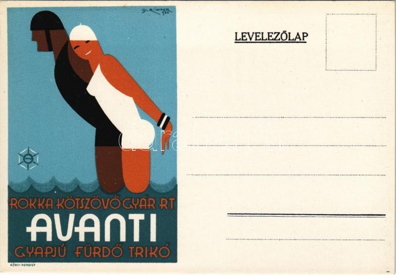 Avanti Rokka Kötszövő Gyárt rt. reklámlapja. Gyapjú fürdő trikó. Révai-Kunossy / Hungarian knitting and weaving factory advertisement s: Ifj. Richter