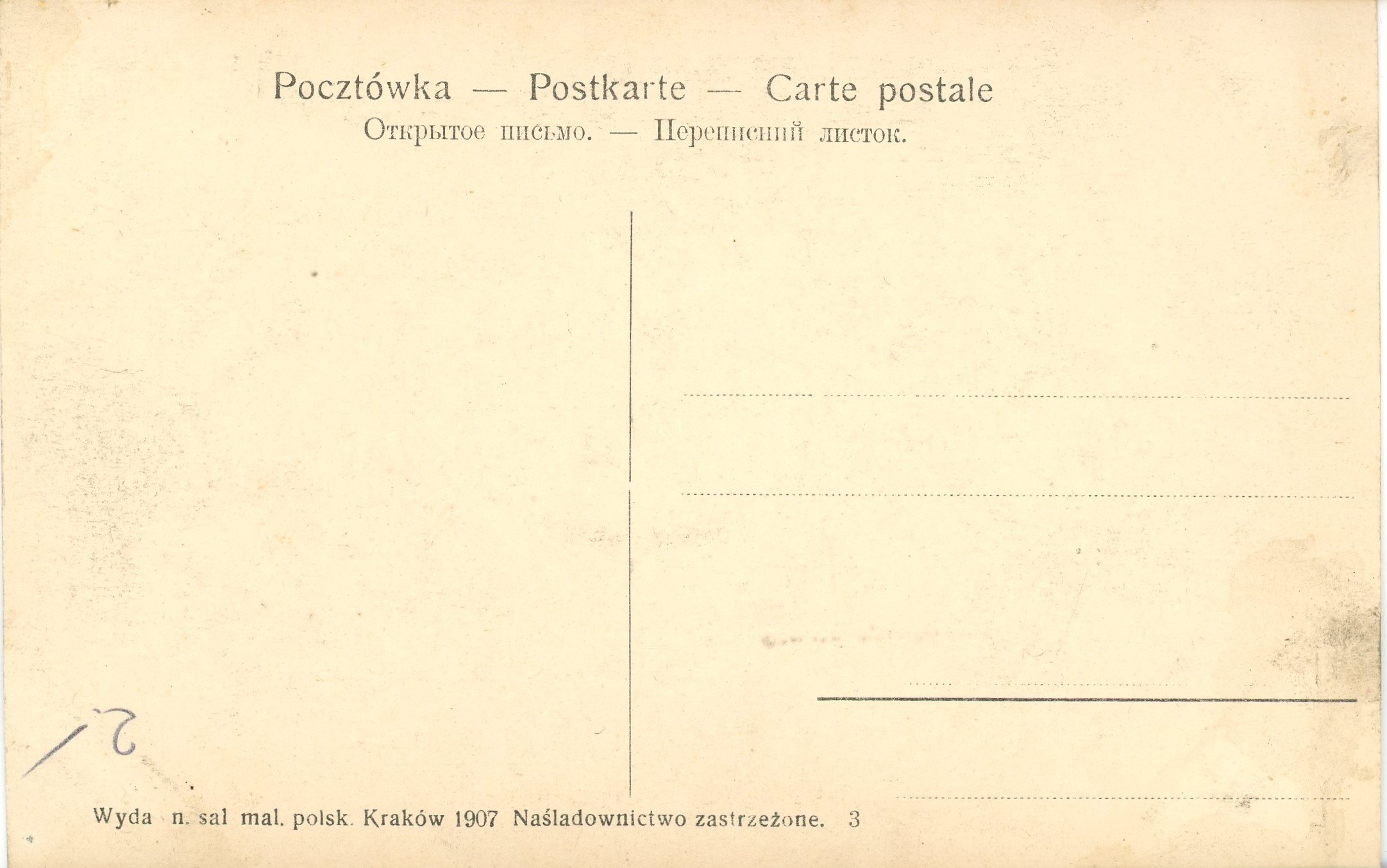 Wydawnictwo Salonu Malarzy Polskich w Krakowie, 1907. Kartka bez obiegu, stan dobry.