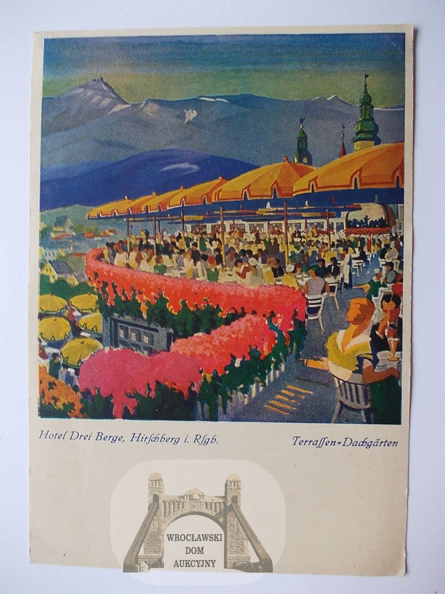 Jelenia Góra, Hirschberg, Hotel drei Bergen, taras, malarska, ok. 1930
