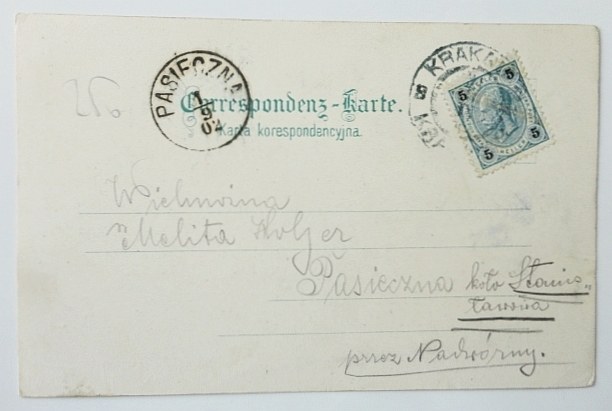 No 777. W korespondencji data: "31/8. 1902". Pocztówka litograficzna z długą linią adresową. Z korespondencją i znaczkiem. Niewielkie zaplamienia na licu i odwrocie, poza tym stan dobry.