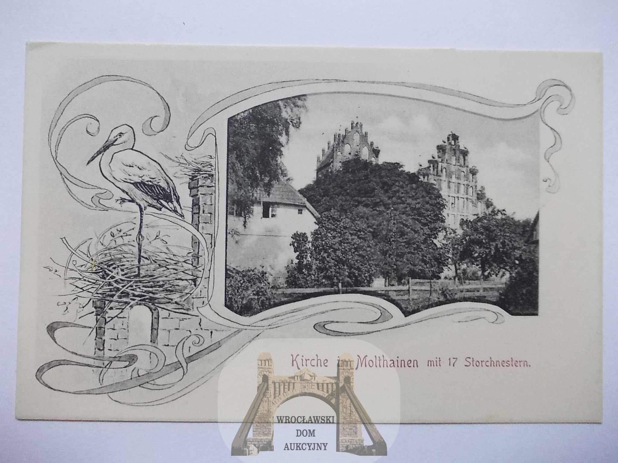 Mołtajny k. Kętrzyn, kościół, winieta z bocianem, ok. 1910