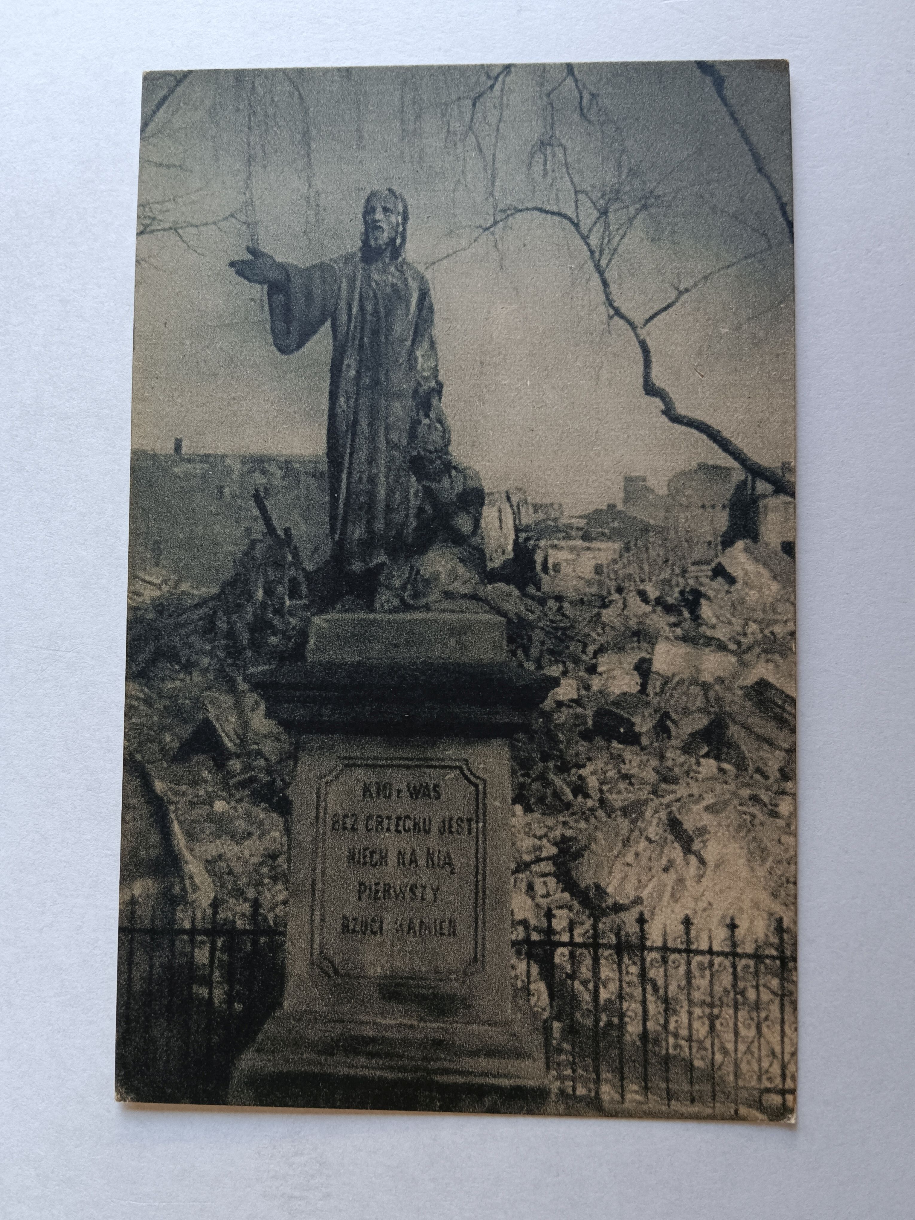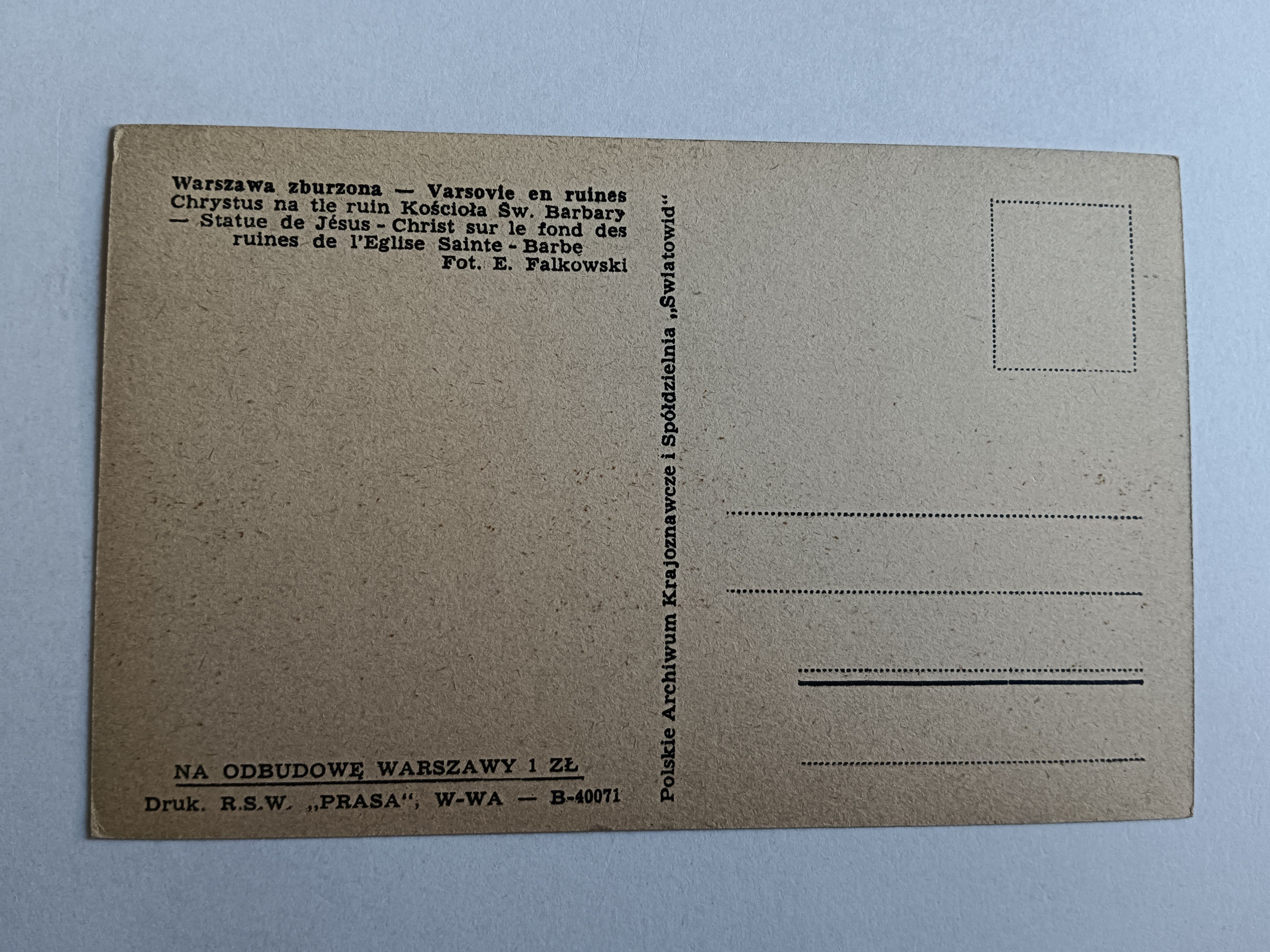 POCZTÓWKA WARSZAWA ZBURZONA, CHRYSTUS NA TLE RUIN KOŚCIOŁA ŚW BARBARY
