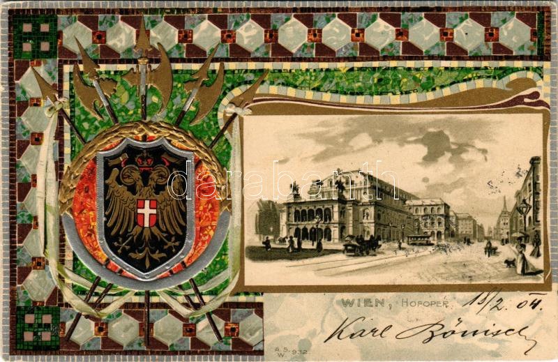 1904 Wien, Vienna, Bécs; Hofoper. A.S.W. 932. / opera house, tram, coat of arms. Art Nouveau, Emb. litho (tiny pinhole)