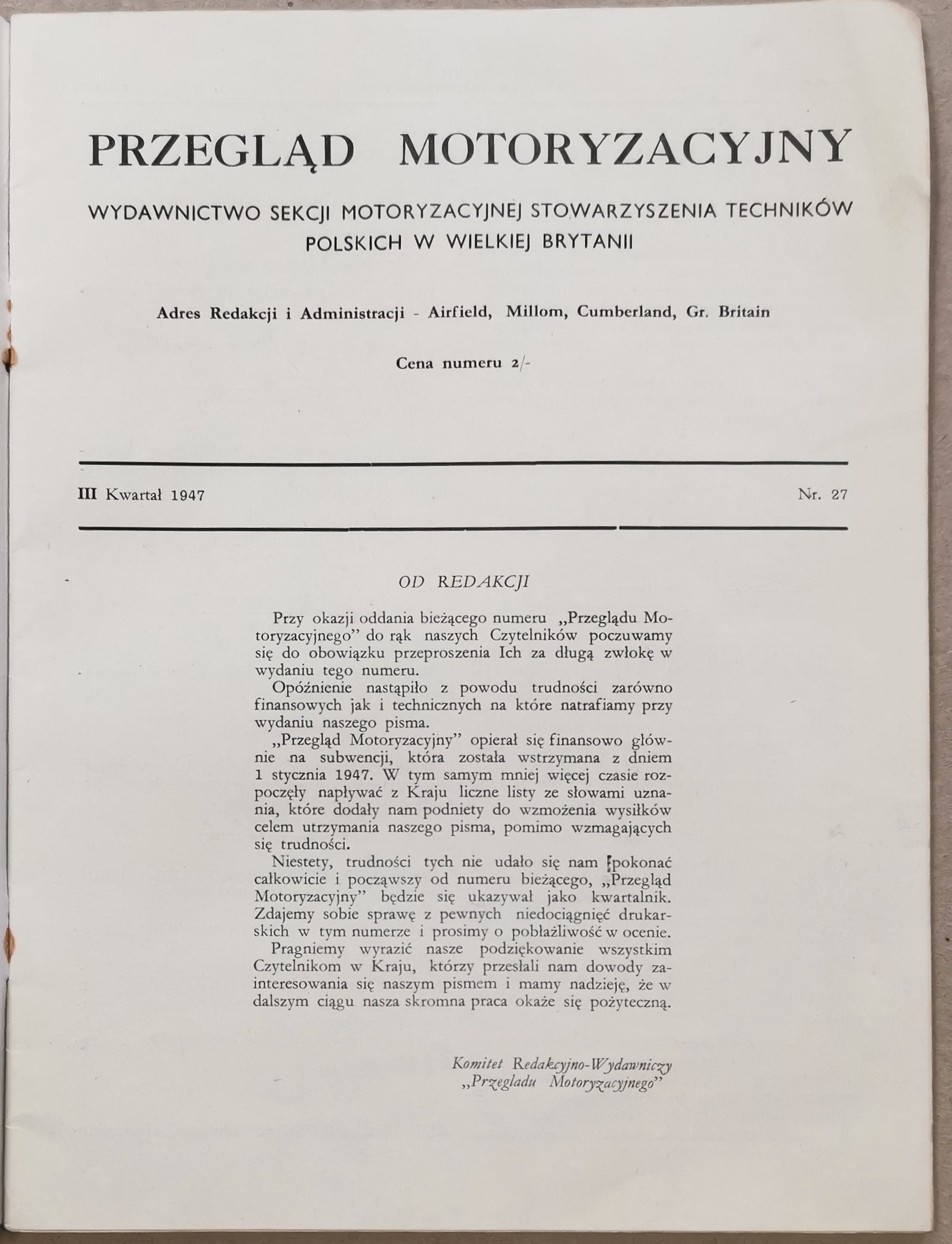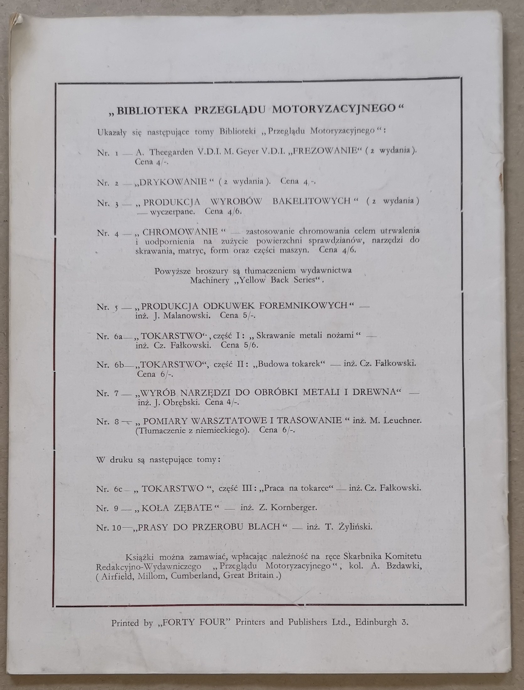 Wyd.: Wydawnictwo Sekcji Motoryzacyjnej Stowarzyszenia Techników Polskich w Wielkiej Brytanii. ; Druk.: Printed by „Forty Four” Printers and Publishers Ltd., Edinburgh 3.
