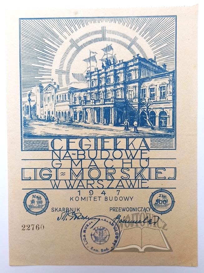 Komitet budowy. 1947. Cegiełka w kolorze biało-niebieskim, przedstawiająca gmach Ligi Morskiej, z napisem jw. Cegiełka o nominale 500 zł. Wym.: 19,7 x 14,6 cm.