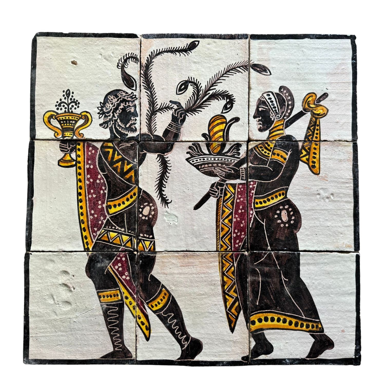 Artistic composition composed of 9 glazed and hand-decorated terracotta tiles, depicting a Pompeiian scene, 19th/20th century.