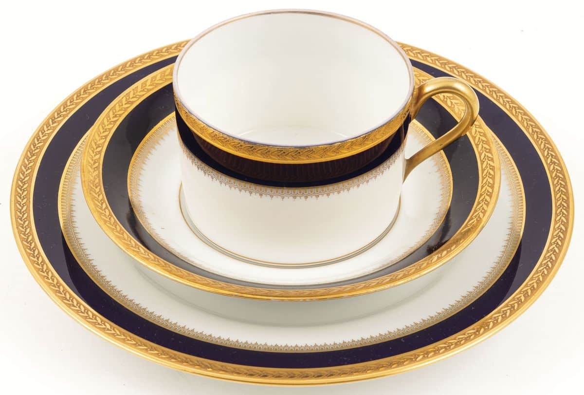 Porcelana, kobalt podszkliwny, złocenie, filiżanka wys. 5,5 cm, spodek śr. 14,5 cm, talerzyk śr. 19,5 cm