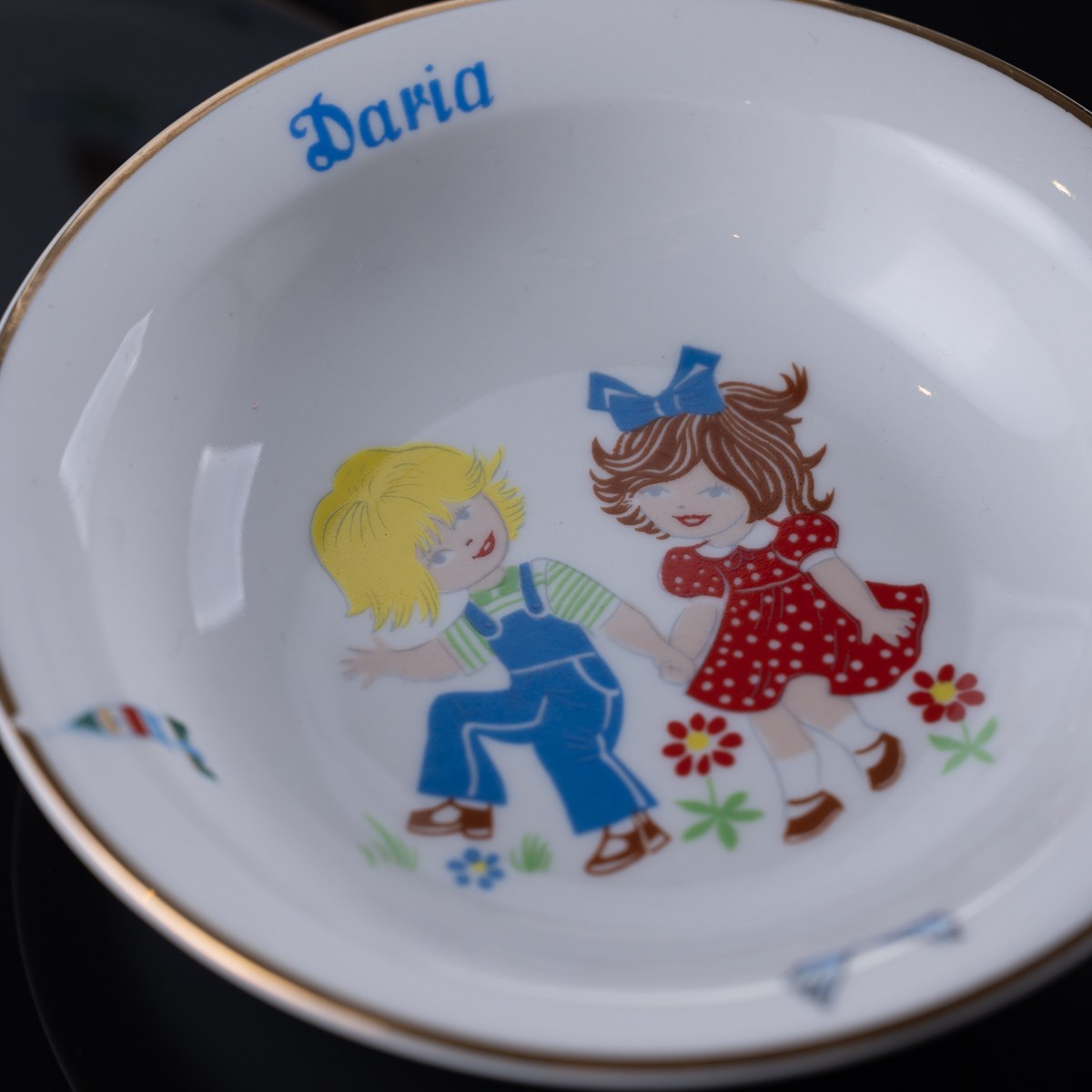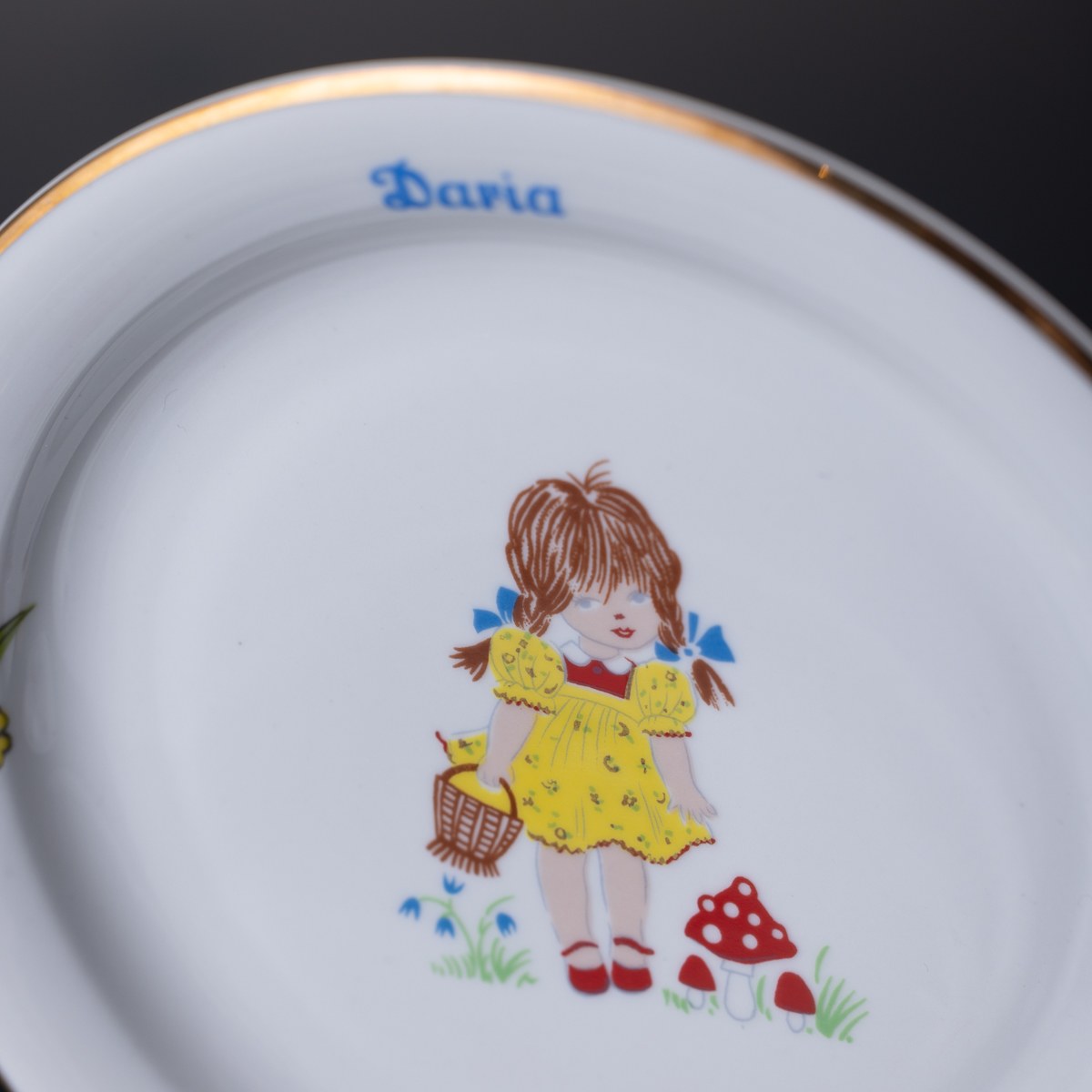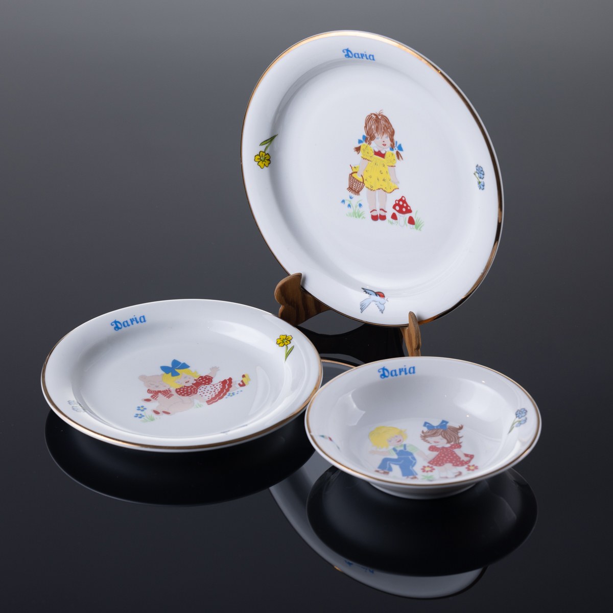 Porcelana zdobiona kalkomanią i złoceniami, talerzyk duży: wys. 2 cm, śr. 18 cm; talerzyk mały: wys. 2 cm, śr. 16,5 cm; miseczka: wys. 3 cm, śr. 13,5 cm; sygn. na małym talerzyku pieczęcią wytwórni: WAŁBRZYCH MADE IN POLAND
