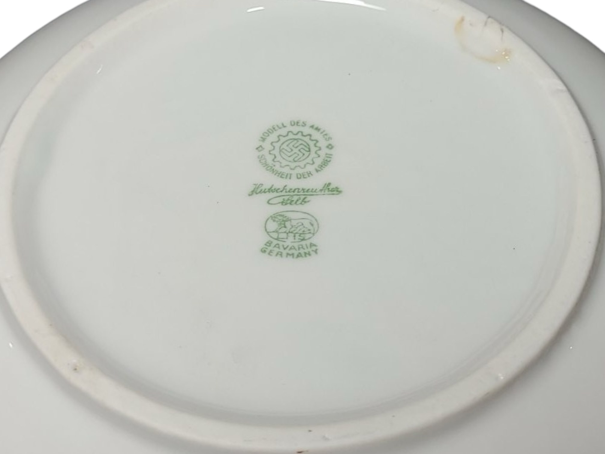 Deep plate manufactured by Hutschenreuther. Used in Deutsche Arbeits Front (DAF) casinos. Very good condition