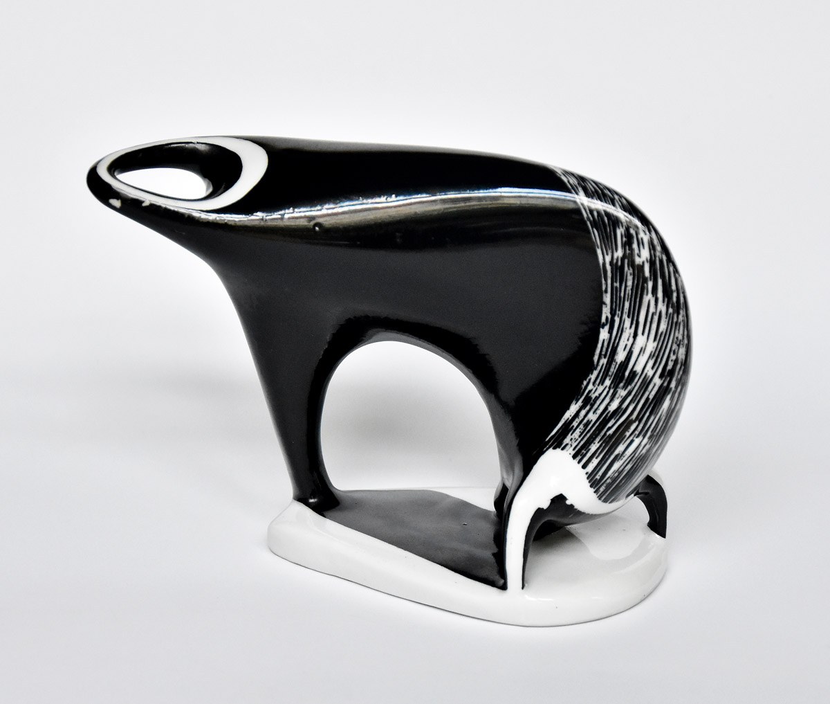 porcelana biała, natrysk czarną farbą, technika drapania, wym. 11,5 x 16,5 x 7 cm, projekt formy: Mieczysław Naruszewicz (1923-2006) z 1958, znak zielony drukowany Zakładów Porcelany „Bogucice” w Katowicach-Bogucicach, numer czarną farbą: 5097/257.