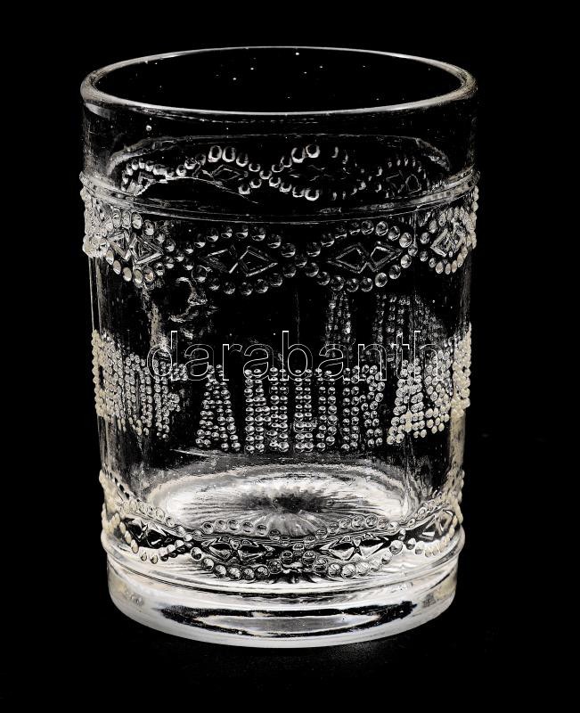 Gróf Andrássy Gyula arcképével és nevével díszített emlékpohár, jelzés nélkül, aljánál minimális pattogzással, m: 8 cm /// Commemorative glass decorated with the portrait and name of Count Gyula Andrássy. Unsigned, minor chipping at the base, height: 8 cm.