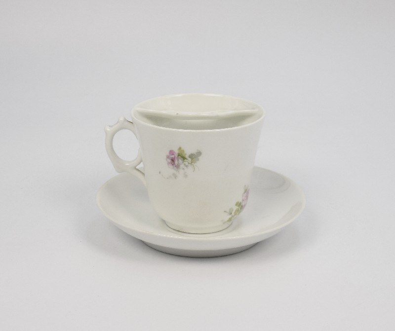 porcelana, druk, złocenie; wymiary: filiżanka - 8,4 x 11,6 x 9,5 cm, spodek - średnica 15,2 cm;