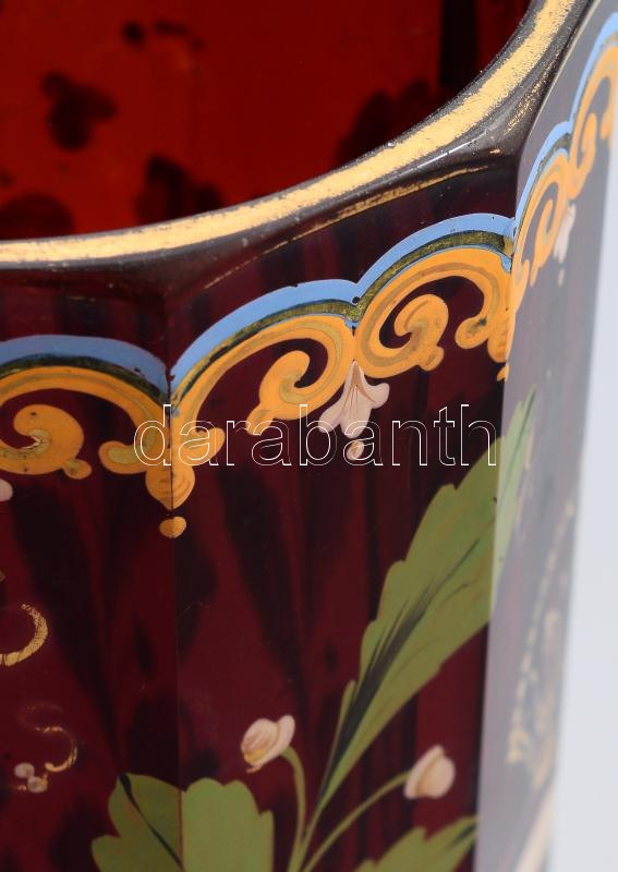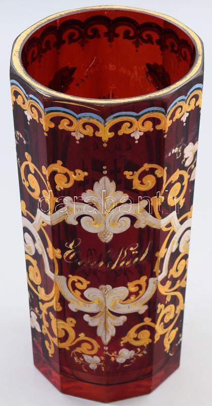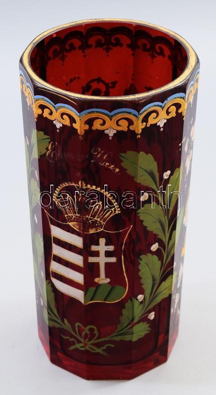 Nagyméretű biedermeier címeres emlékpohár. cca 1850/70, Parád, bíborpácolt, zománcfestett üveg, lapokra fazettált pohártest, festett kartusban fakult "Emlékül" felirattal, túloldalán babérágak között "Éljen a haza" felirattal és címerábrázolással. Kis karcokkal, kopással, m: 22,5 cm, ekkora méretben rendkívül ritka! /// Large Biedermeier commemorative heraldic glass. c. 1850/70, Parád, ruby-stained, enamel-painted glass, faceted panels on the body, with a painted cartouche bearing the faded inscription ?Emlékül? (As a Memento), and on the opposite side, ?Éljen a haza? (Long Live the Homeland) surrounded by laurel branches and a coat of arms. Minor scratches and wear, height: 22.5 cm. Extremely rare in this size!