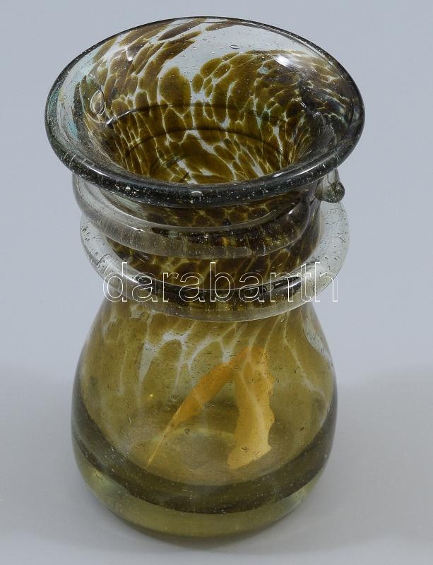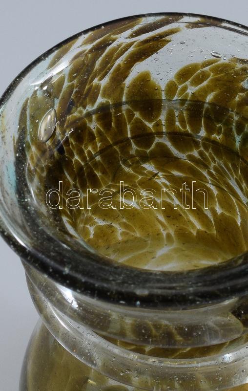 Pattantyús Gergely (1972) - Polyák János (1967-): Fémsókkal színezett hutaüveg váza. 1997, Bárdudvarnok, anyagában színezett hutaüveg, rátekert üvegszál díszítéssel. Jelzés nélkül, hibátlan, m: 10,5 cm /// Pattantyús Gergely (1972) ? Polyák János (1967?): Metal salt?colored hut glass vase. 1997, Bárdudvarnok. Body-tinted hut glass with applied glass thread decoration. Unsigned, flawless condition, height: 10.5 cm