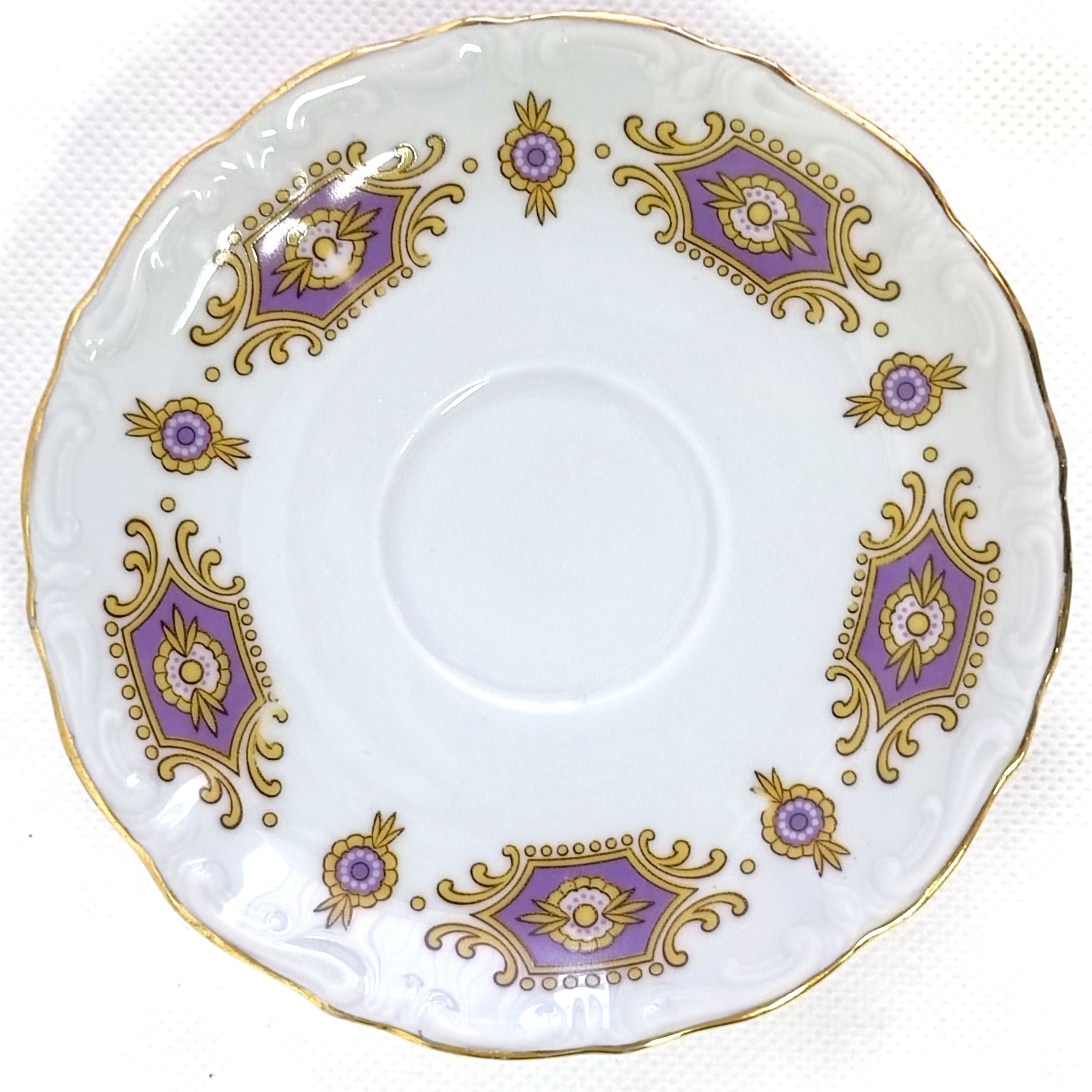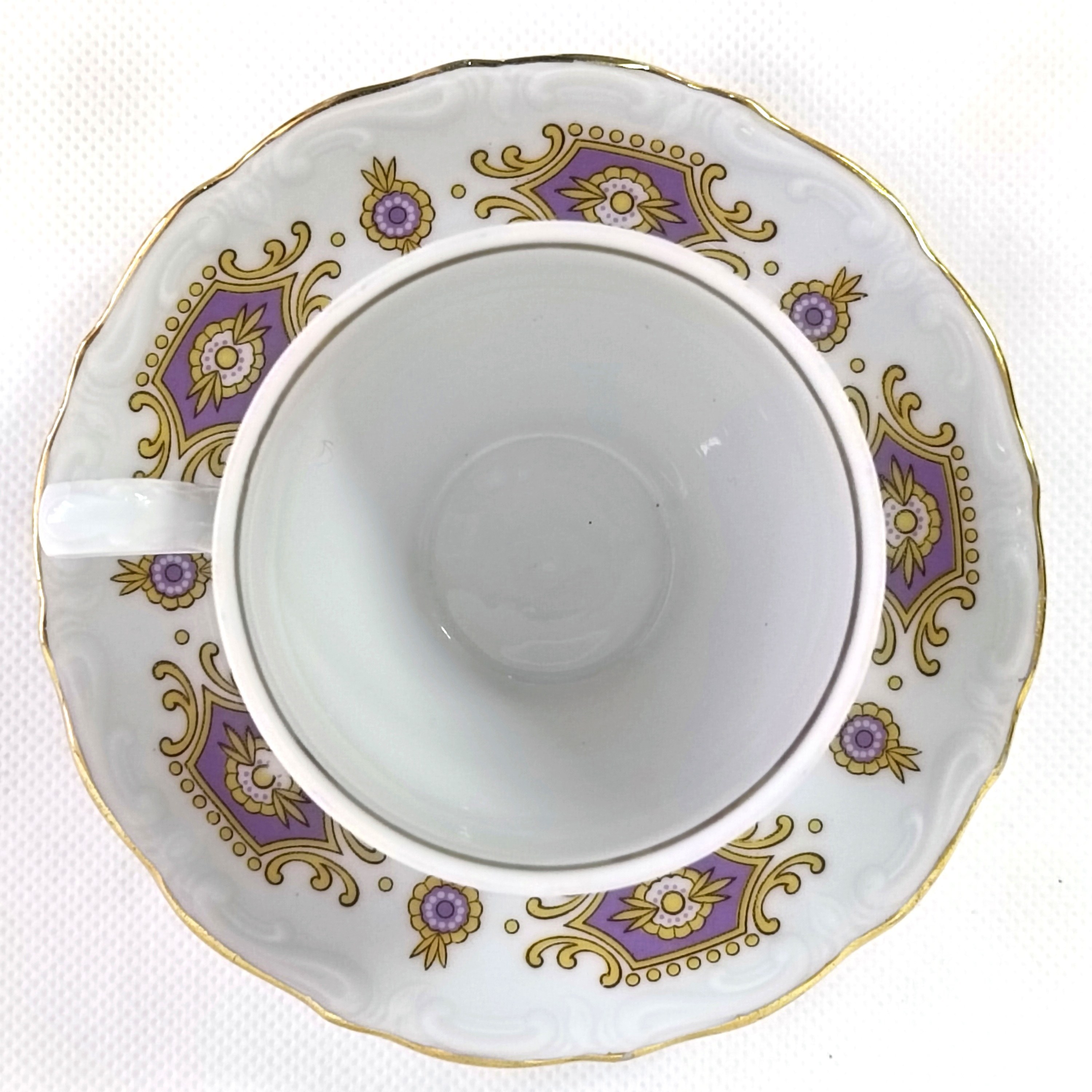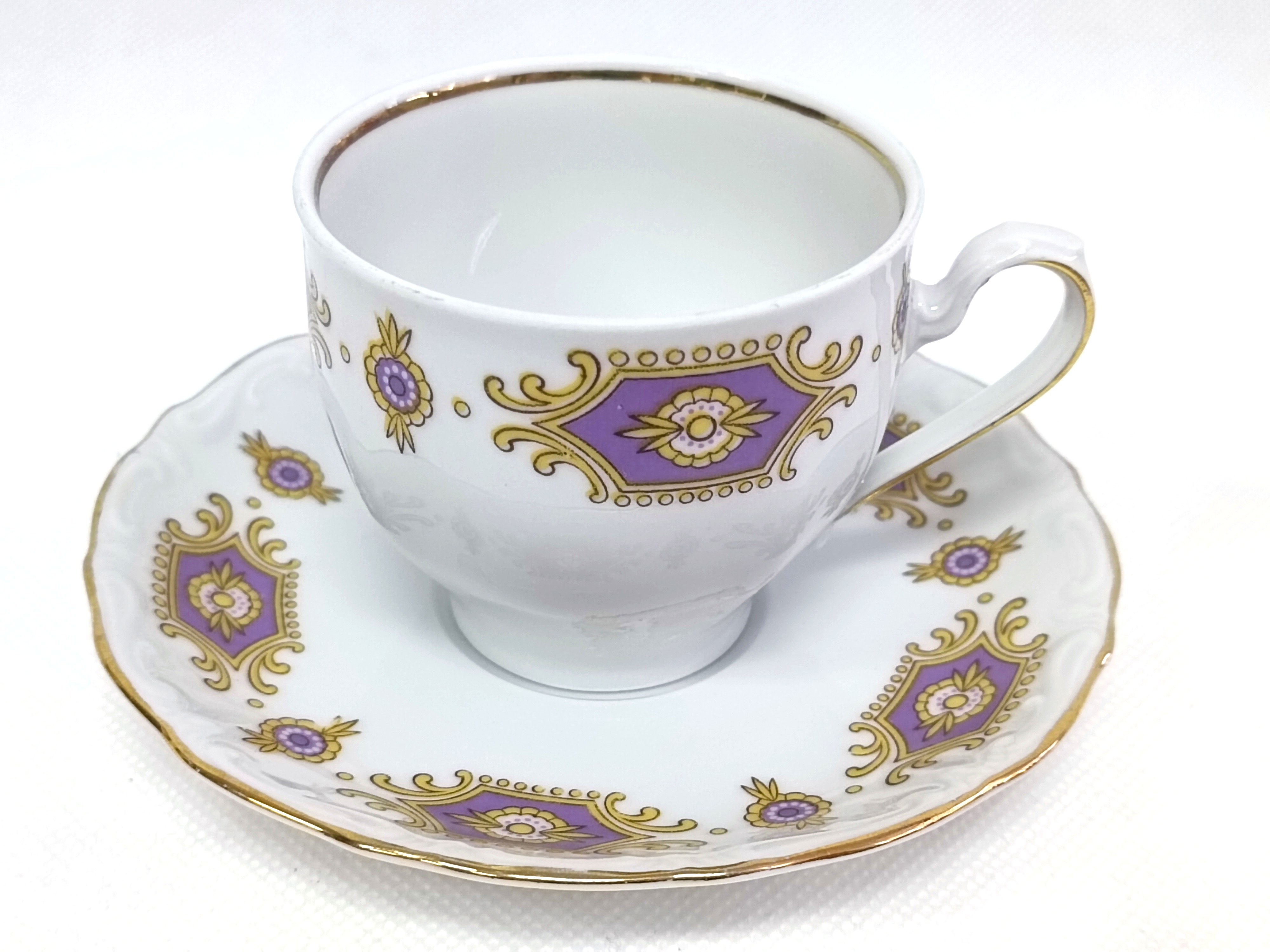 Porcelanowa filiżanka i spodek, w kolorze białym, zdobiona fioletowo-żółtymi motywami geometrycznymi na zewnętrznej stronie filiżanki i na spodeczku. Dodatkowo zdobiona złotymi wykończeniami.