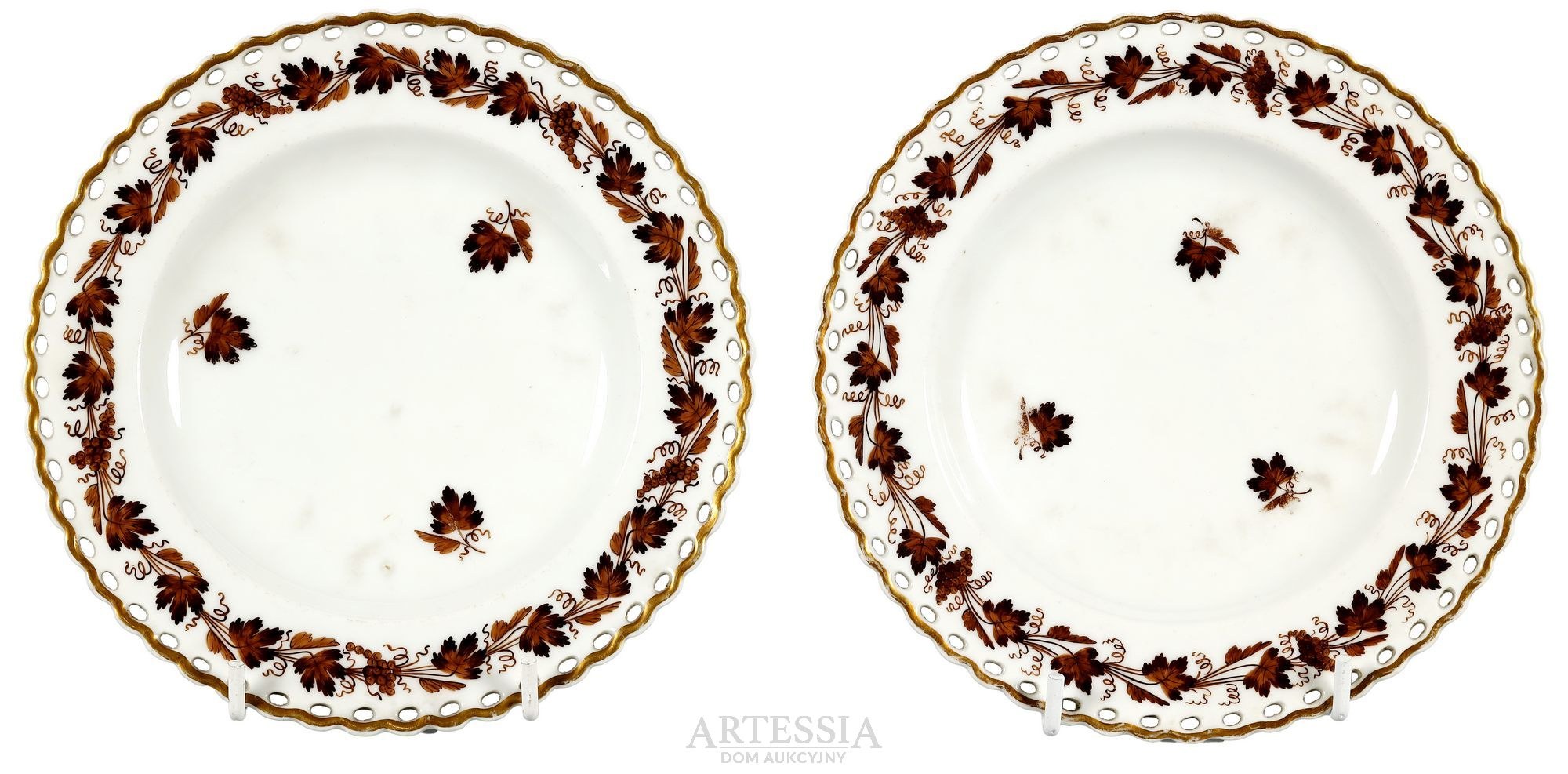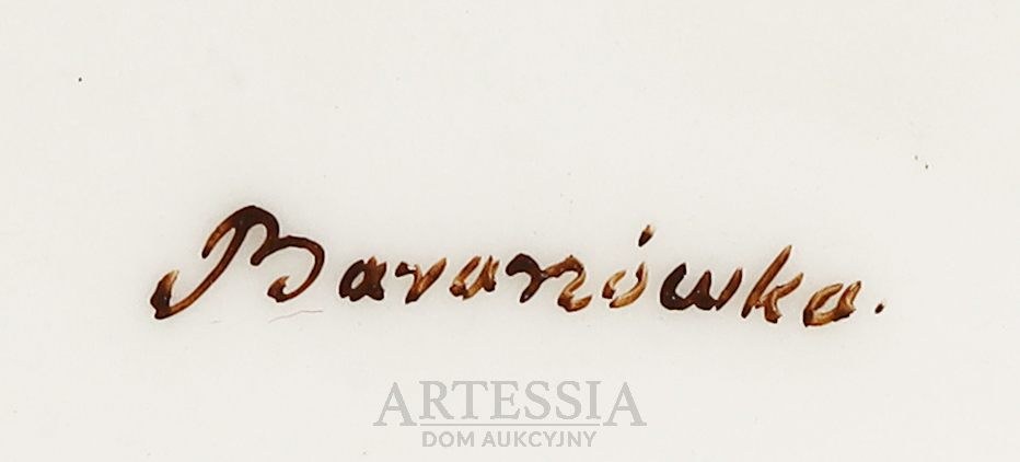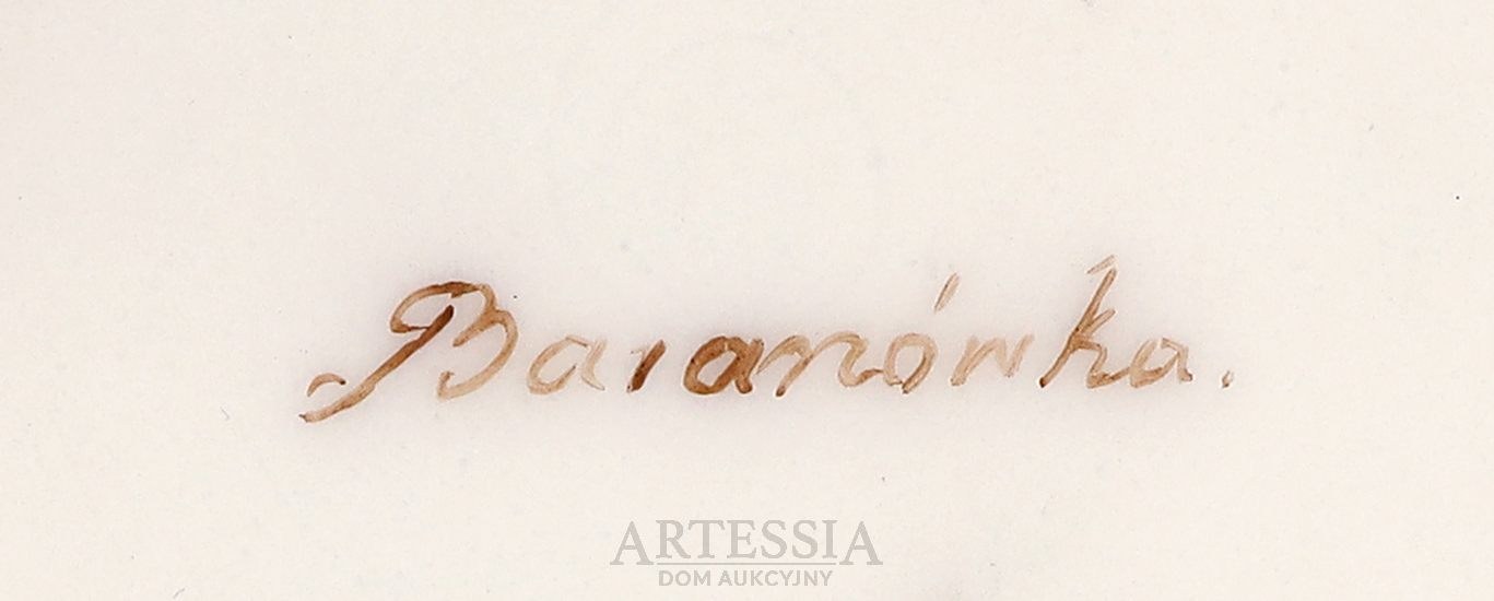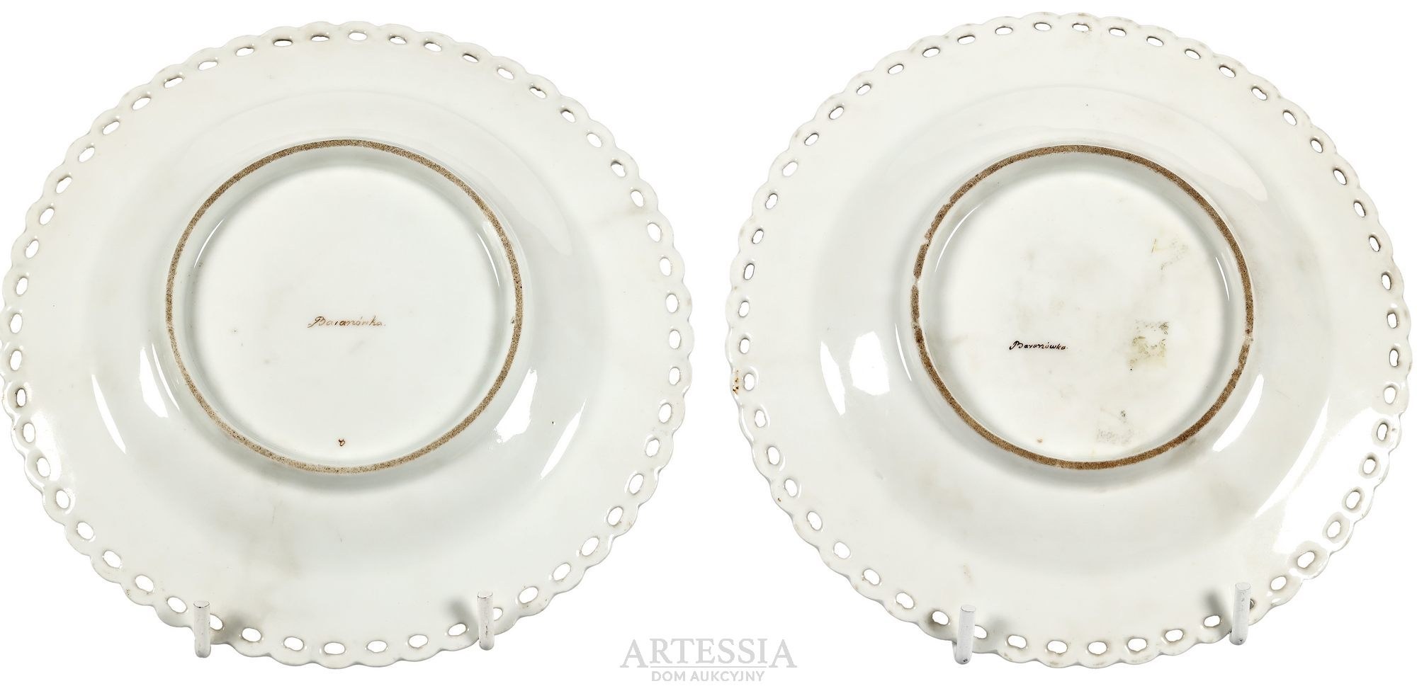 porcelana, farby naszkliwne, złocenia; średnica 23 cm, wys. 3 cm; na spodzie oznaczenie wytwórni, kolorem brązowym naszkliwnie: Baranówka.; na jednym talerzu poniżej: 8