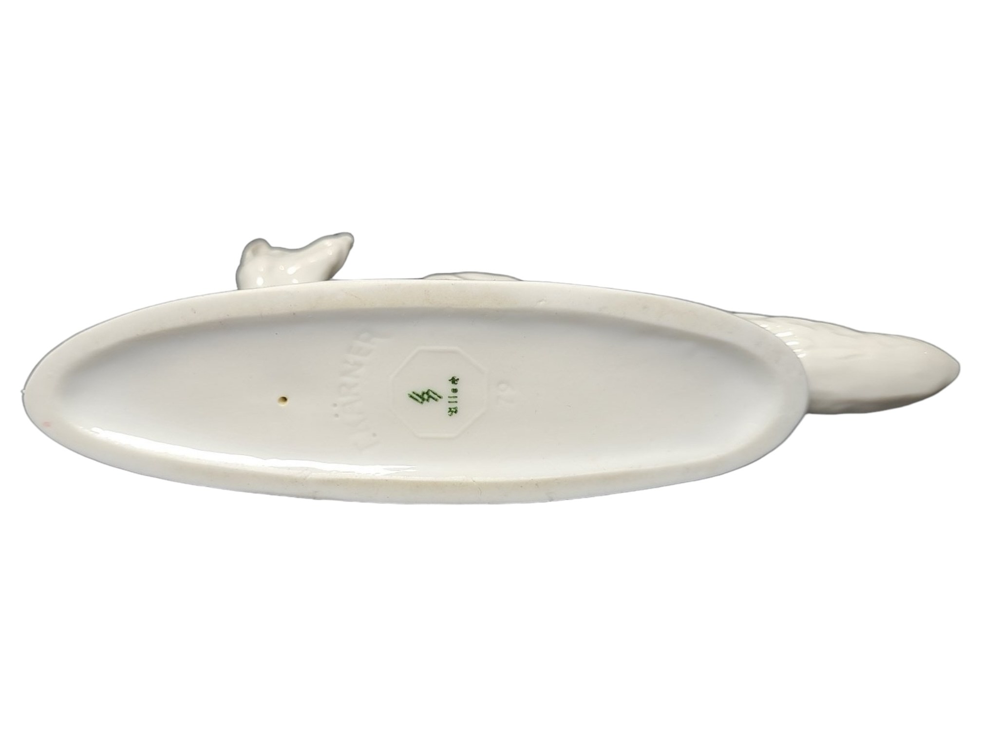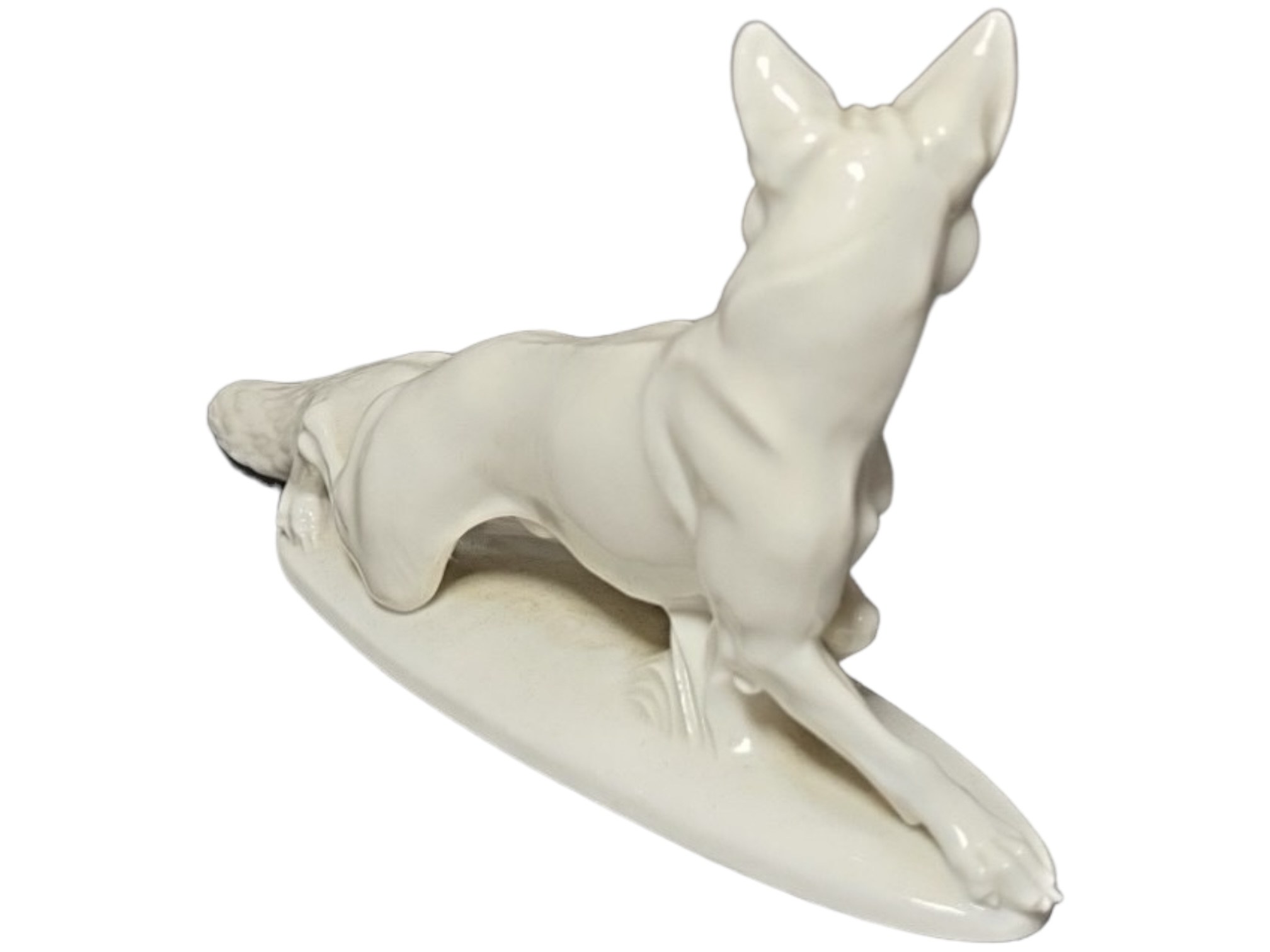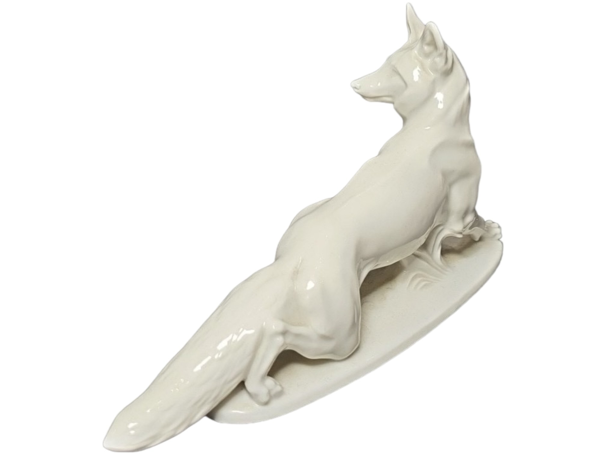 Allach "Sneaking Fox" white porcelain figurine number 79, designed by Professor Theodor Kaerner, marked under the base "T. Karner" and "79", with green SS runes and the inscription "Allah" inside the octagon. Length 15.5cm