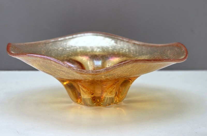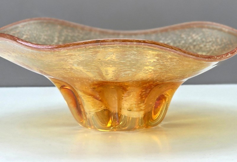 Piękna szklana paterka w kolorze łososiowym z licznie zatopionymi bąbelkami