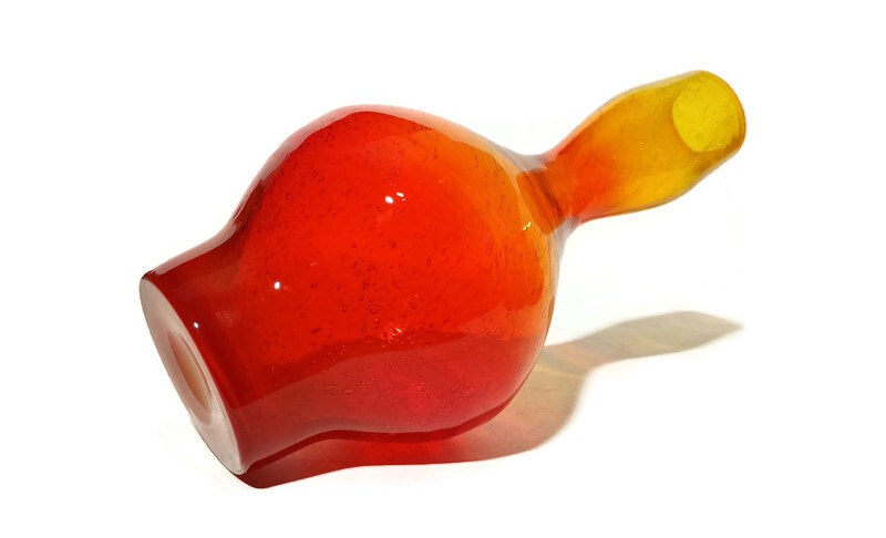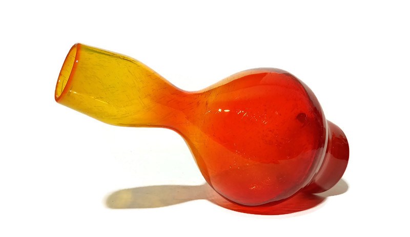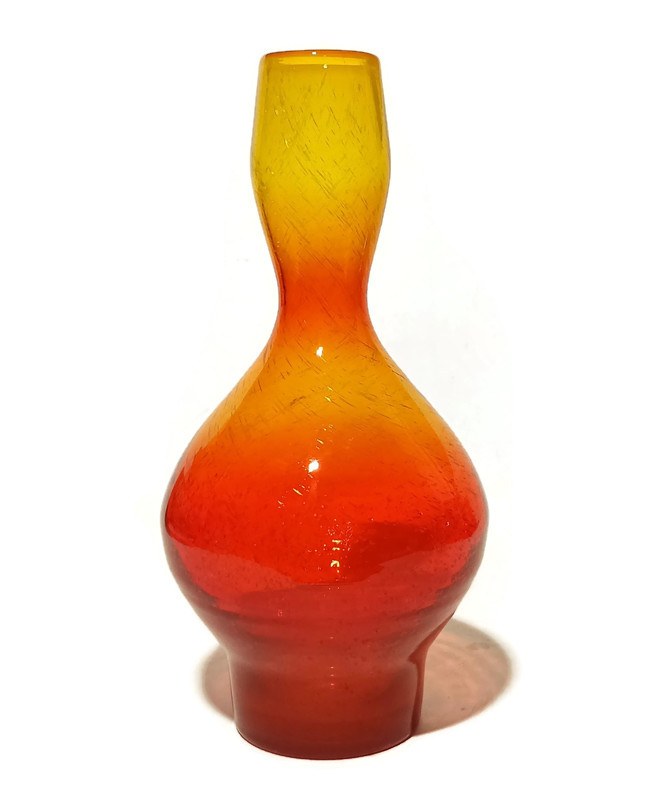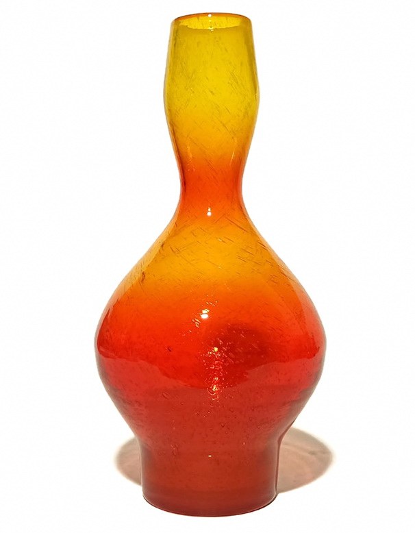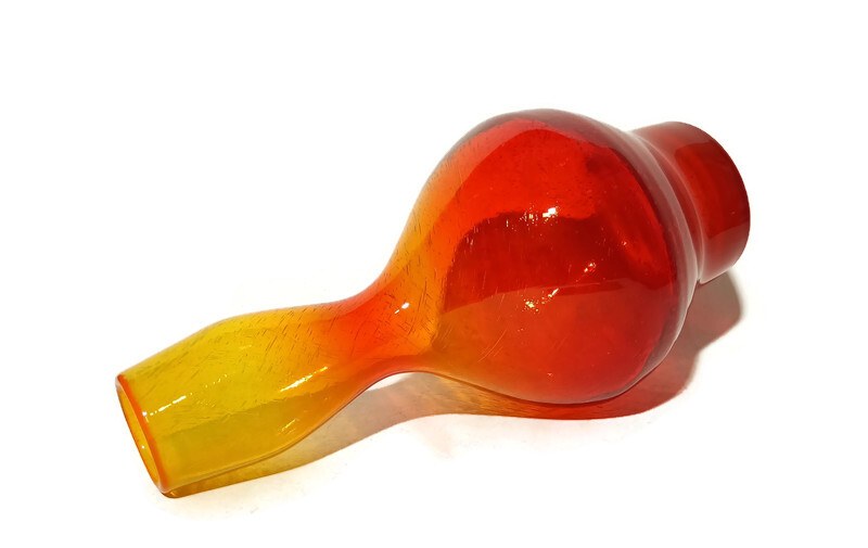 szkło barwione w masie, ręcznie formowane, antico (intensywne napowietrzenie szkła), kolor tonowany, rubinowy u podstawy, przechodzący przez pomarańczowy do intensywnie żółtego, otok wlewu pomarańczowy, wysokość 30cm, stan bardzo dobry,