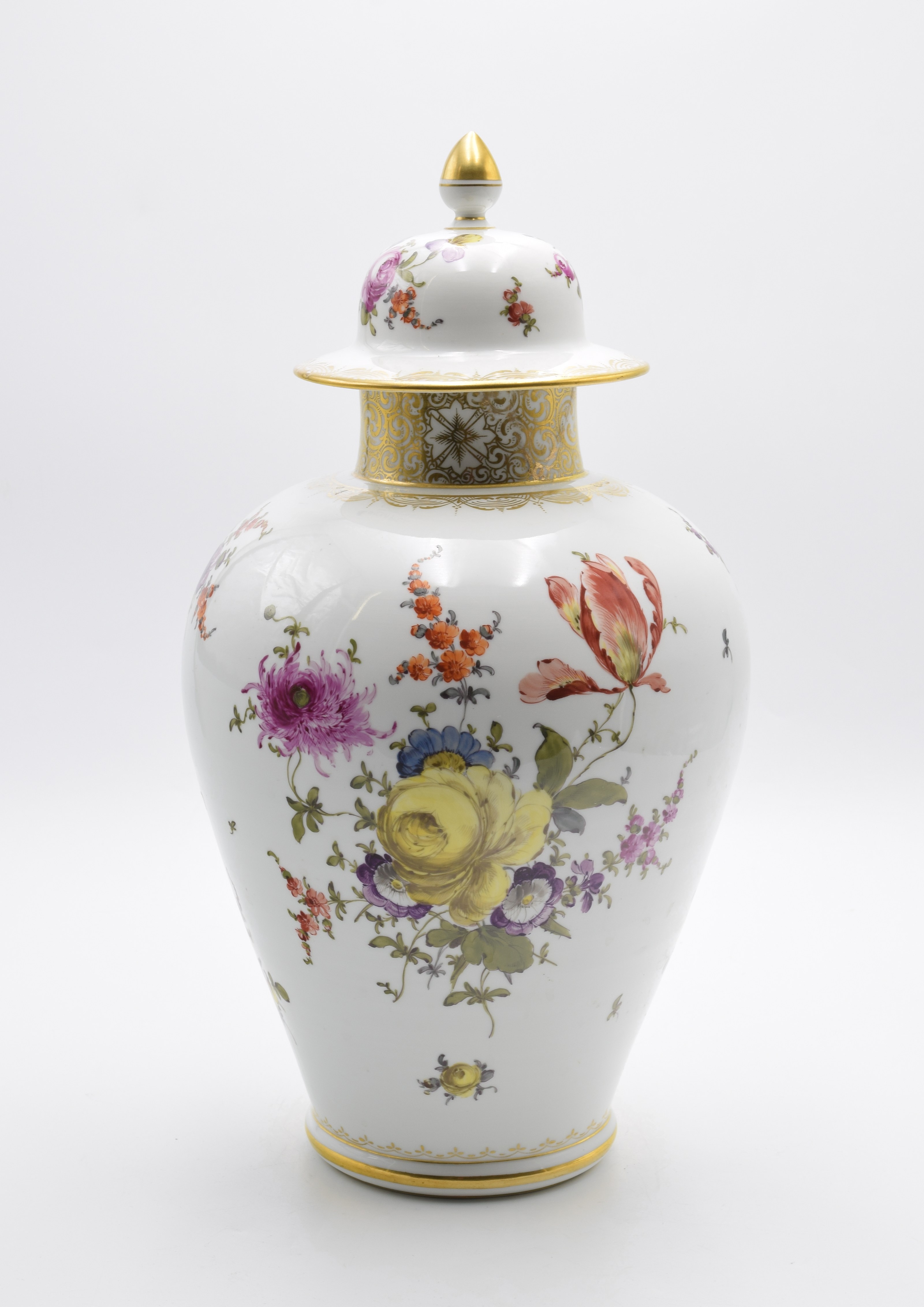 Wazon o owoidalnym brzuścu, z wydzieloną obręczą podstawy, pierścieniową szyjką i kopułową pokrywą z kołnierzem oraz wrzecionowatym uchwytem. Wokół brzuśca i na pokrywie luźne bukiety „niemieckich” kwiatów, rzuty kwiatowe, drobne kwiatki i listki; wokół szyjki i brzuśca pod szyjką, krawędzi kołnierza pokrywy i wokół podstawy - „koronkowe” złocenia. Krawędzie i uchwyt złocone.