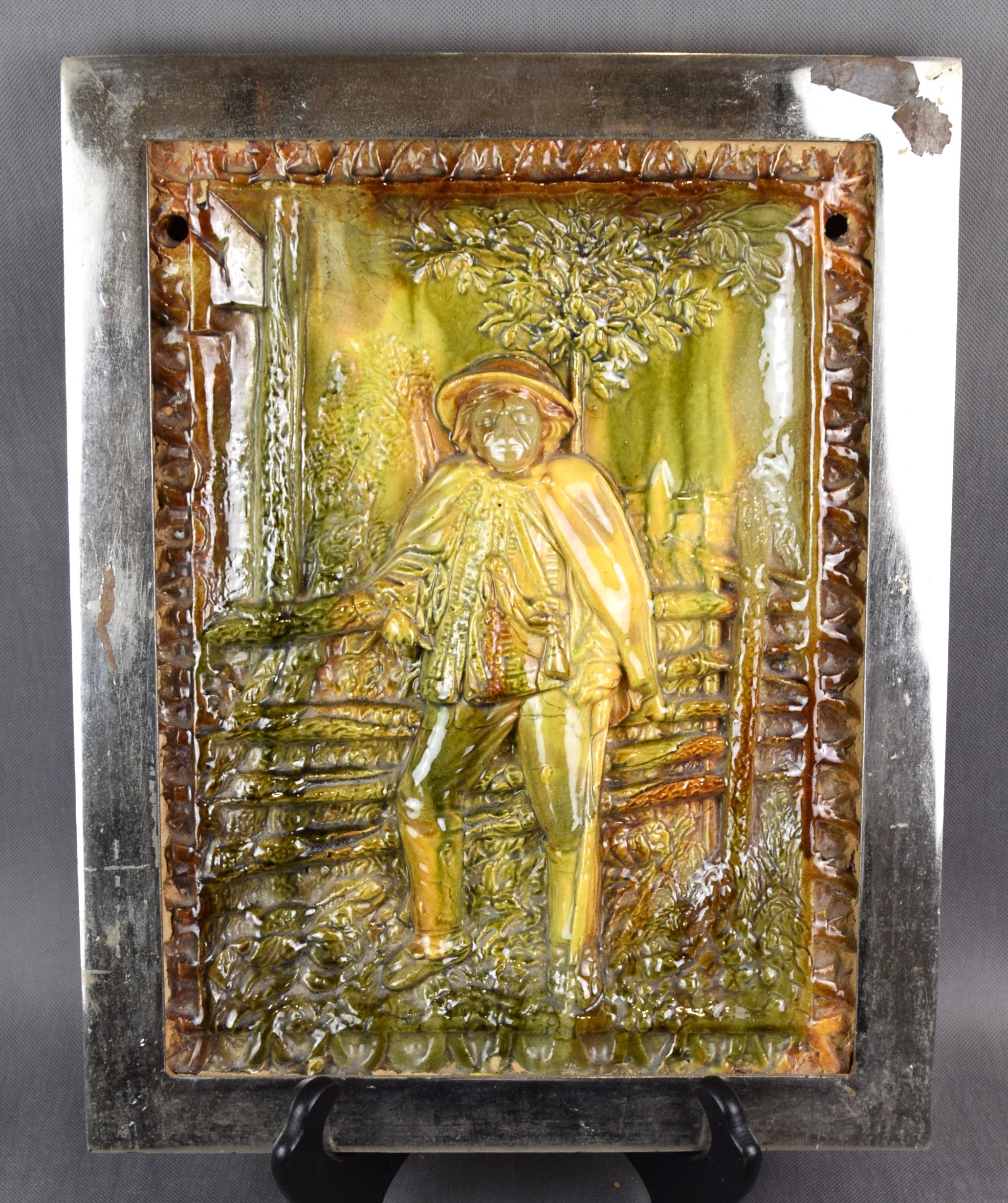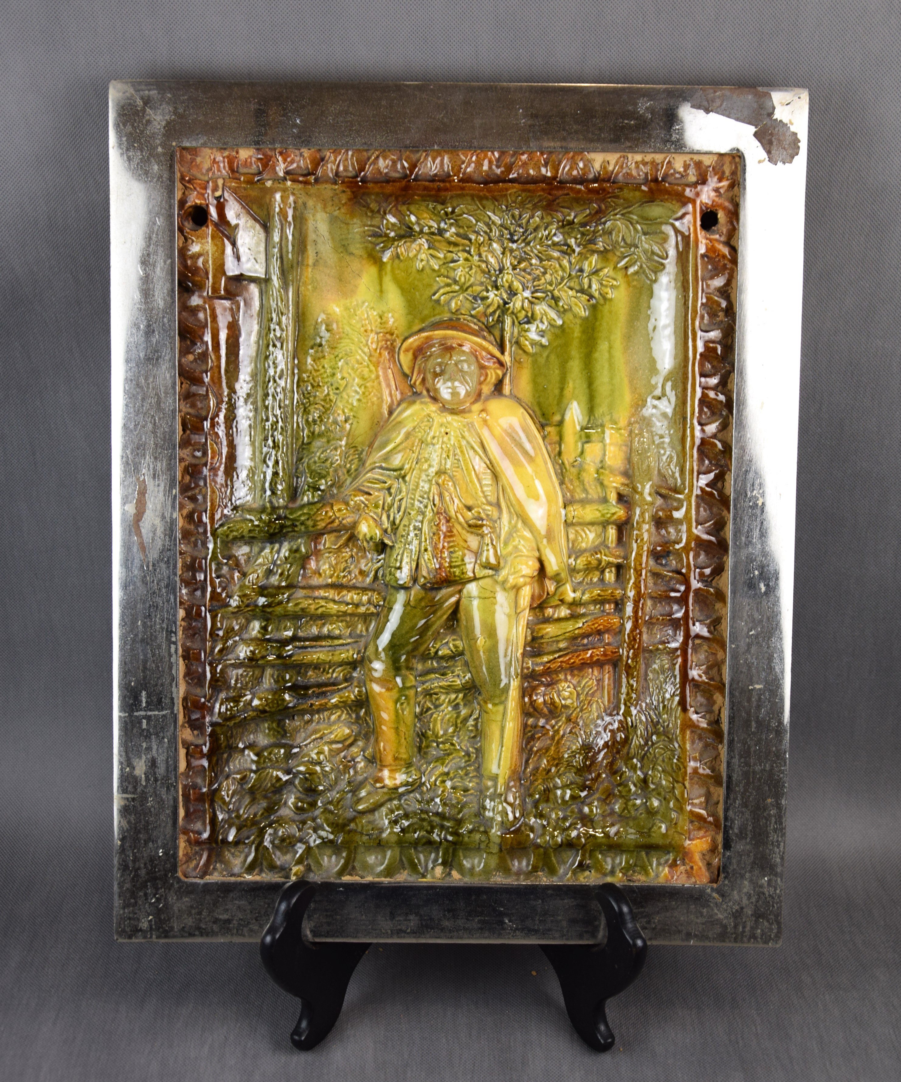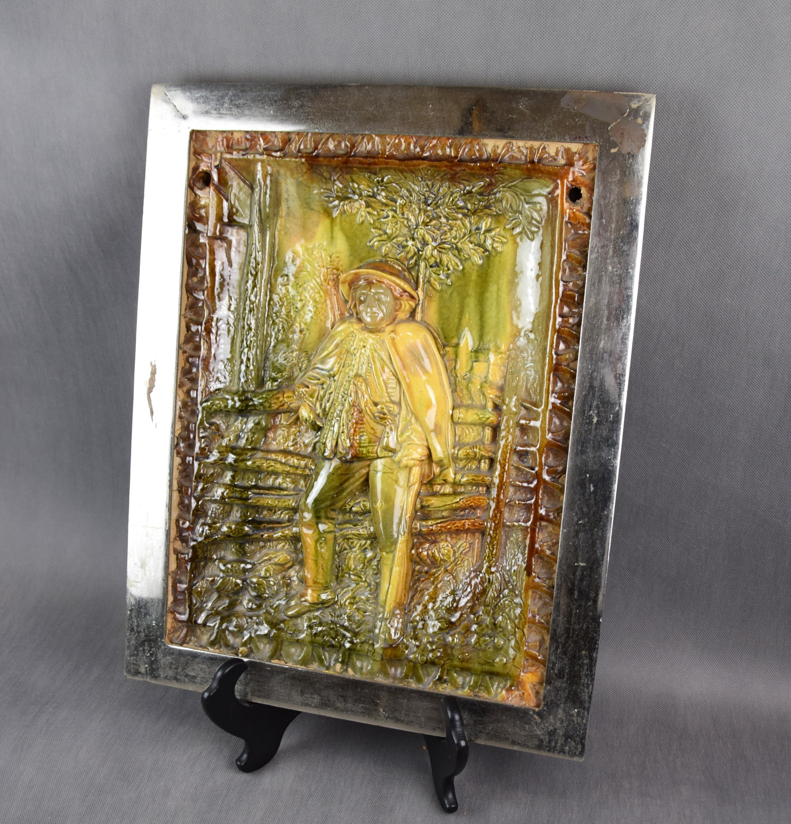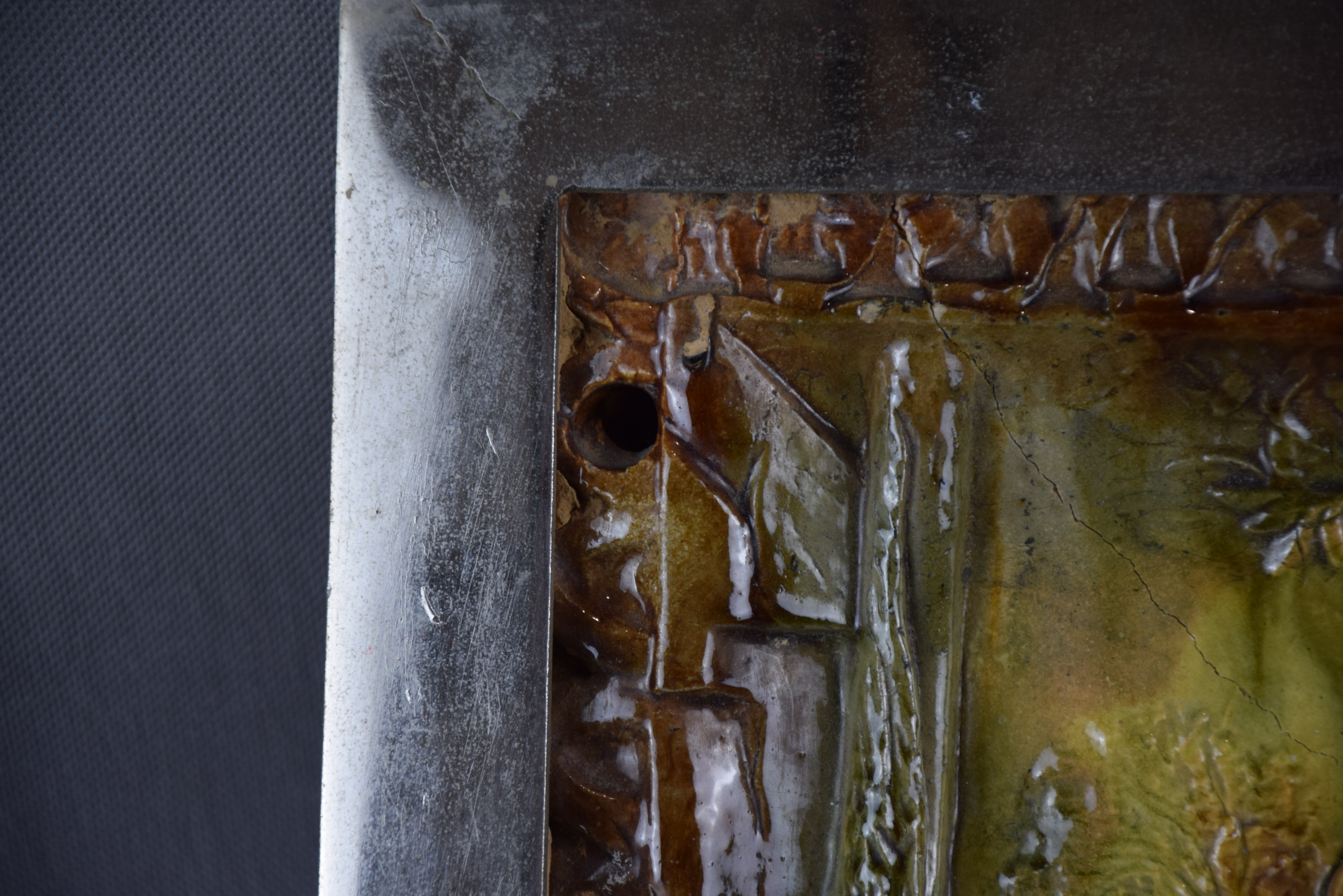 Ceramika szkliwiona. Oprawiona w żelazną chromowaną ramę.