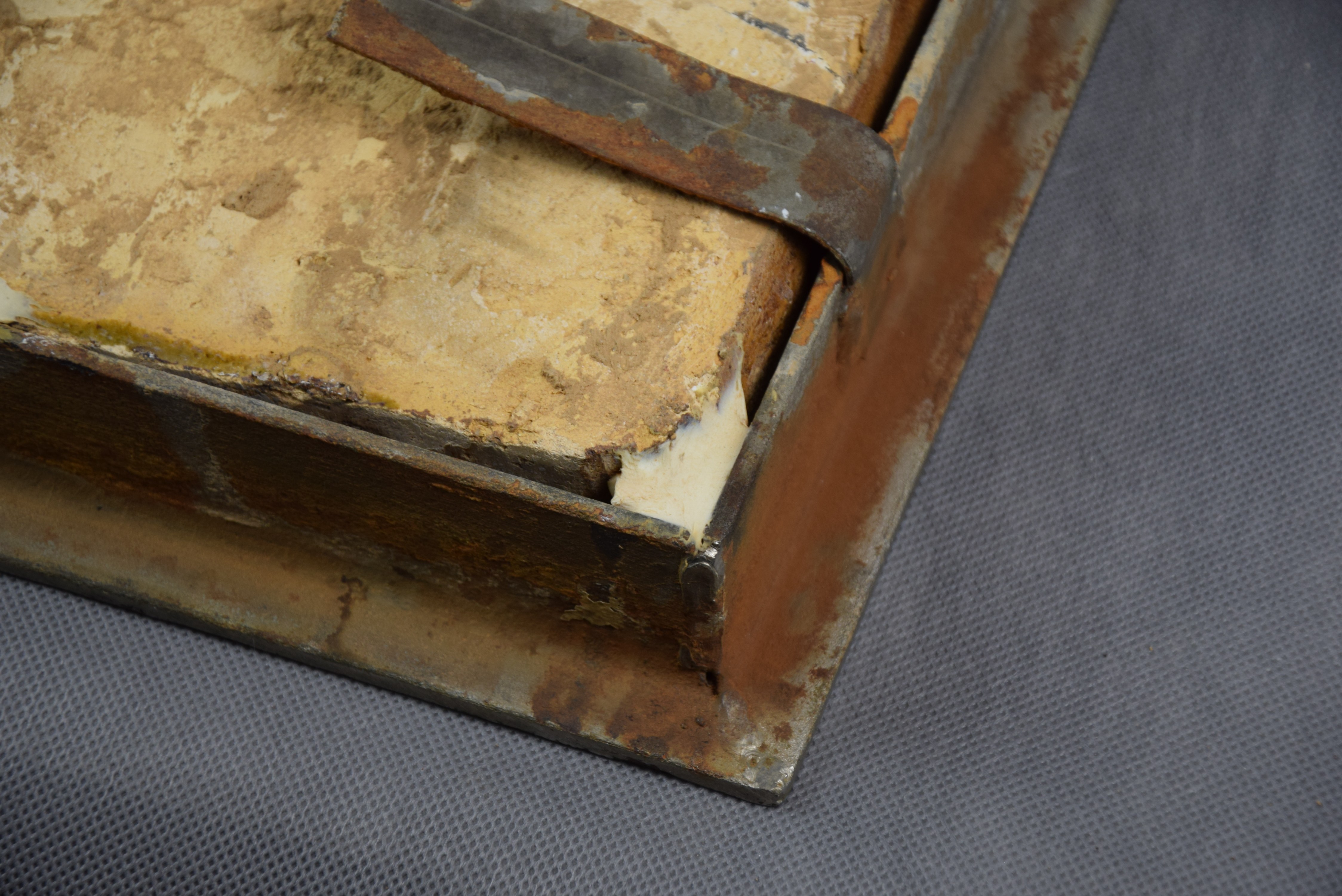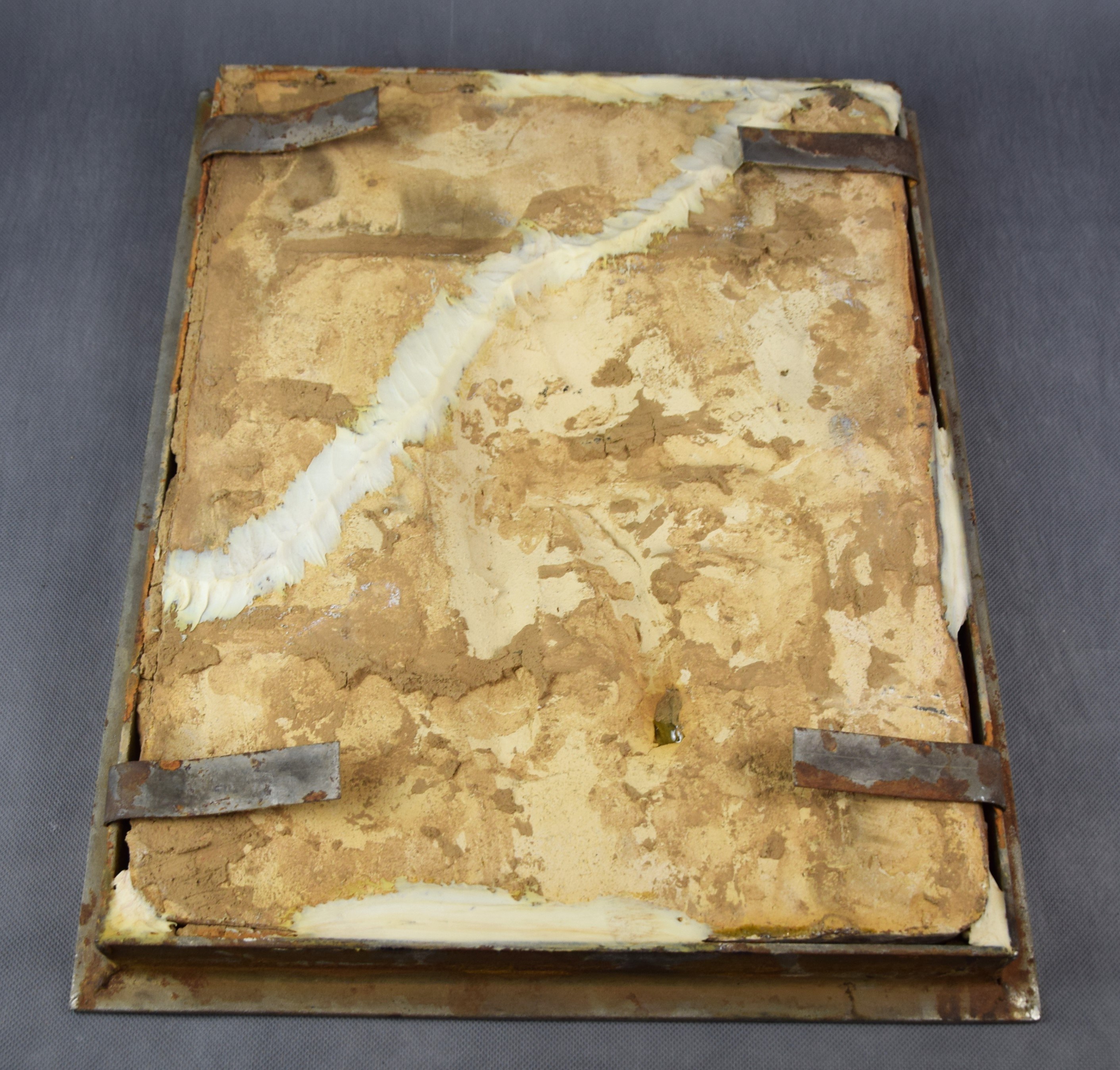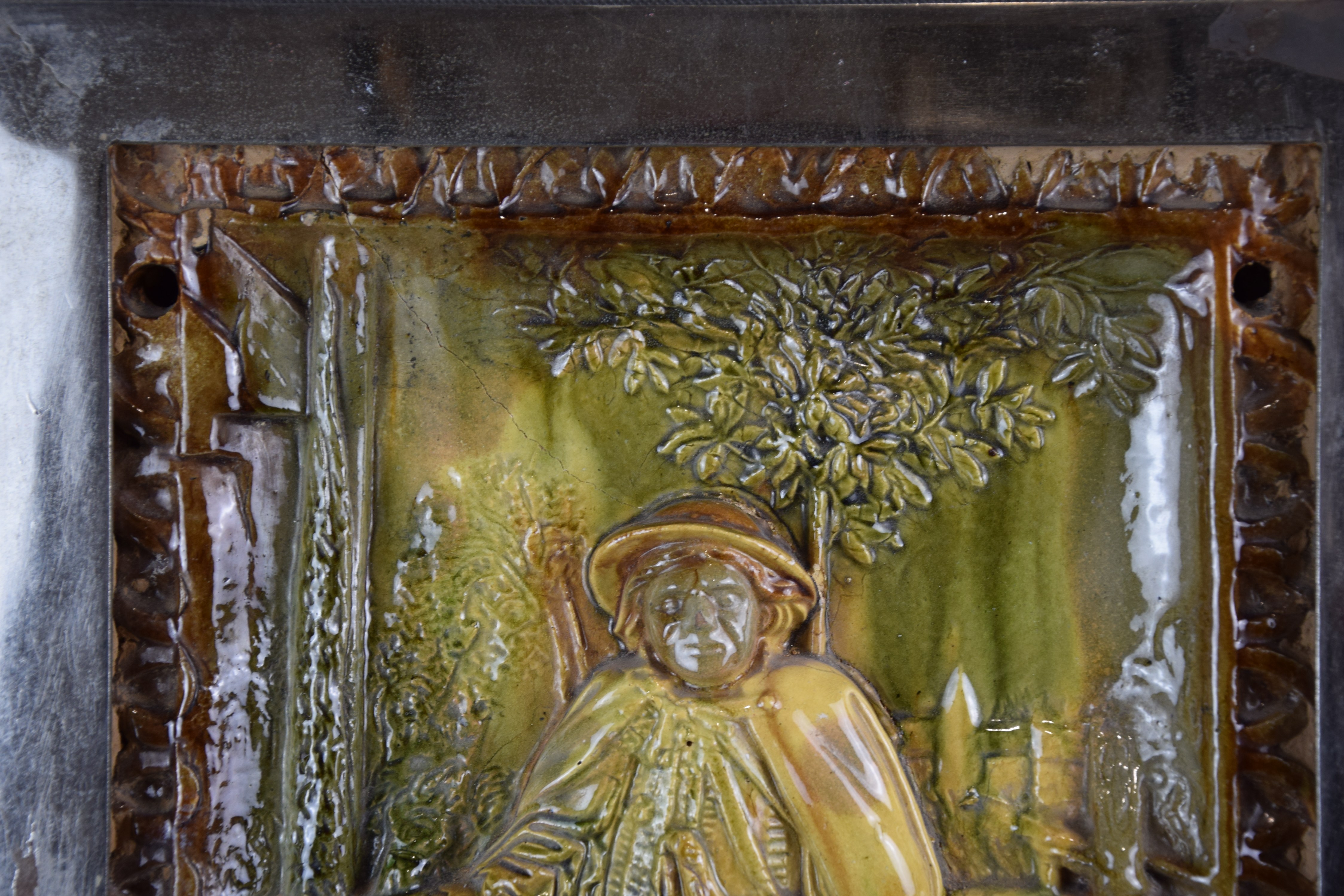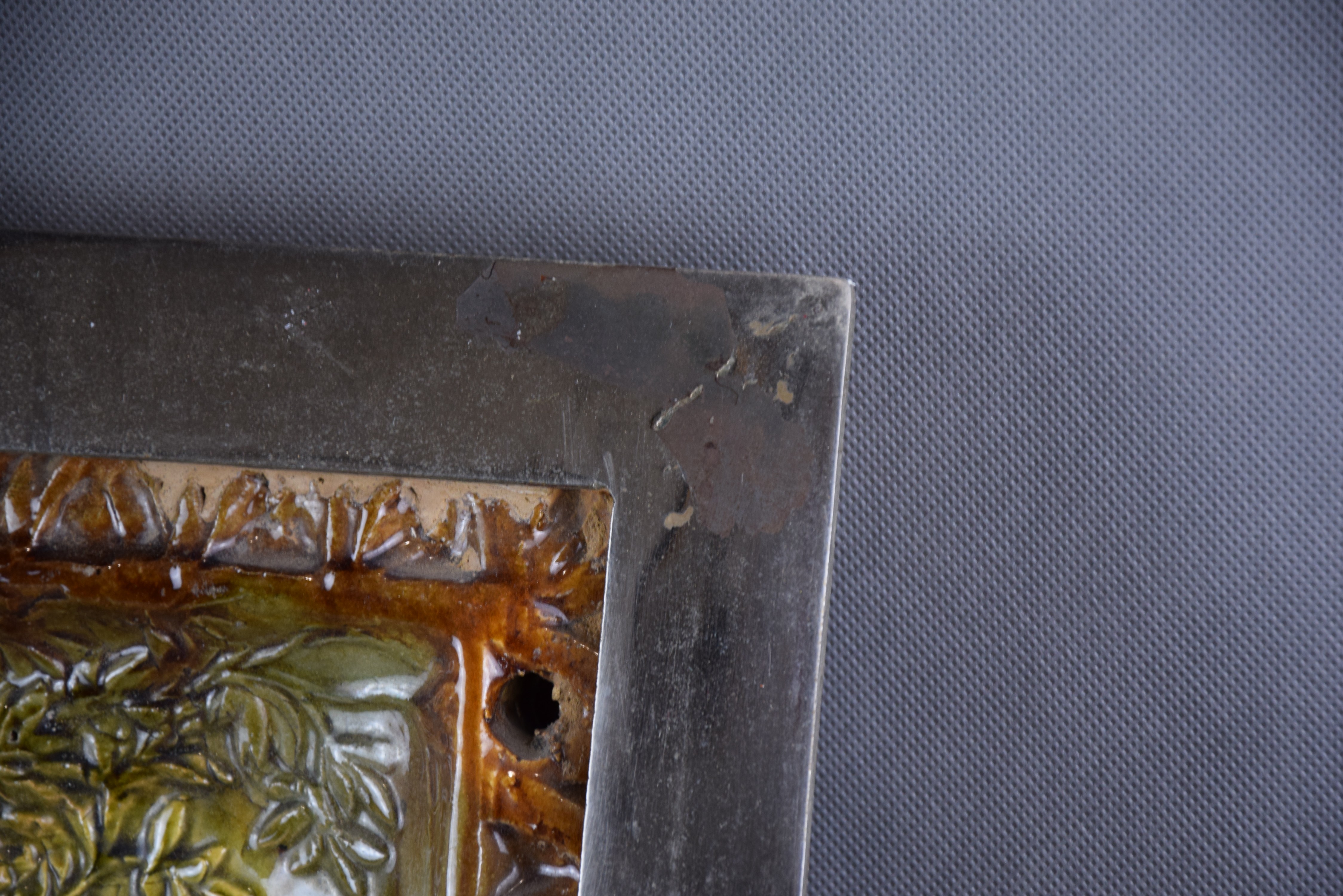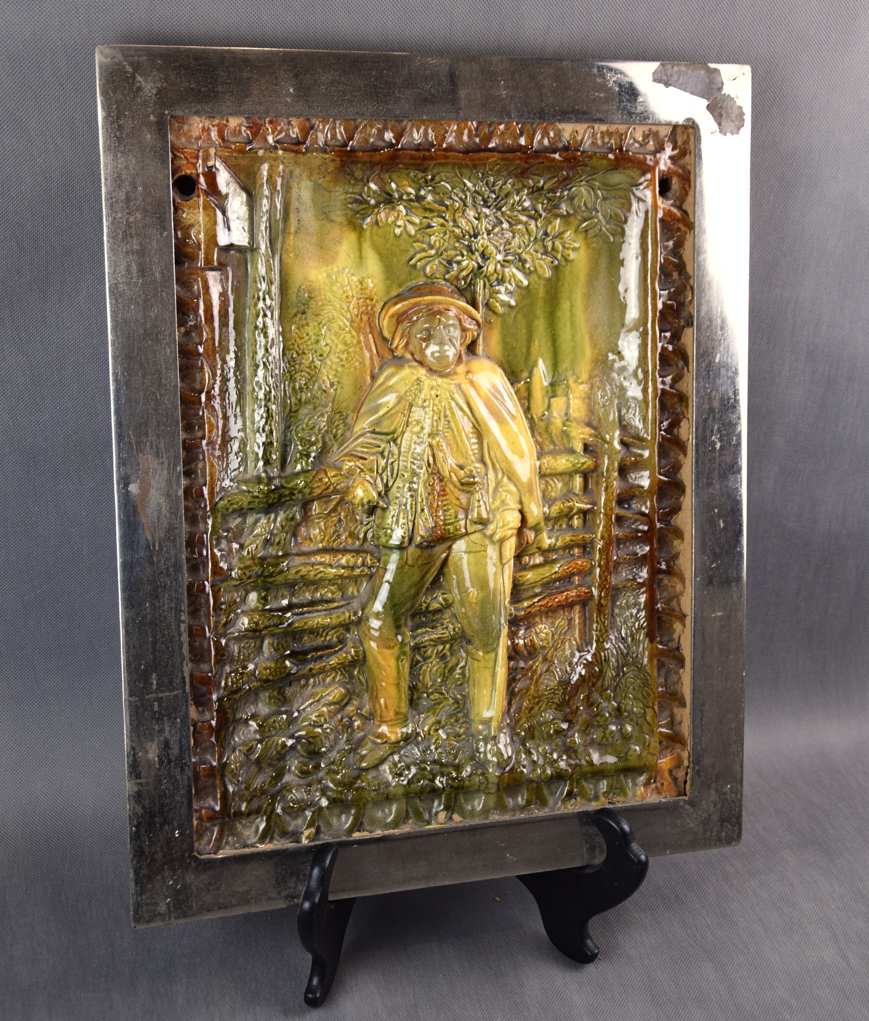 Ceramika szkliwiona. Oprawiona w żelazną chromowaną ramę.