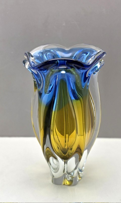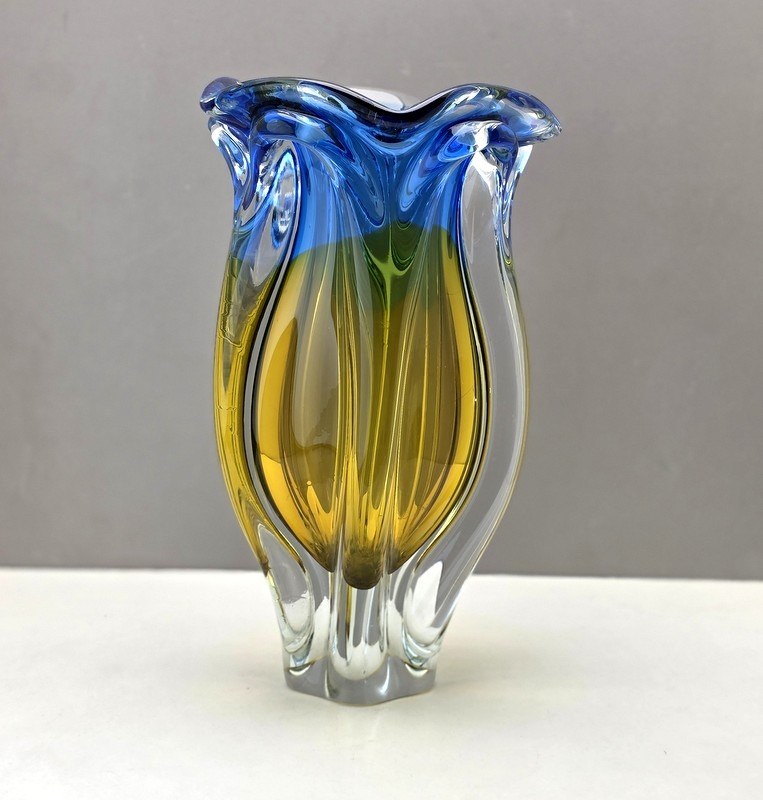 Szkło sodowe ręcznie formowane , barwione w masie w kolorze niebiesko żółtym