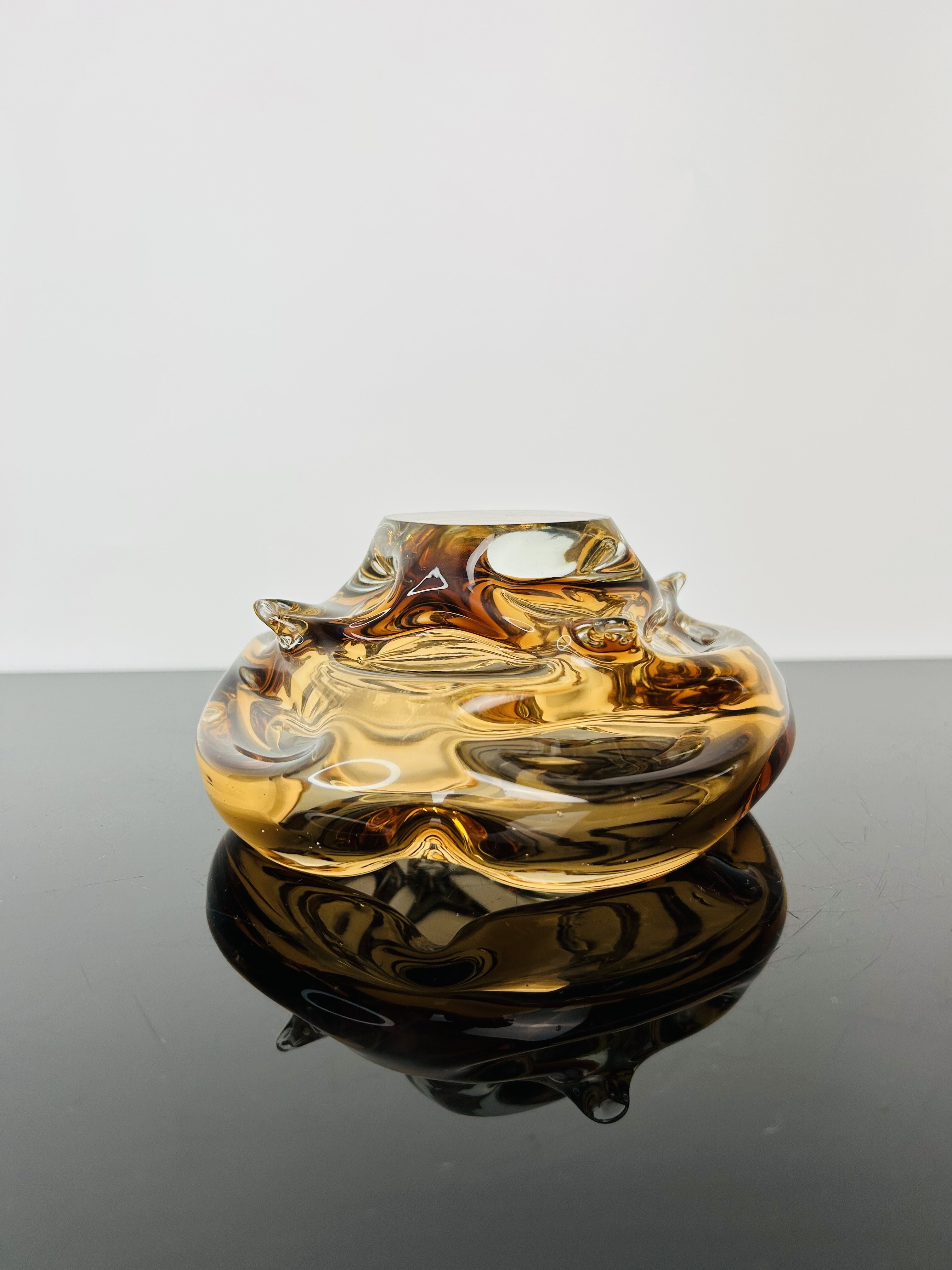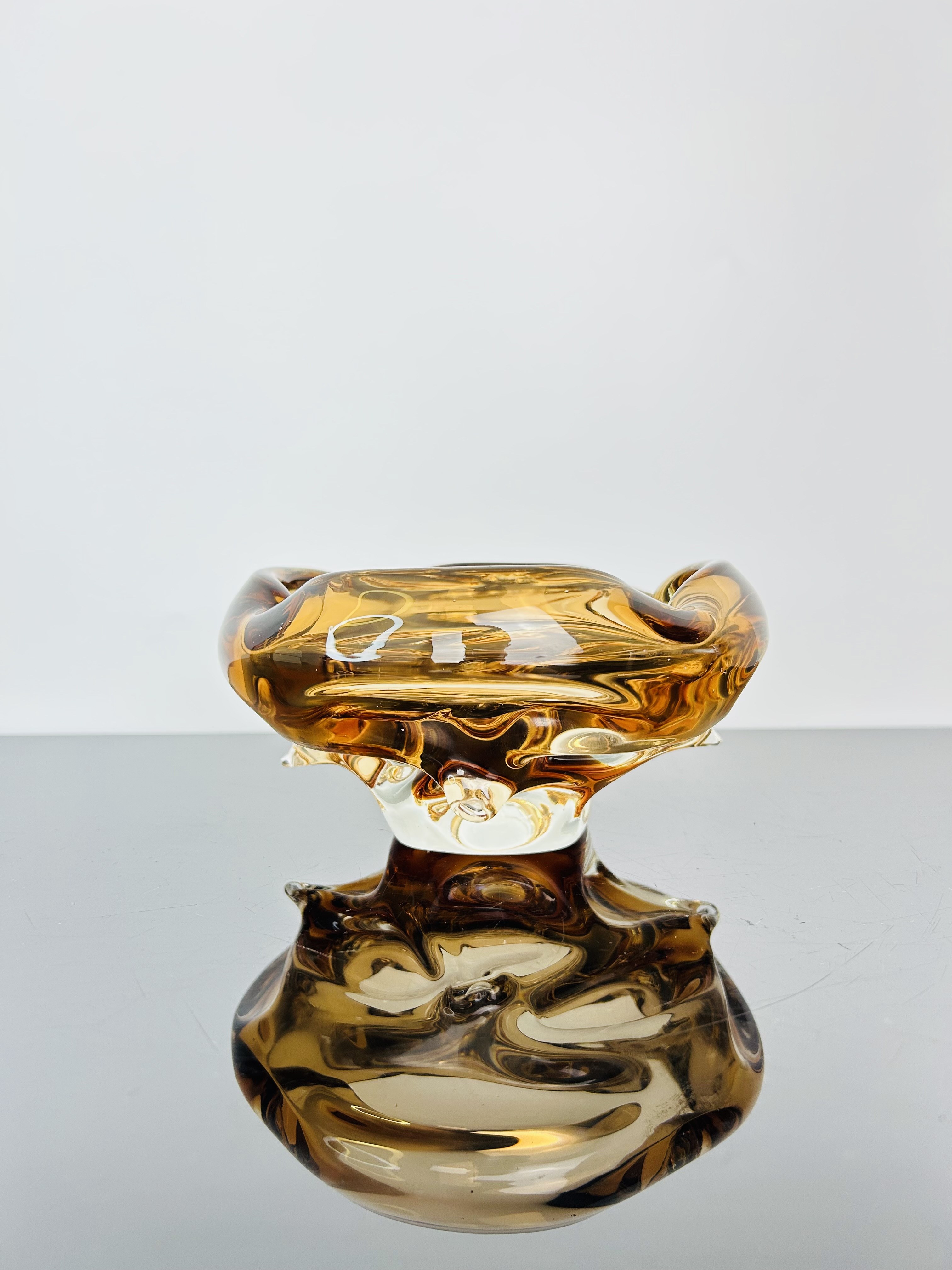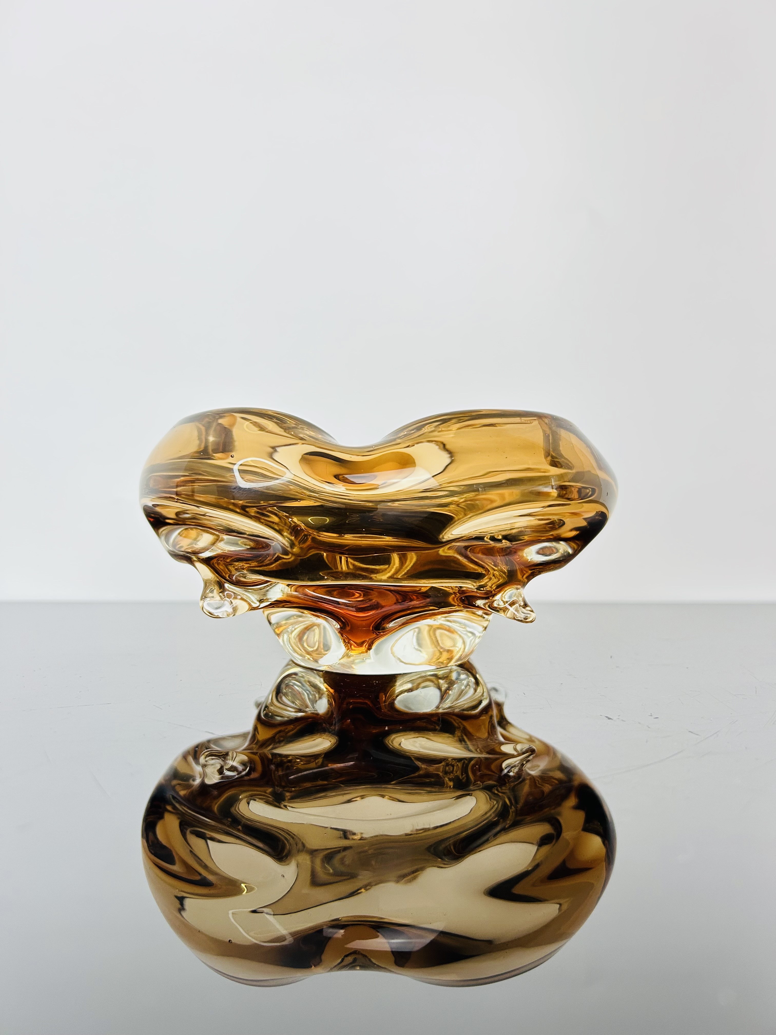 The rich amber tone enhances the elegant organic form, combining functionality with decorative appeal. Its heavy mass and harmonious proportions underline the craftsmanship and artistry of Bohemian hot-shaped glassmaking. Today, such pieces are highly sought after by collectors of Czech mid-century design and remain outstanding examples of Škrdlovice glass heritage.