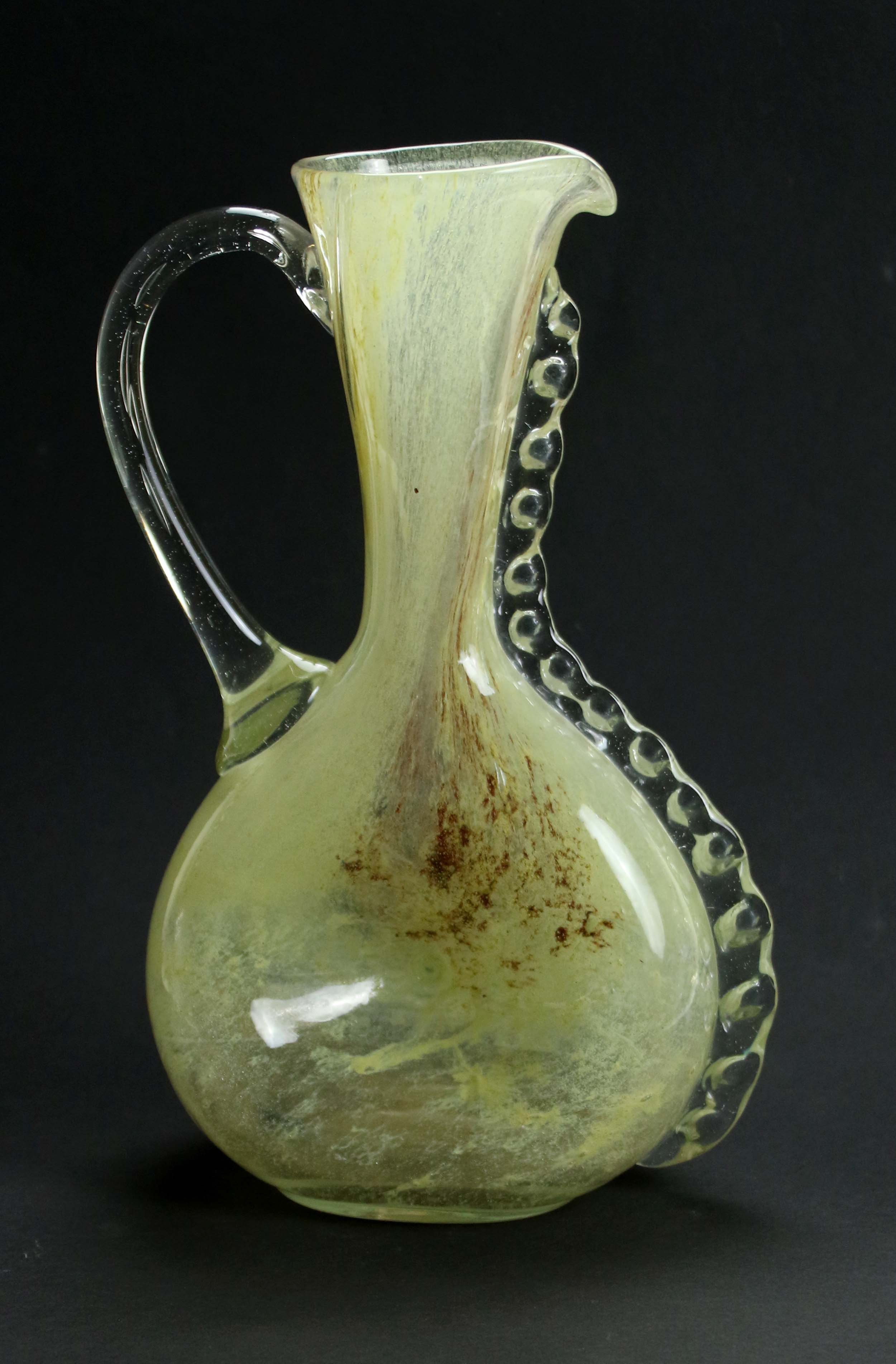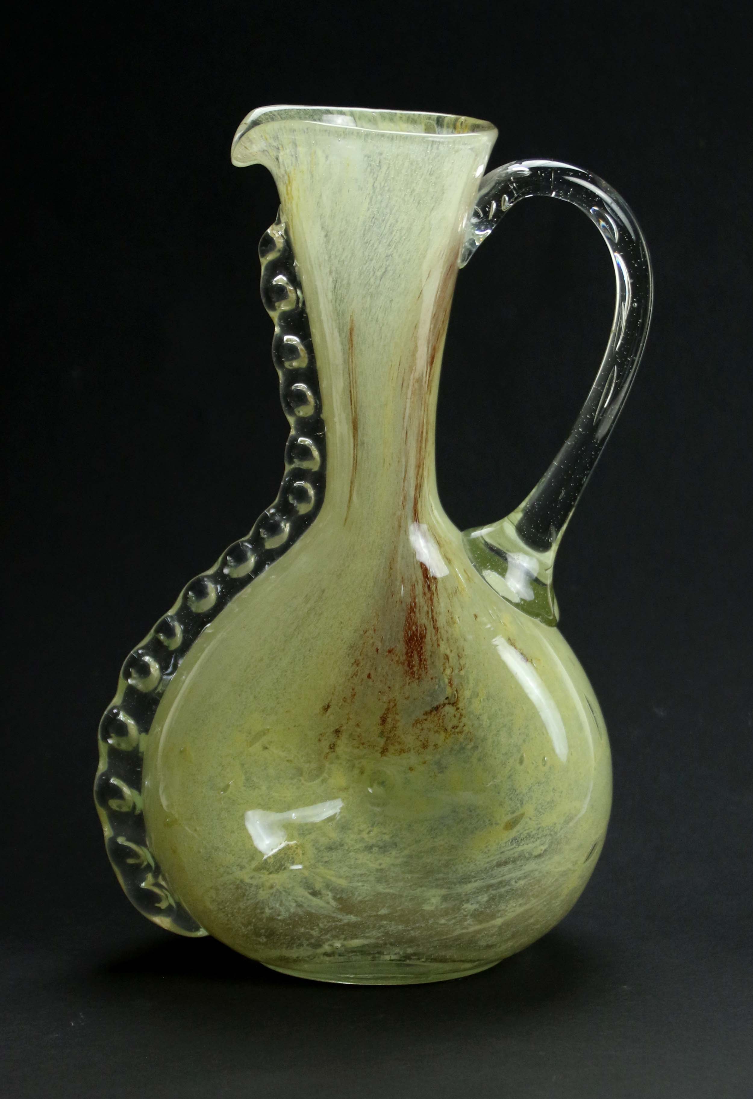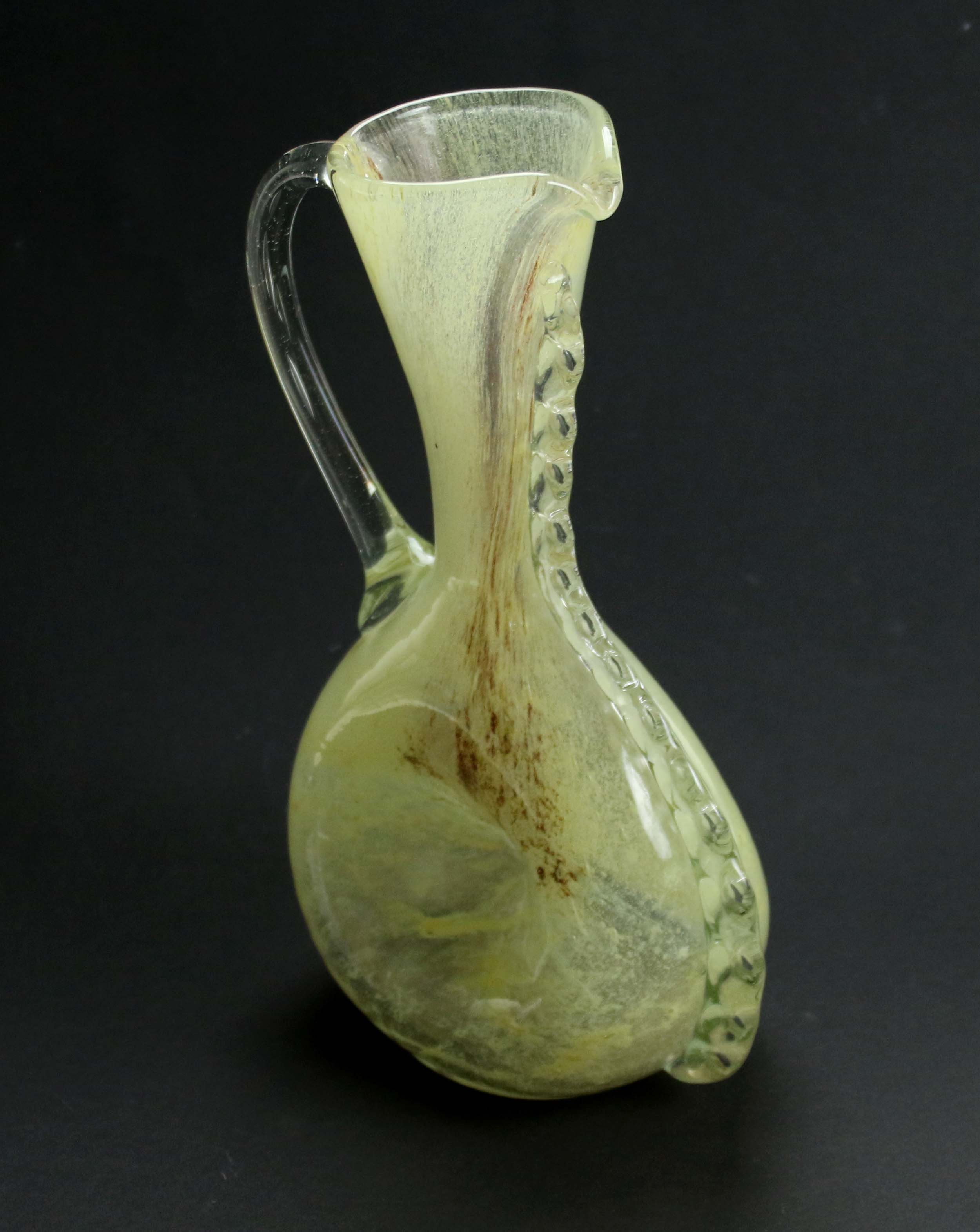 Szkło barwione w masie, ręcznie formowane. Wys. 24,5 cm, śred. (szer.) 15 cm.